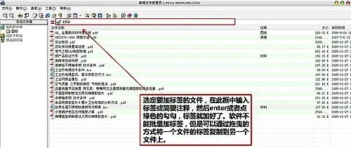 奥博文件管理员 的操作可能和大家的习惯不太一样,不要误认为上面的框是搜索框~这是标签编辑框,类似 Excel。给文件加标签的时候,选定文件,在上面的框中输入 “标签”或者”注释”,确认。上图是给文件加好标签后的样子3、按标签搜索