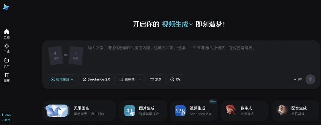 网页版或APP都行。进入创作界面,选“视频生成”,在模型选项里一定要选即梦Seedance 2.0。这是目前最好用的版本。