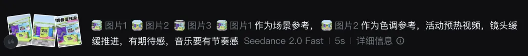 我上传了两张活动场地的实拍图,一张活动海报,写了句提示词:“@图1作为场景参考,@图2作为色调参考,活动预热视频,镜头缓缓推进,有期待感,音乐要有节奏感,结尾出现活动时间和地点。”