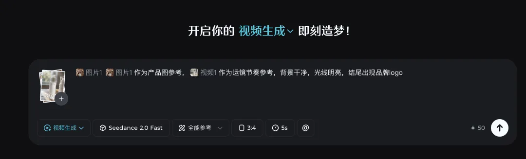 提示词怎么写?一个公式:“@图1作为什么参考,@视频1作为什么参考,+具体描述”。比如:“@图1作为产品图参考,@视频1作为运镜节奏参考,产品旋转展示,背景干净,光线明亮,结尾出现品牌logo”。