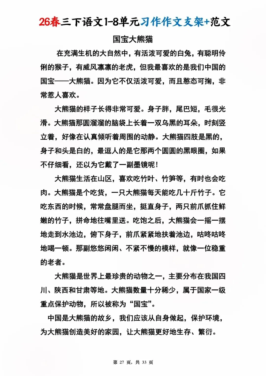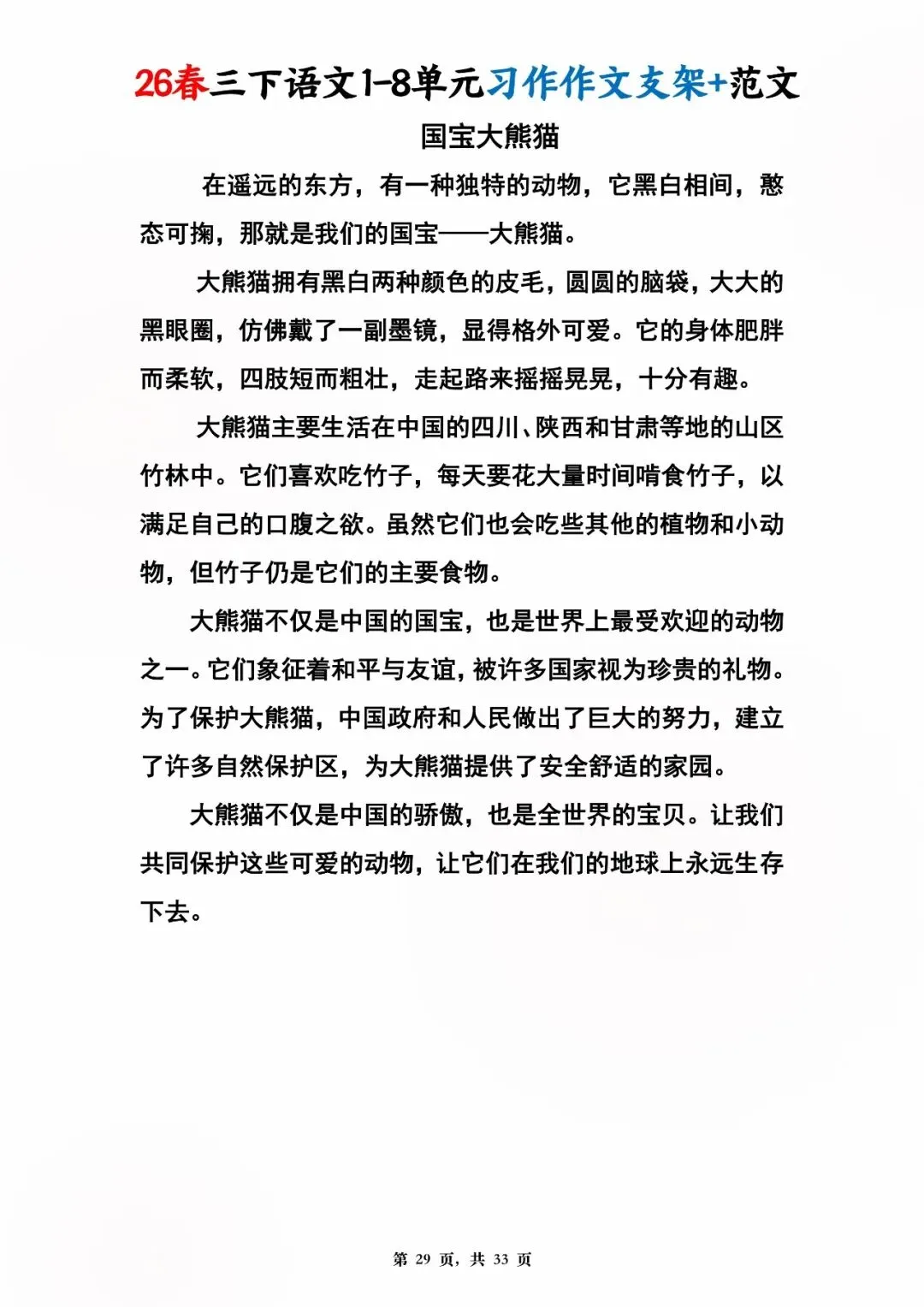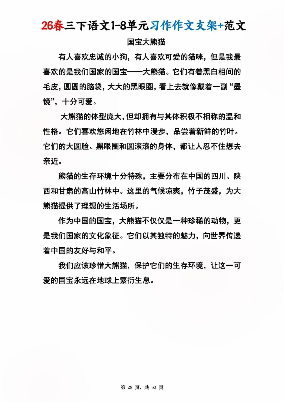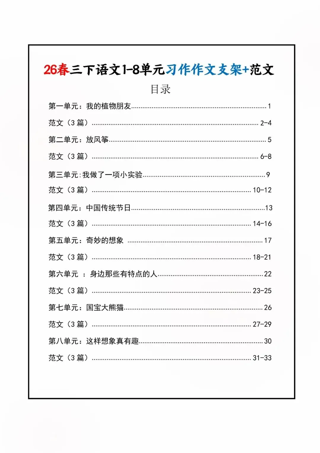26年春人教版三年级下册语文1-8单元同步写作范文,共33页,电子版可下载,这份三下语文单元习作范文,包含了我的植物朋友、我做了一项小实验、中华传统节日、奇妙的想象、国宝大熊猫等单元的作文支架及优秀习作范文,帮助孩子启发写作思路,再也不会为三年级下册的写作内容犯愁了。教育不是填鸭,而是给方法、给支架、给信心!#三年级语文 #单元习作 #作文范文 #小学写作 #人教版语文 #家长收藏 #学习资料