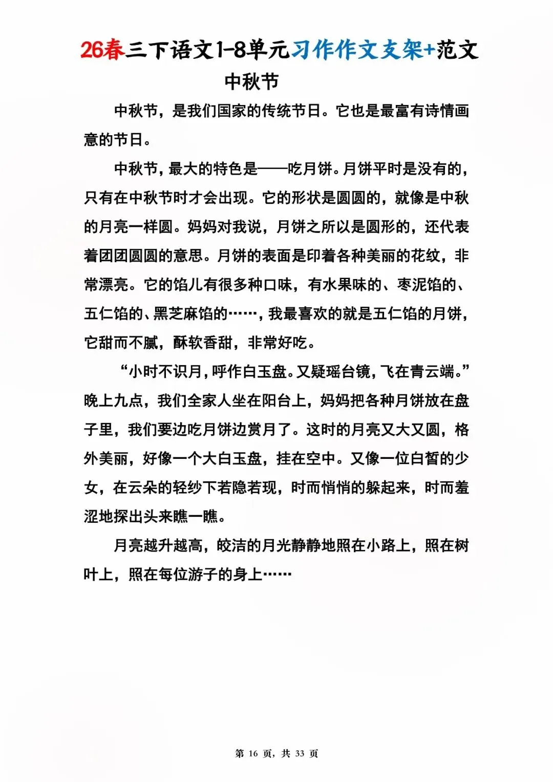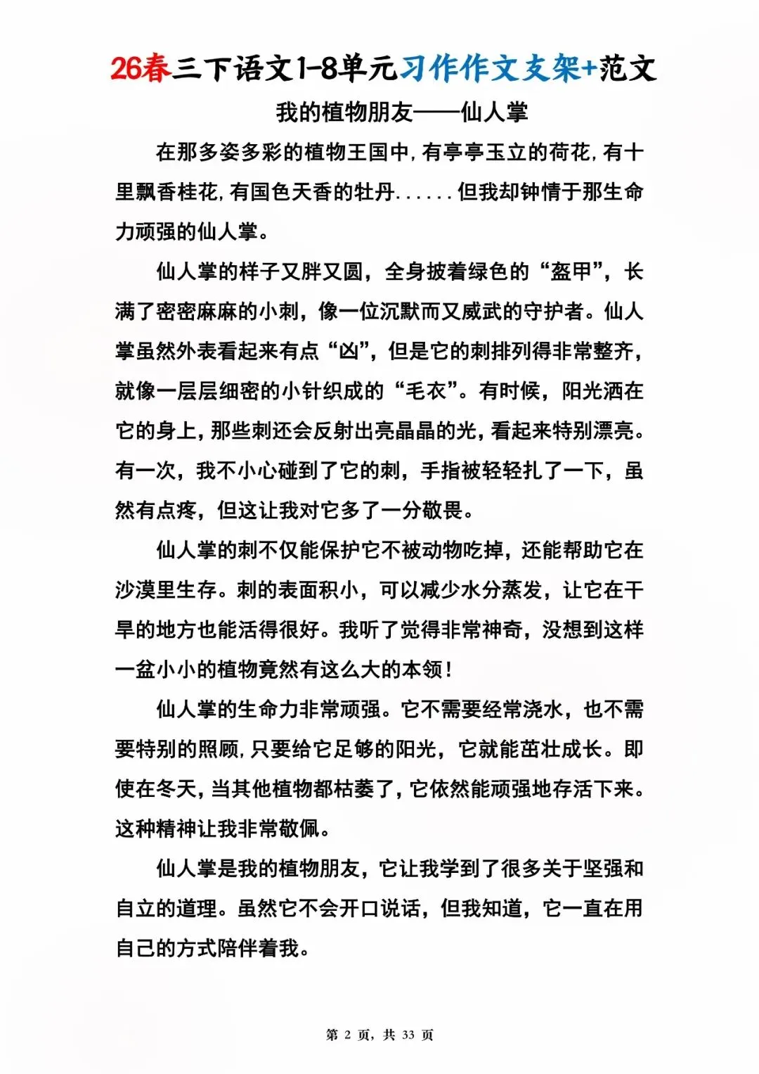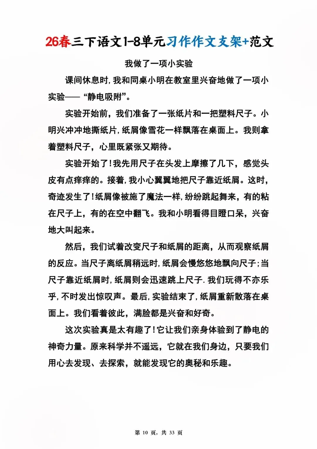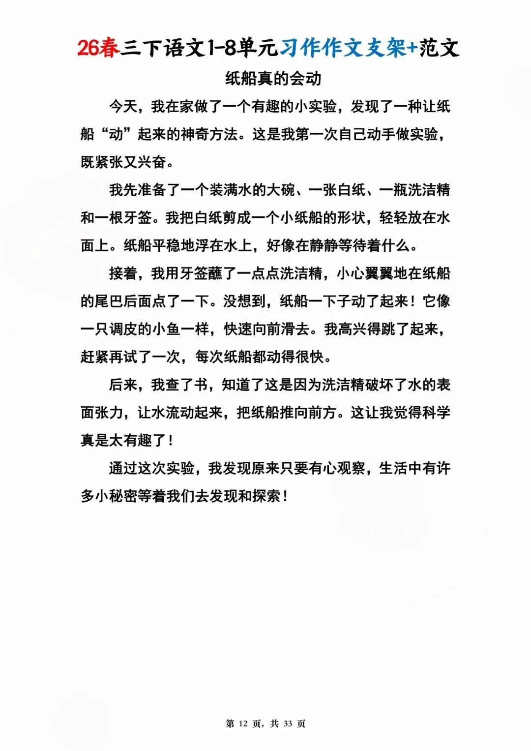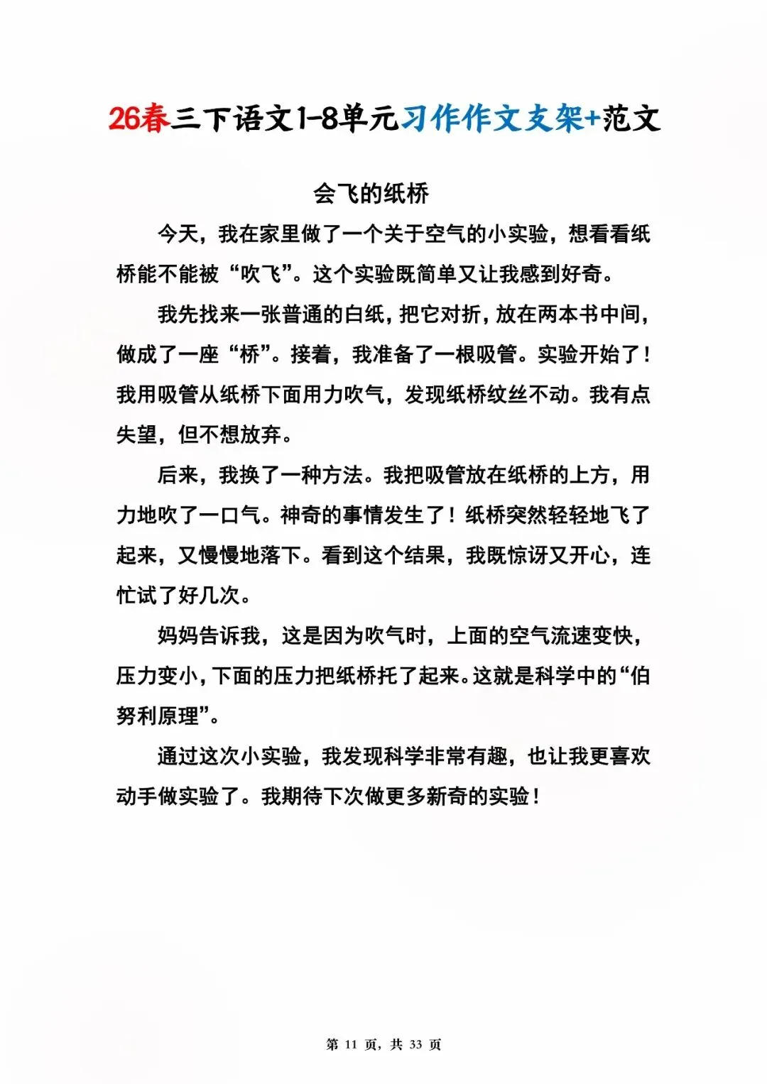 26年春人教版三年级下册语文1-8单元同步写作范文,共33页,电子版可下载,这份三下语文单元习作范文,包含了我的植物朋友、我做了一项小实验、中华传统节日、奇妙的想象、国宝大熊猫等单元的作文支架及优秀习作范文,帮助孩子启发写作思路,再也不会为三年级下册的写作内容犯愁了。教育不是填鸭,而是给方法、给支架、给信心!#三年级语文 #单元习作 #作文范文 #小学写作 #人教版语文 #家长收藏 #学习资料