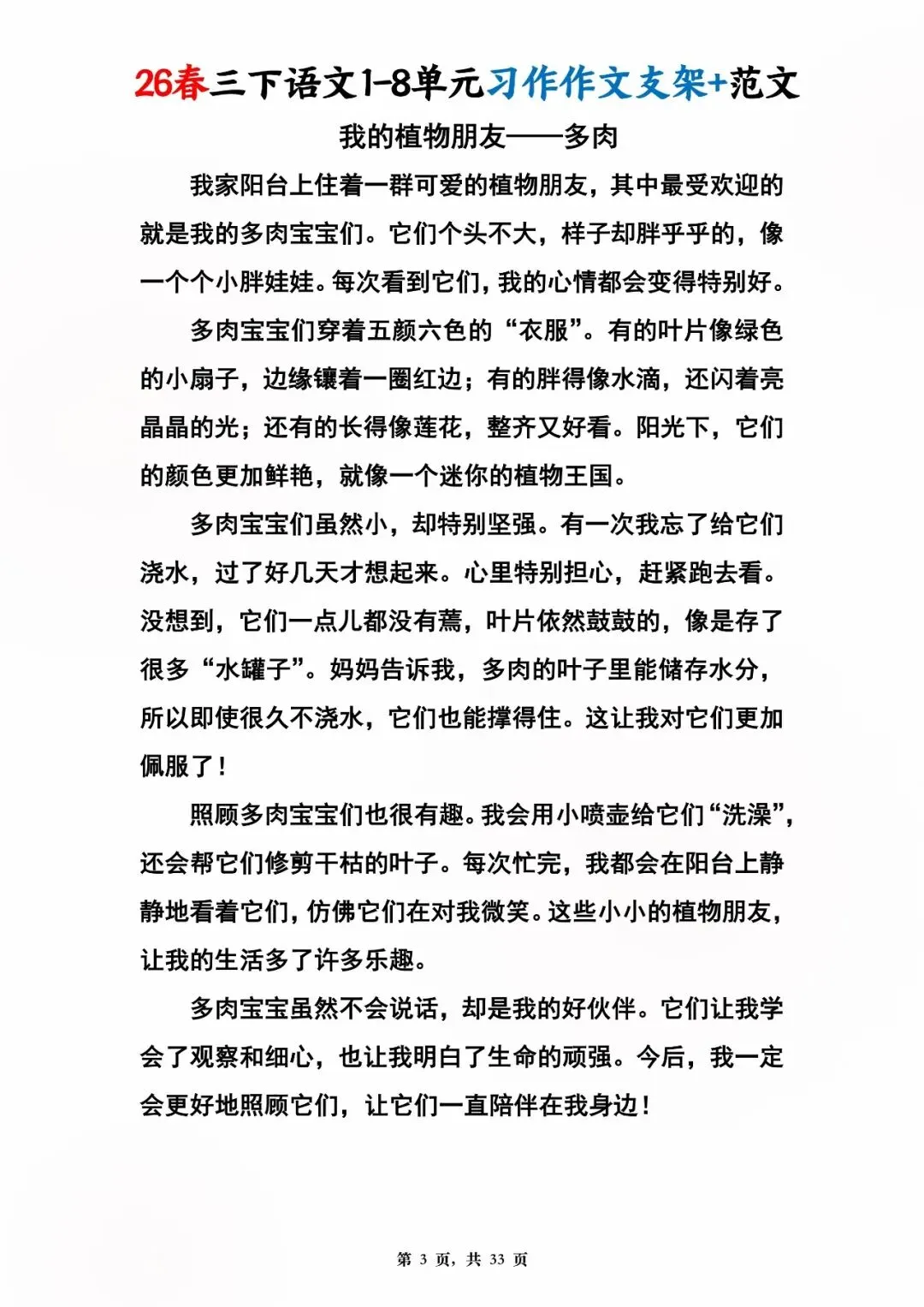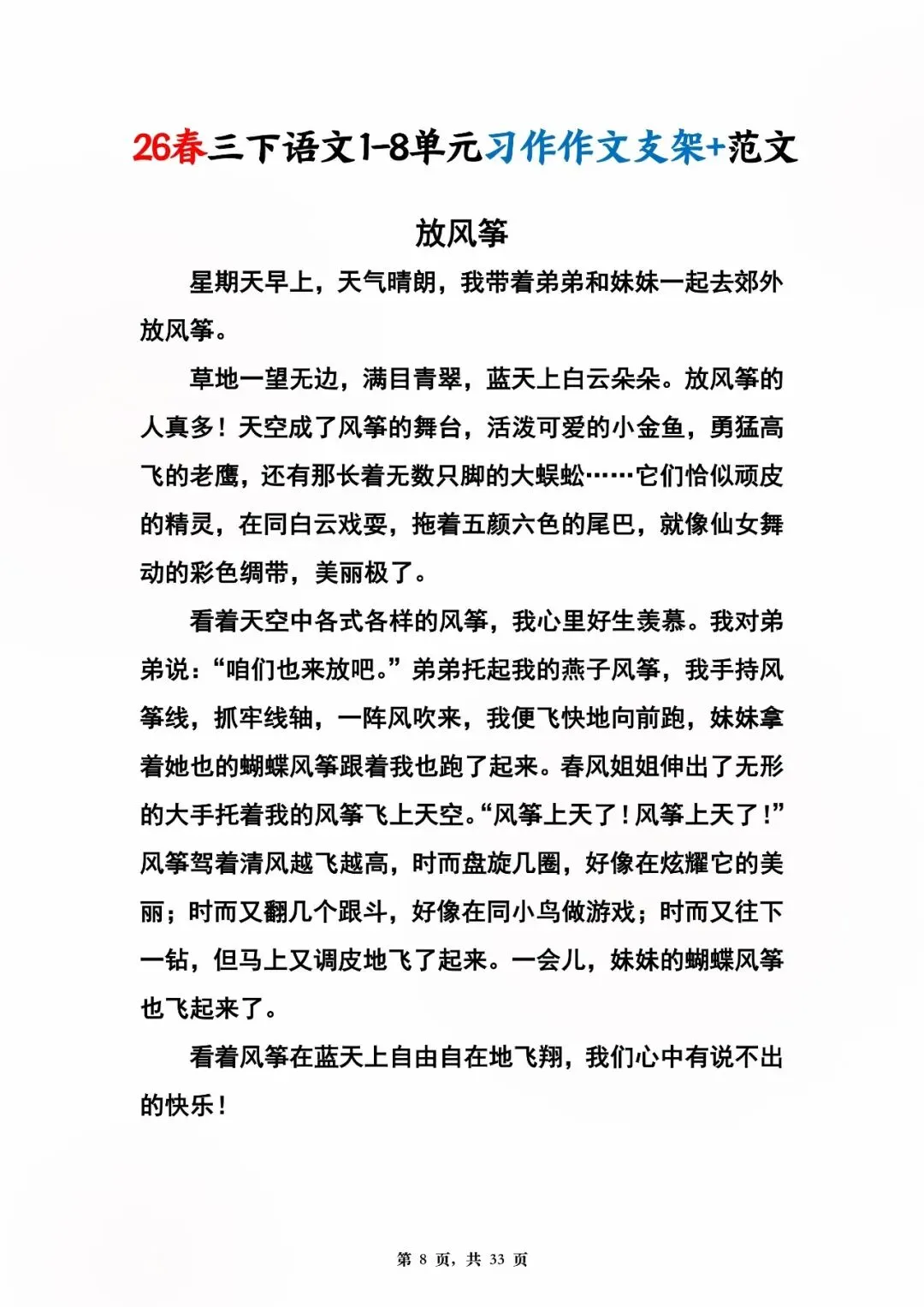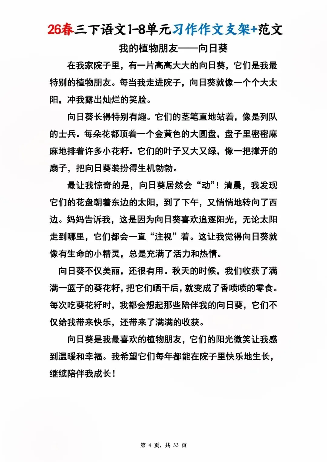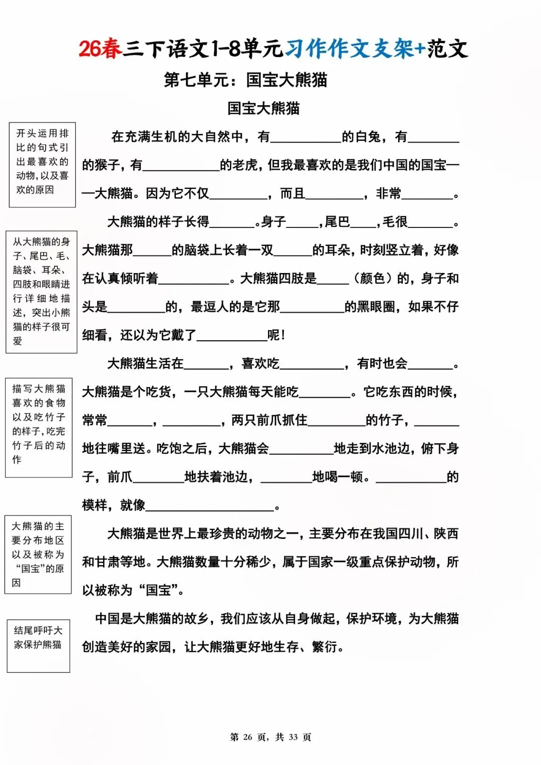 26年春版三年级下册语文1-8单元同步写作范文,电子版可打印可下载