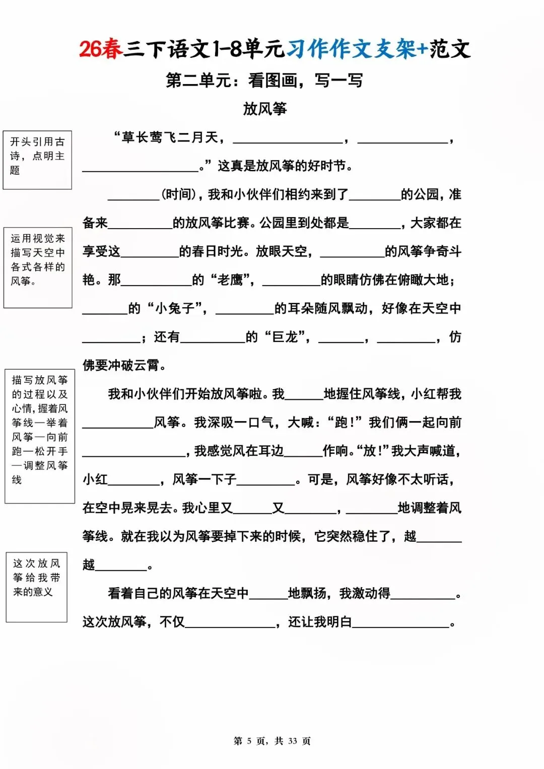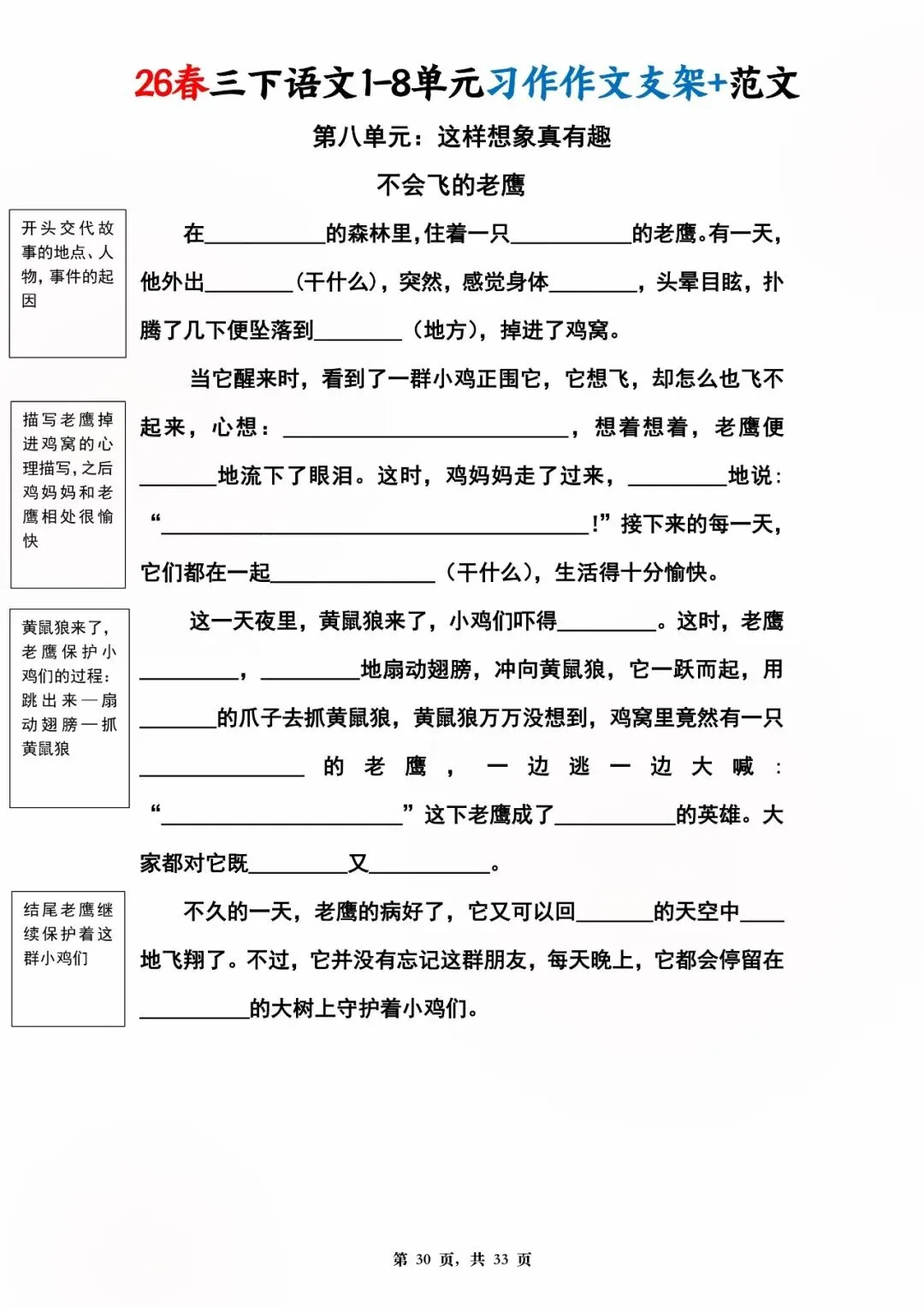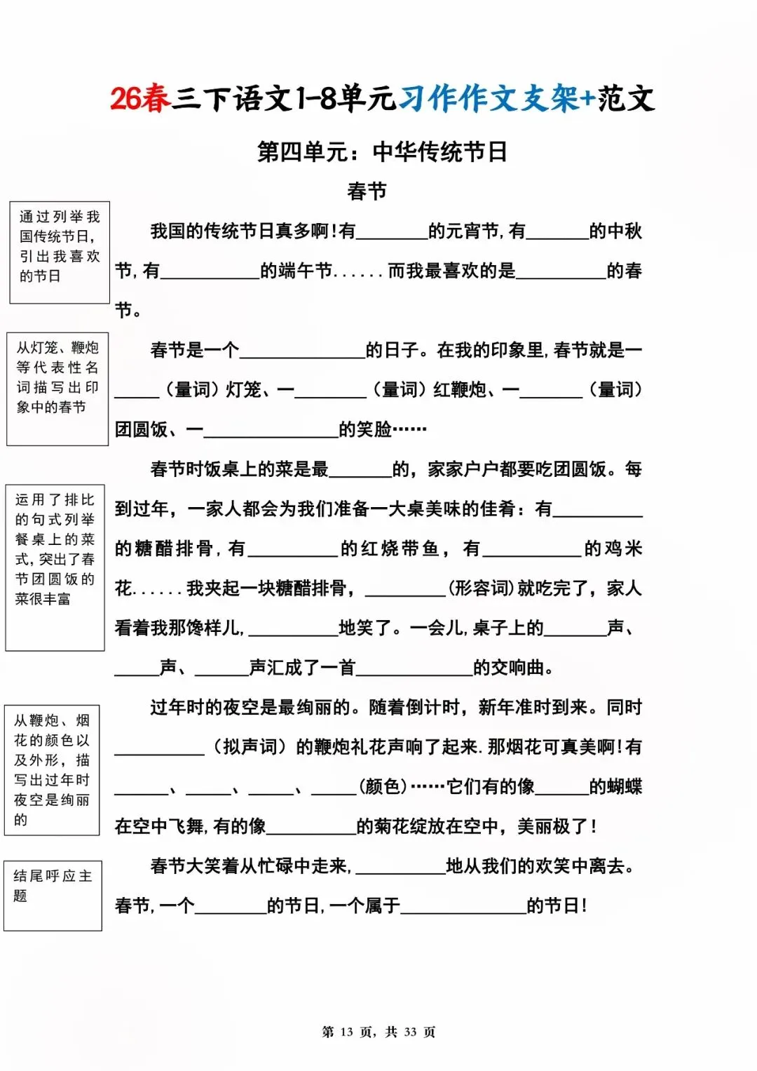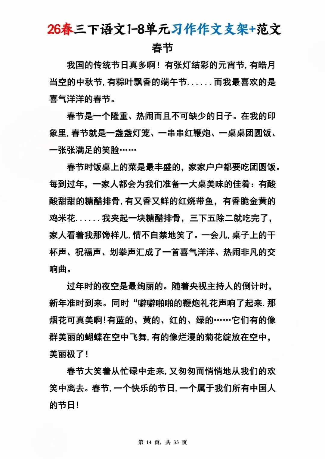 26年春版三年级下册语文1-8单元同步写作范文,电子版可打印可下载