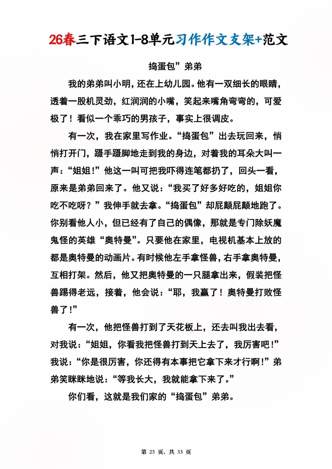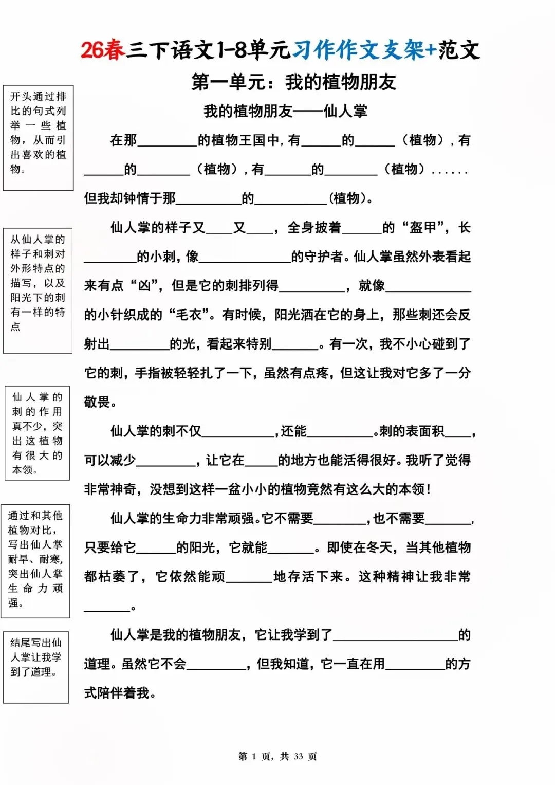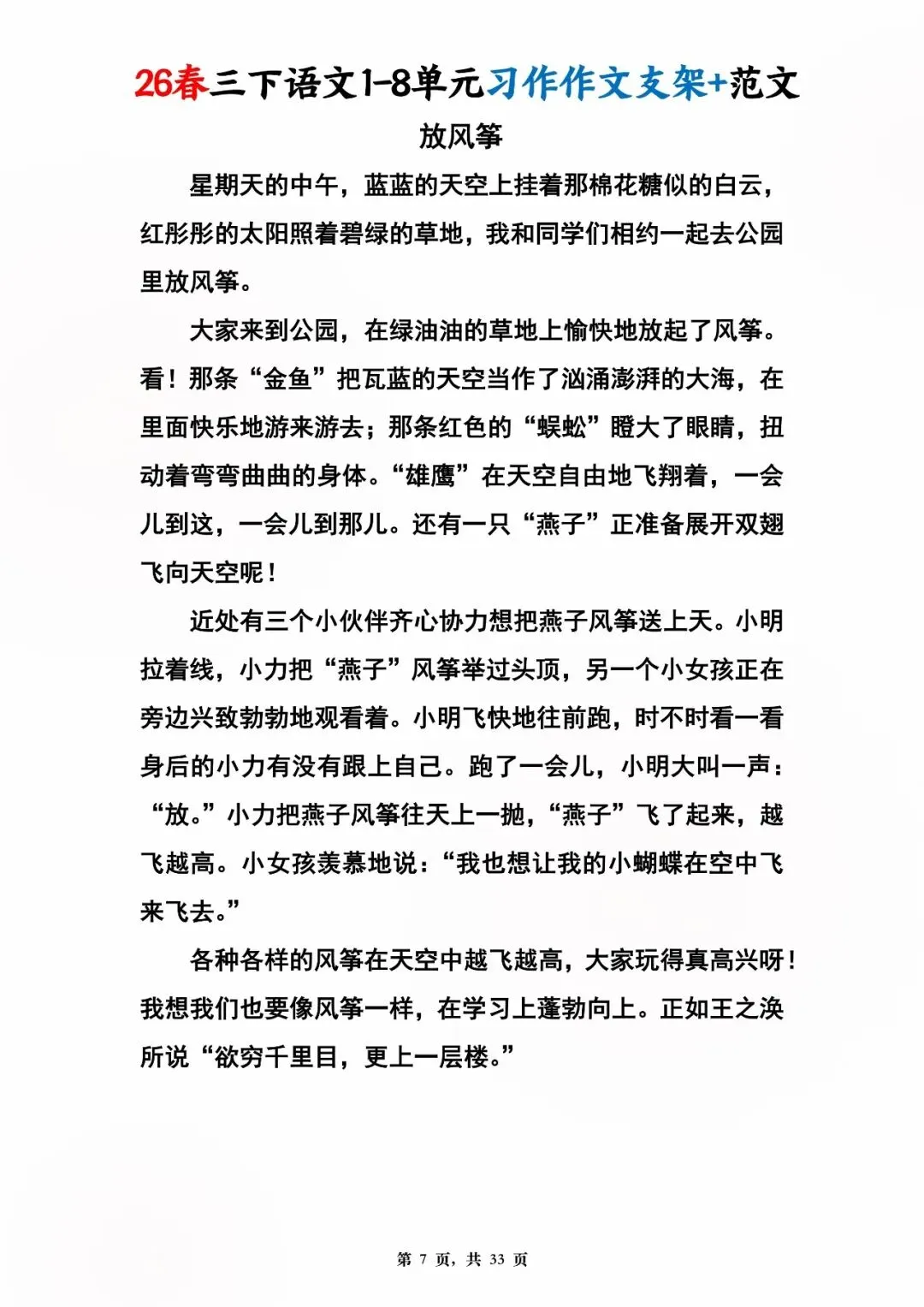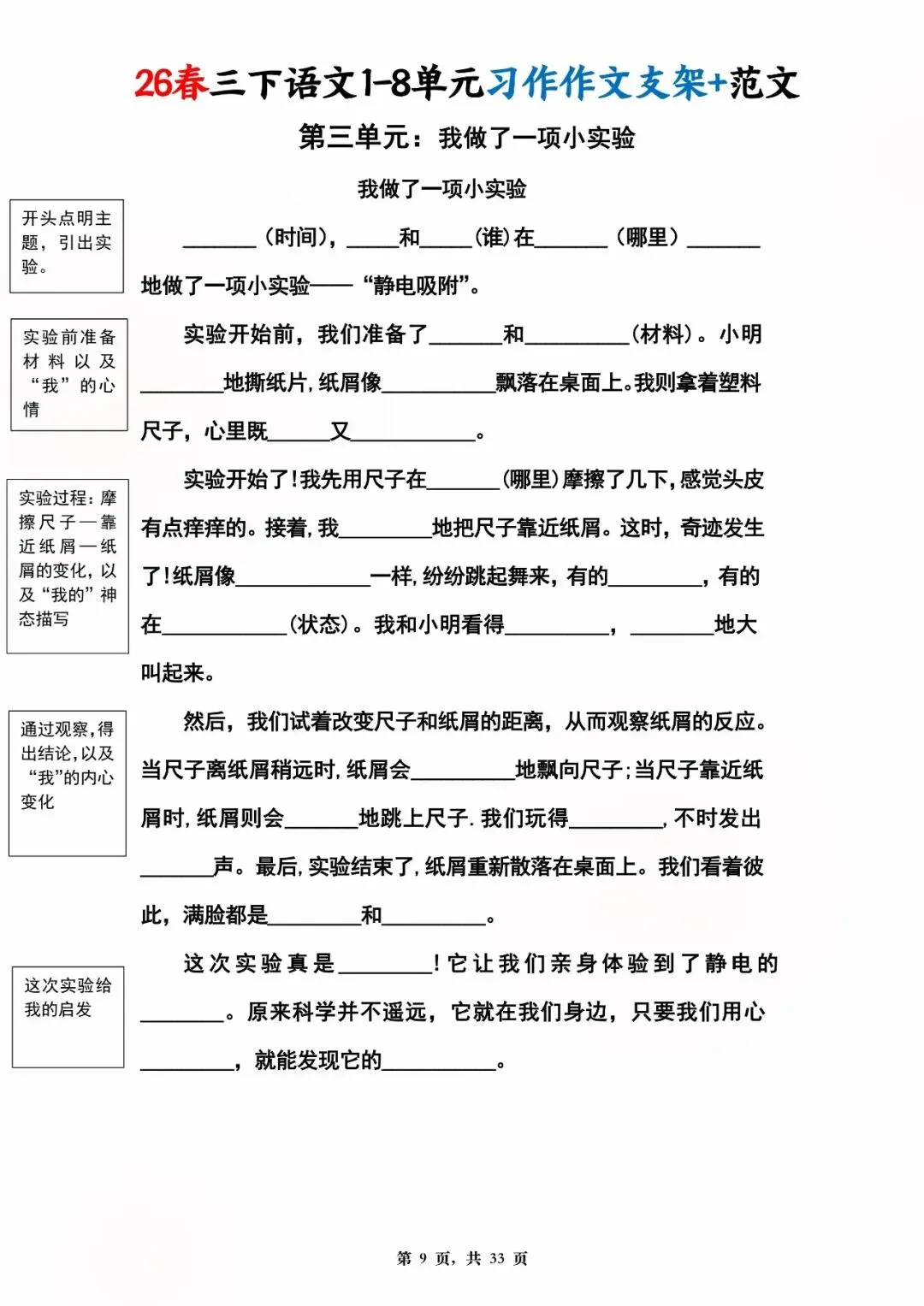 26年春版三年级下册语文1-8单元同步写作范文,电子版可打印可下载