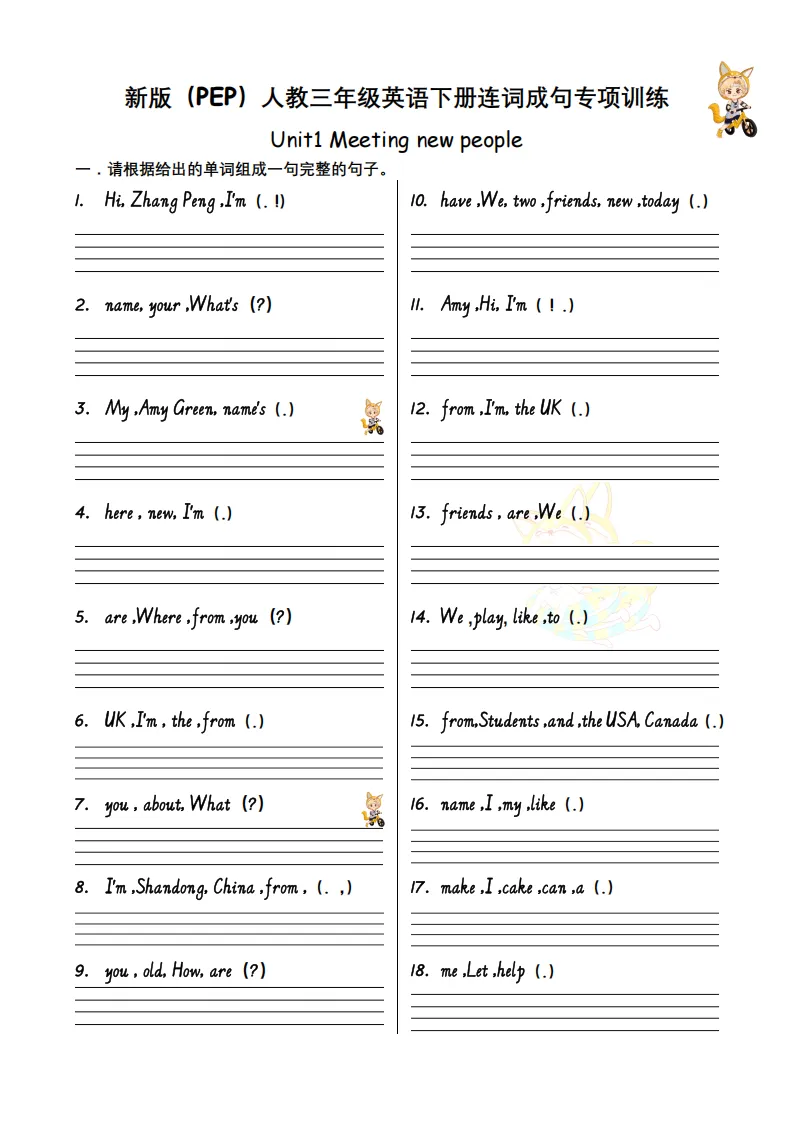 2026春三年级(下)英语人教PEP版英语U1-U6 连词成句专项训练-12页全套可打印
