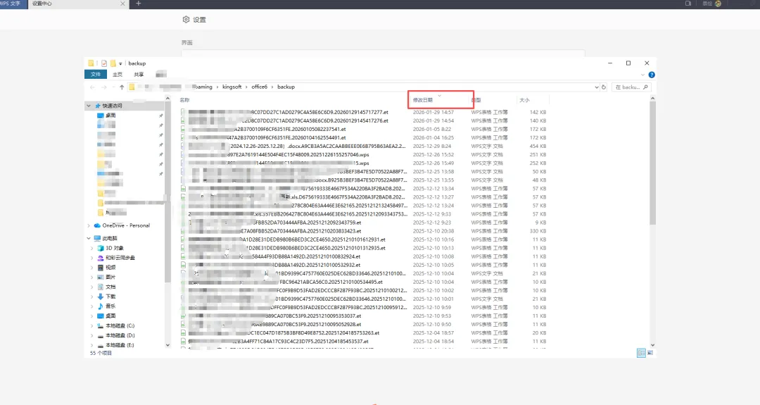 在弹出的备份文件夹内点几下按修改时间排序,接下来就可以按照最新时间点开文件看看您之前编辑的文件是否完整。