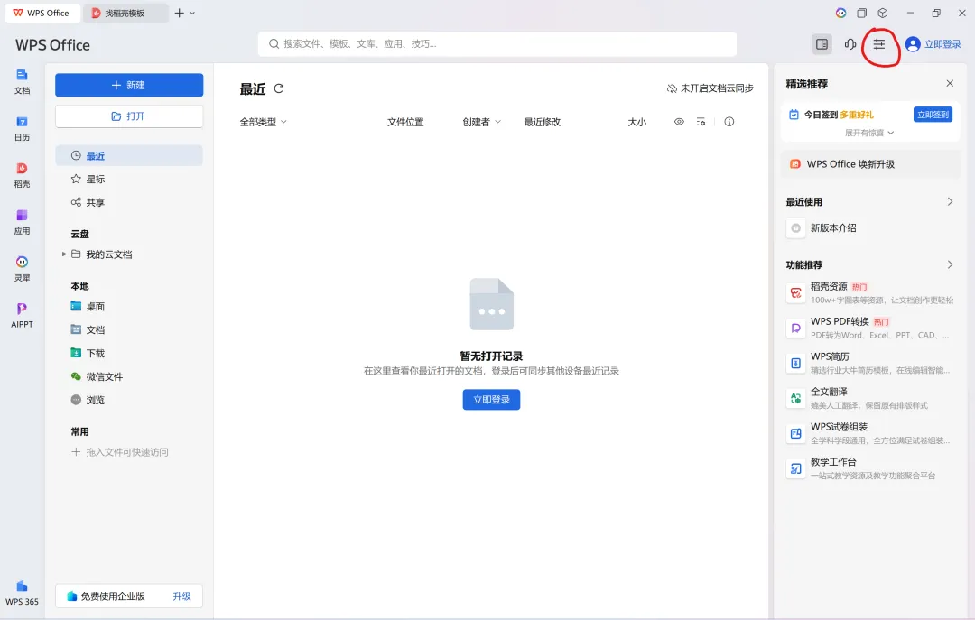 专业版的用户如图随意打开红框内种的一个wps文字、或者表格、演示(个人版的在文章结尾处有图表示例)