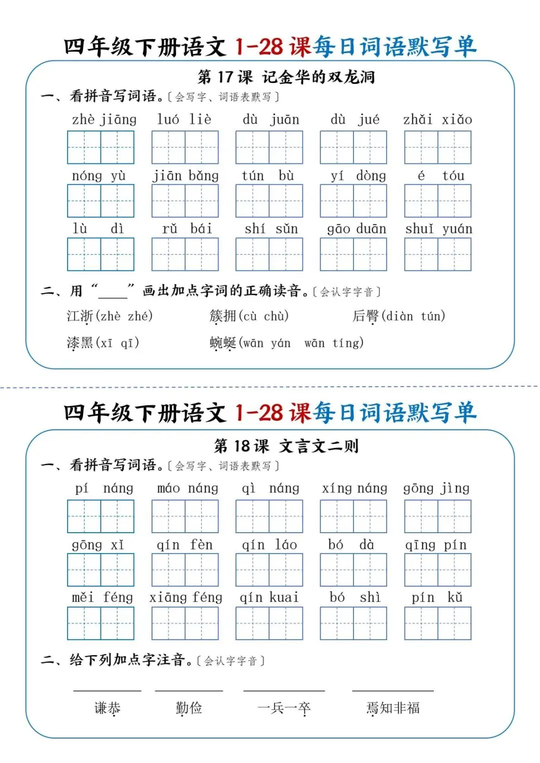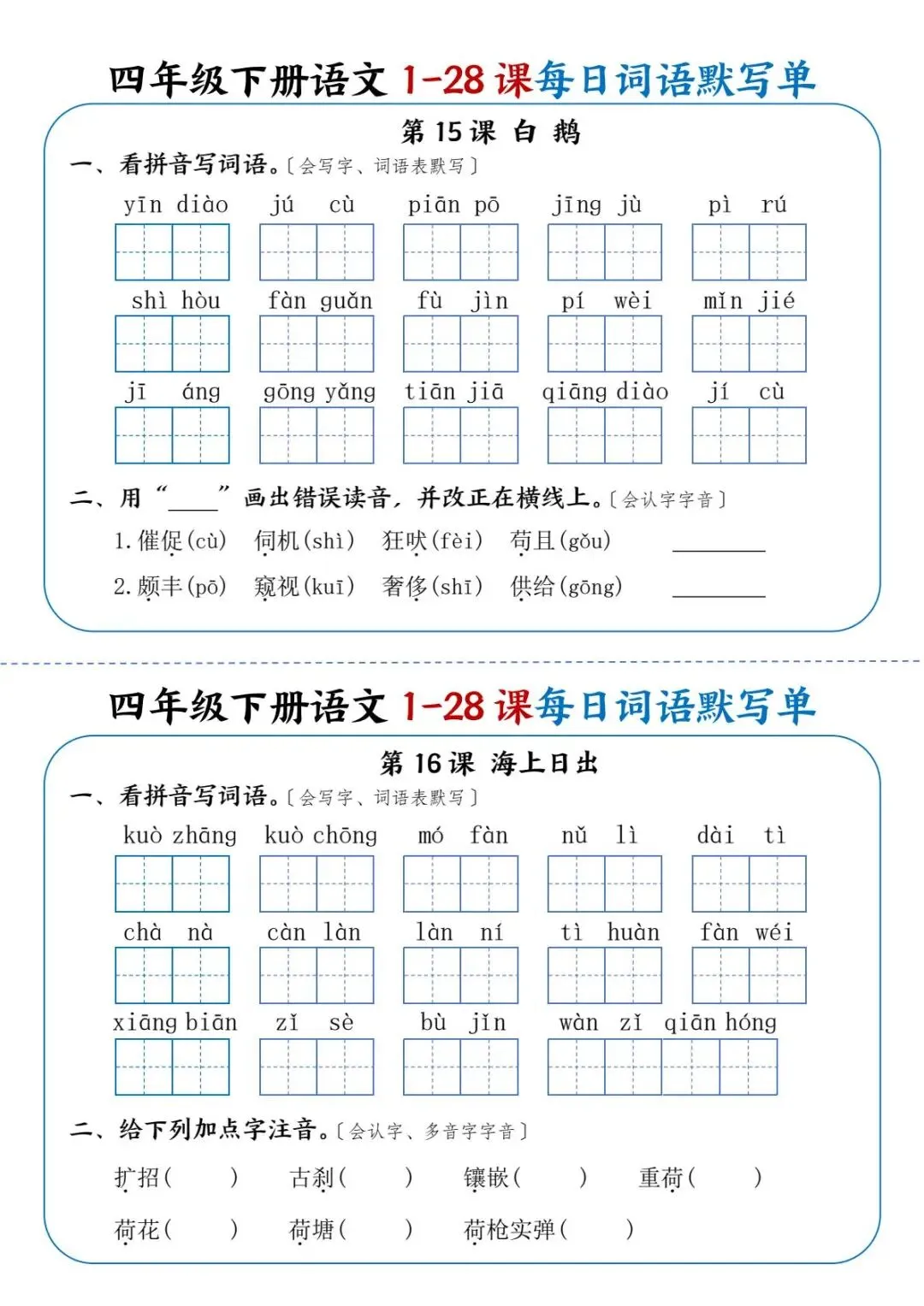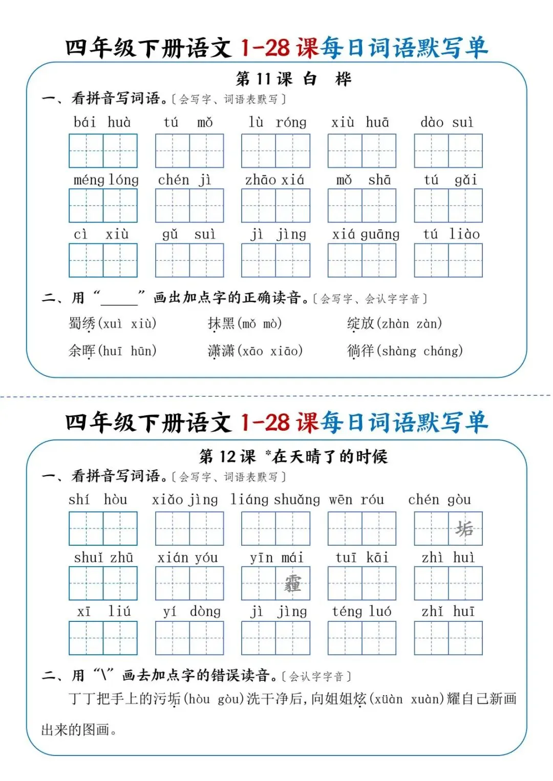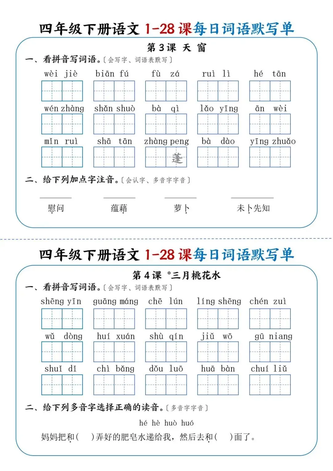 26年春四年级下册语文《每日词语默写单》电子版可打印