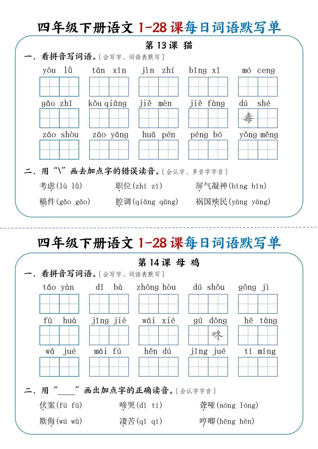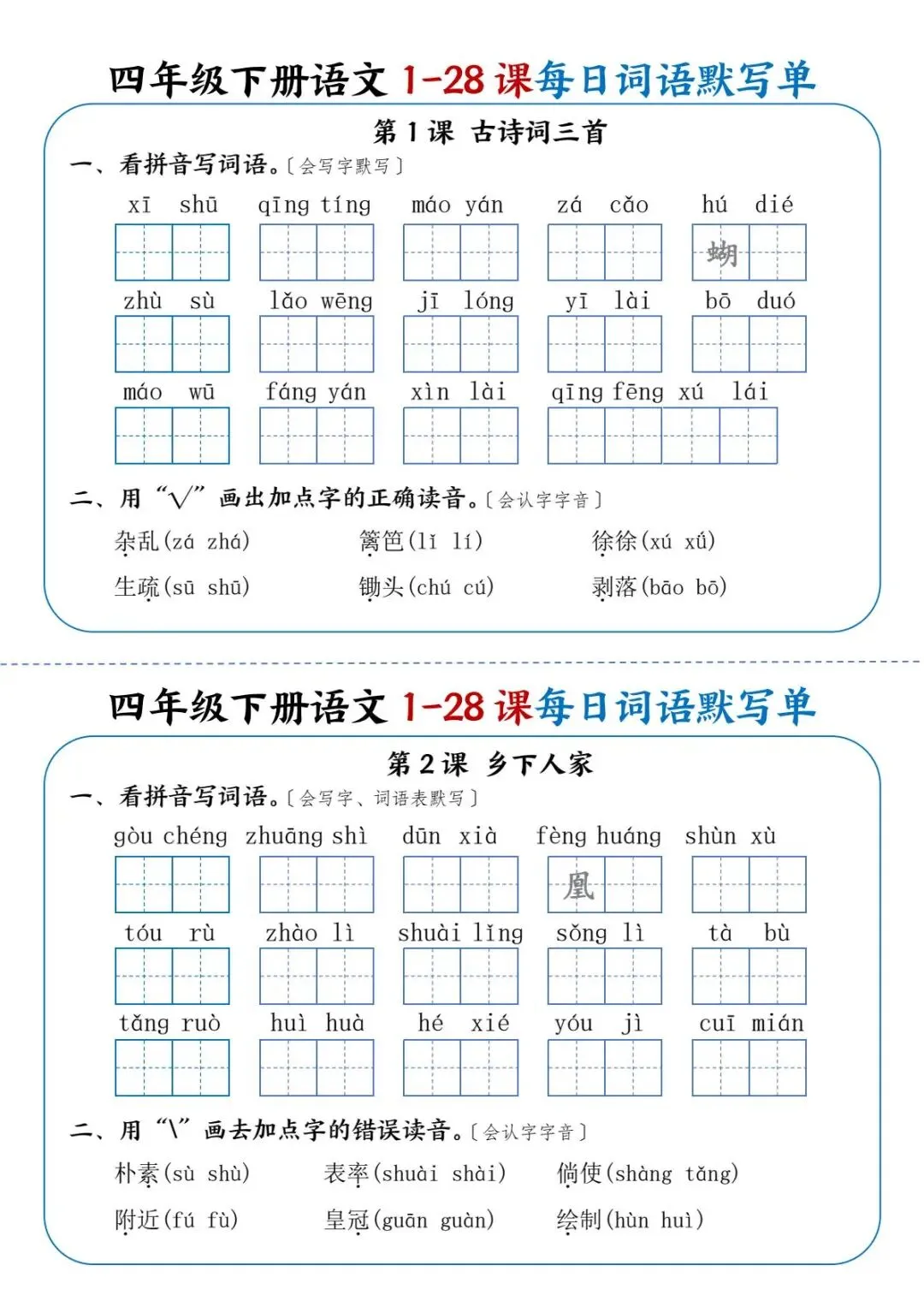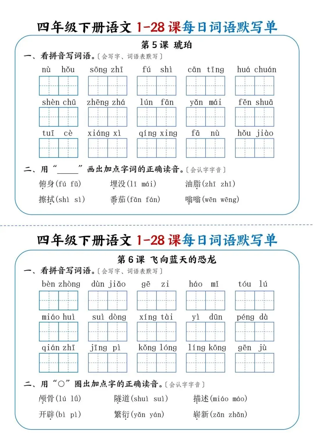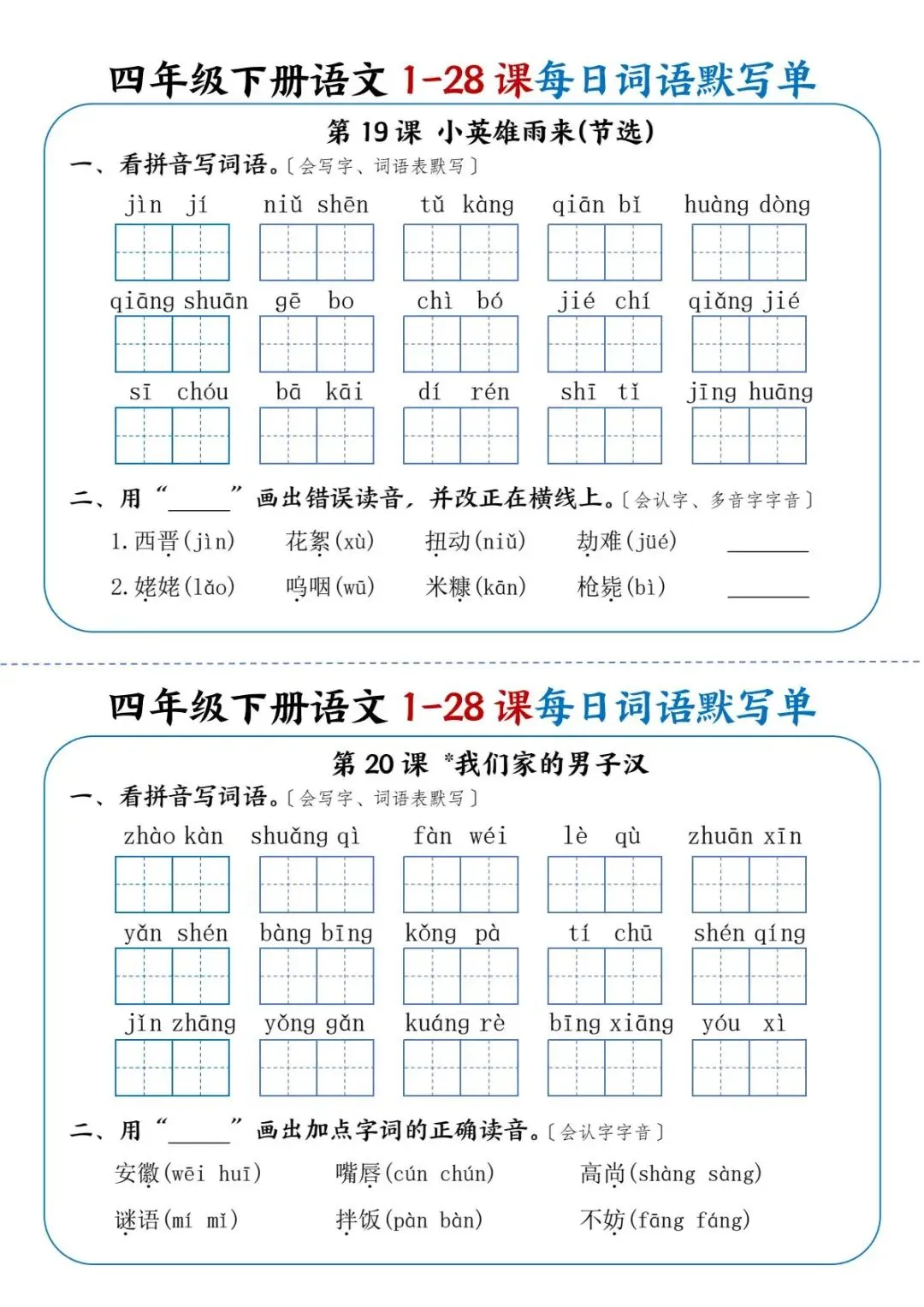 26年春四年级下册语文《每日词语默写单》电子版可打印