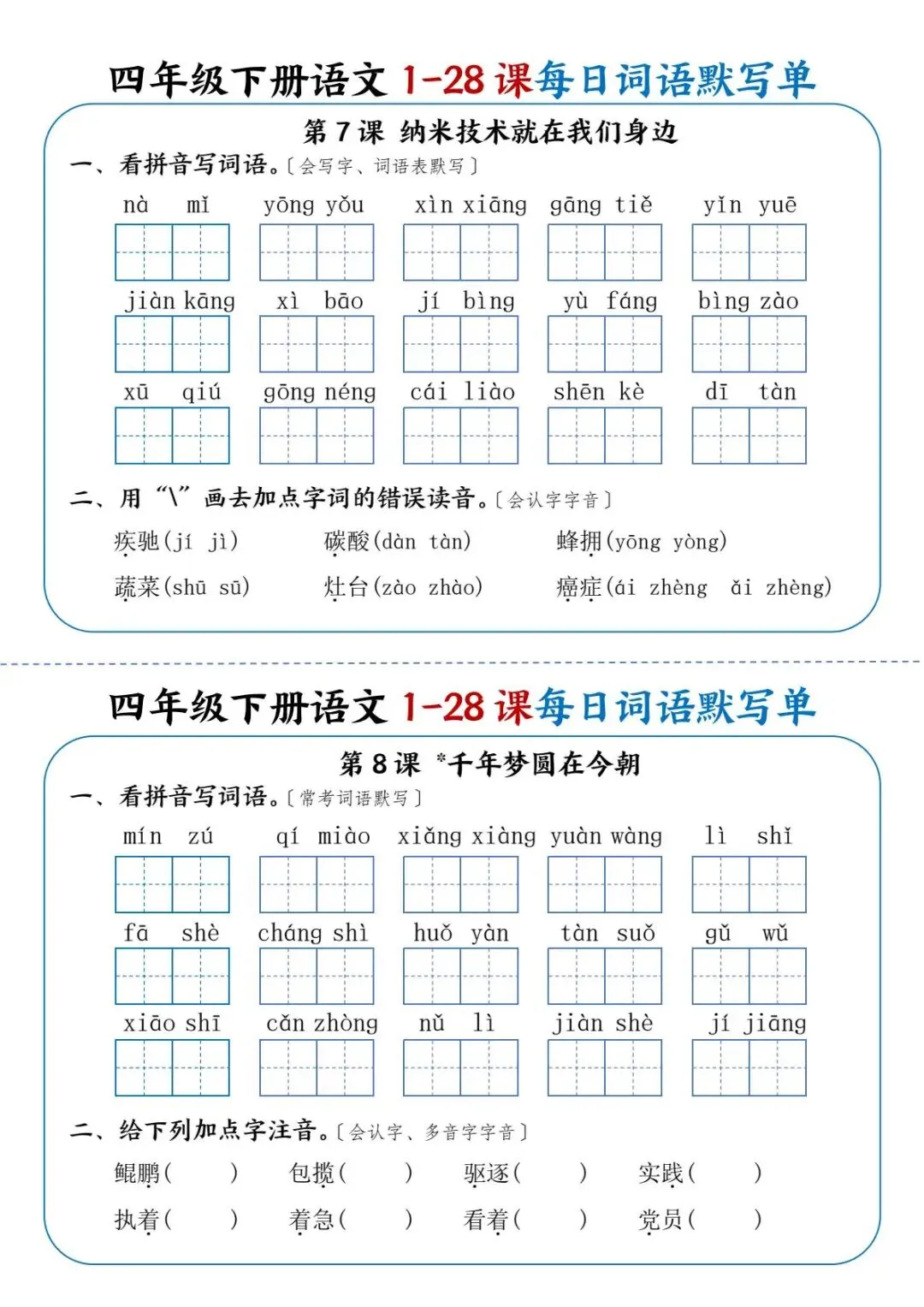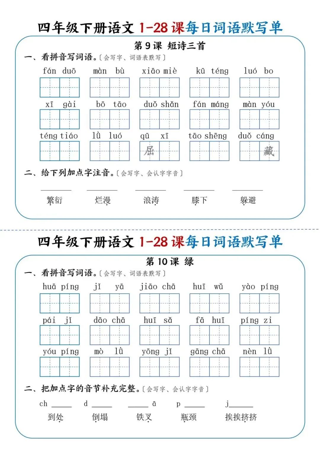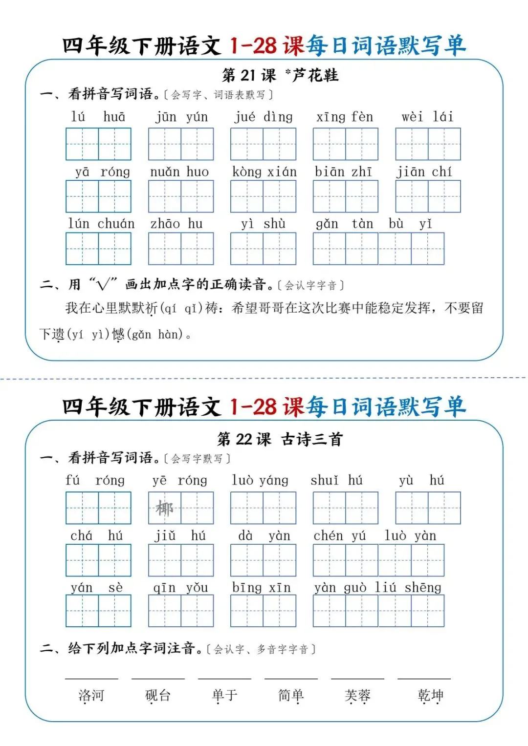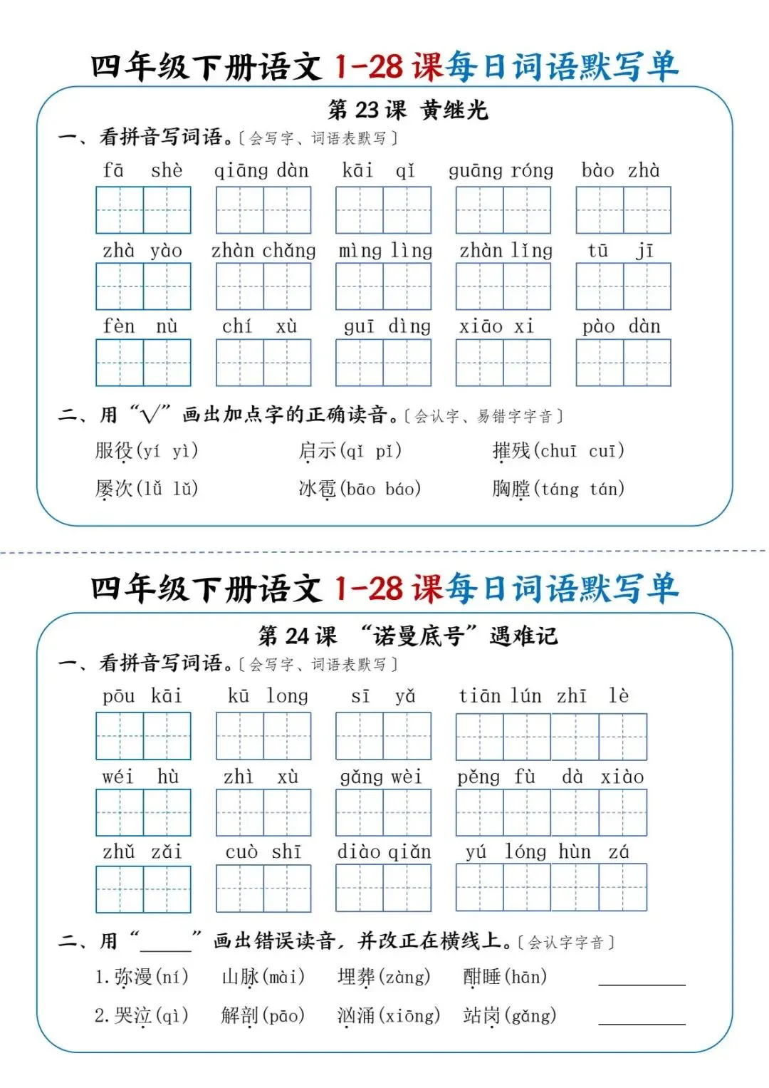 26年春四年级下册语文《每日词语默写单》电子版可打印