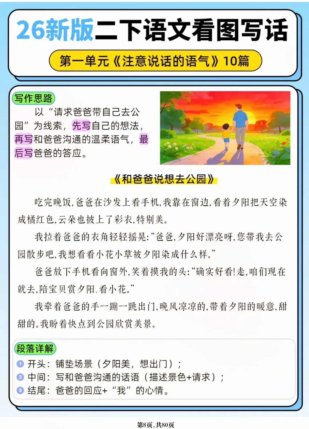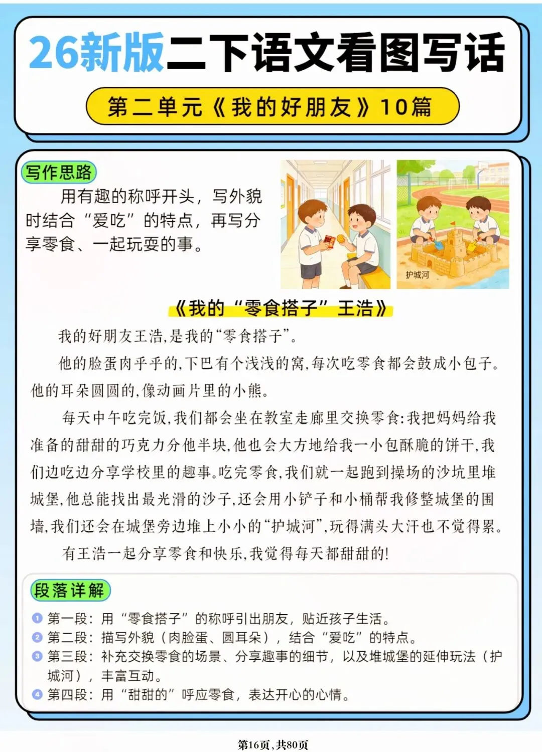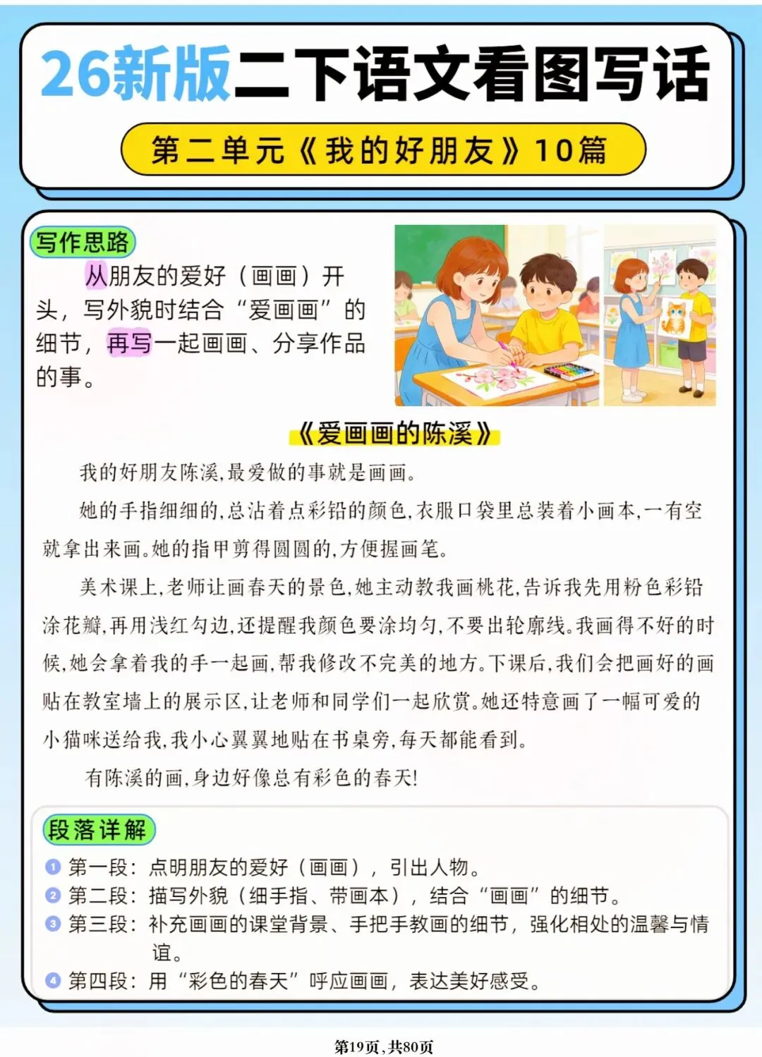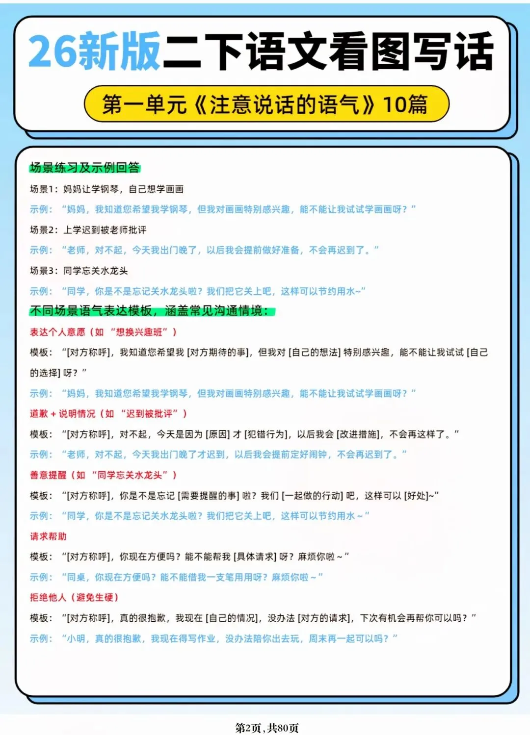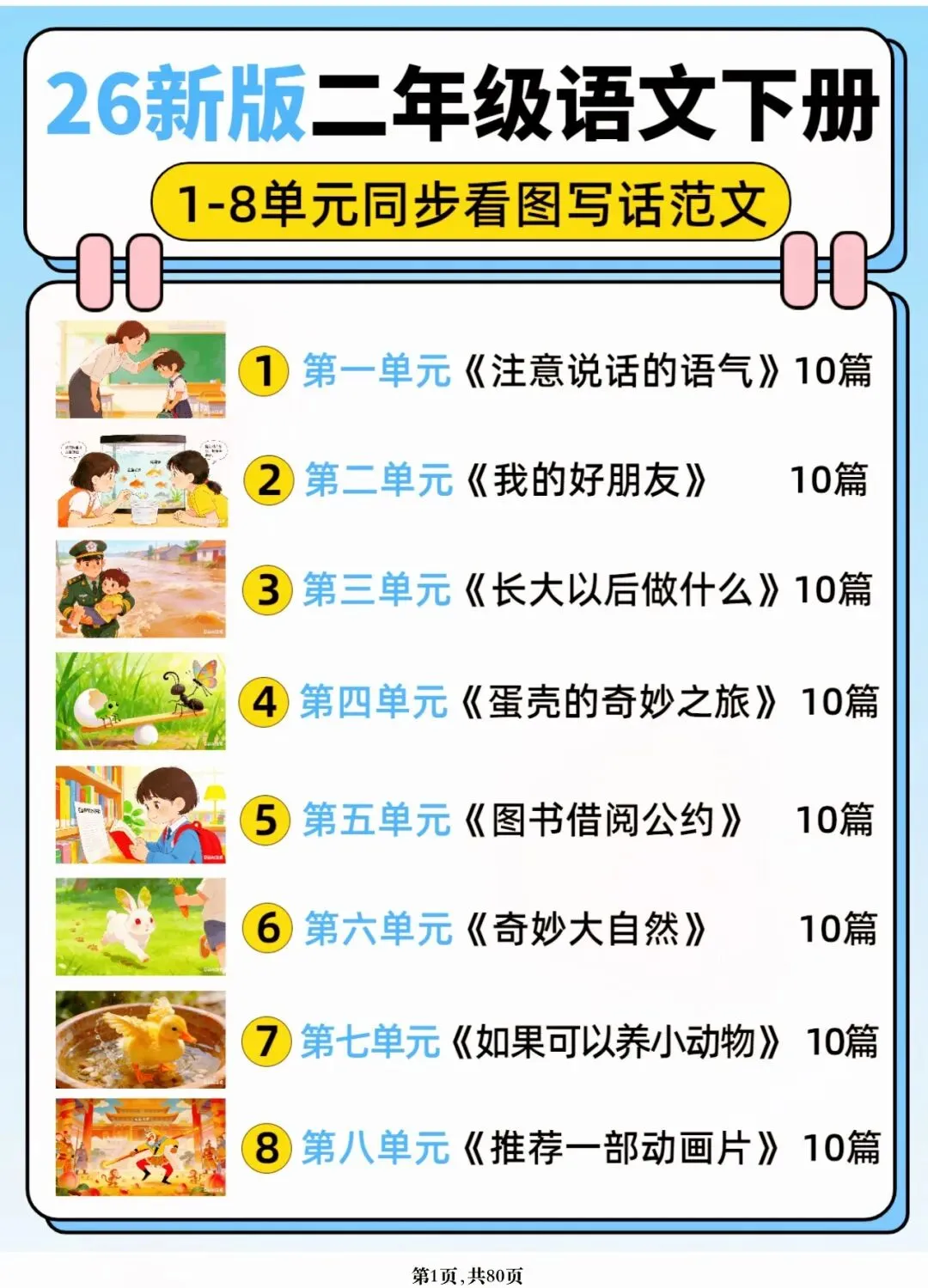 26年春人教版二年级下册语文1-8单元口语交际与写话范文,共80页,电子版可下载可打印,这份二下语文单元口语交际与写话范文,涵盖了注意说话的语气、我的好朋友、长大以后做什么、图书借阅公约、奇妙大自然、推荐一部动画片等单元的范文,帮助孩子积累丰富的写话素材,提升二年级的写话水平。二年级是表达的启蒙期,说得好才能写得好!