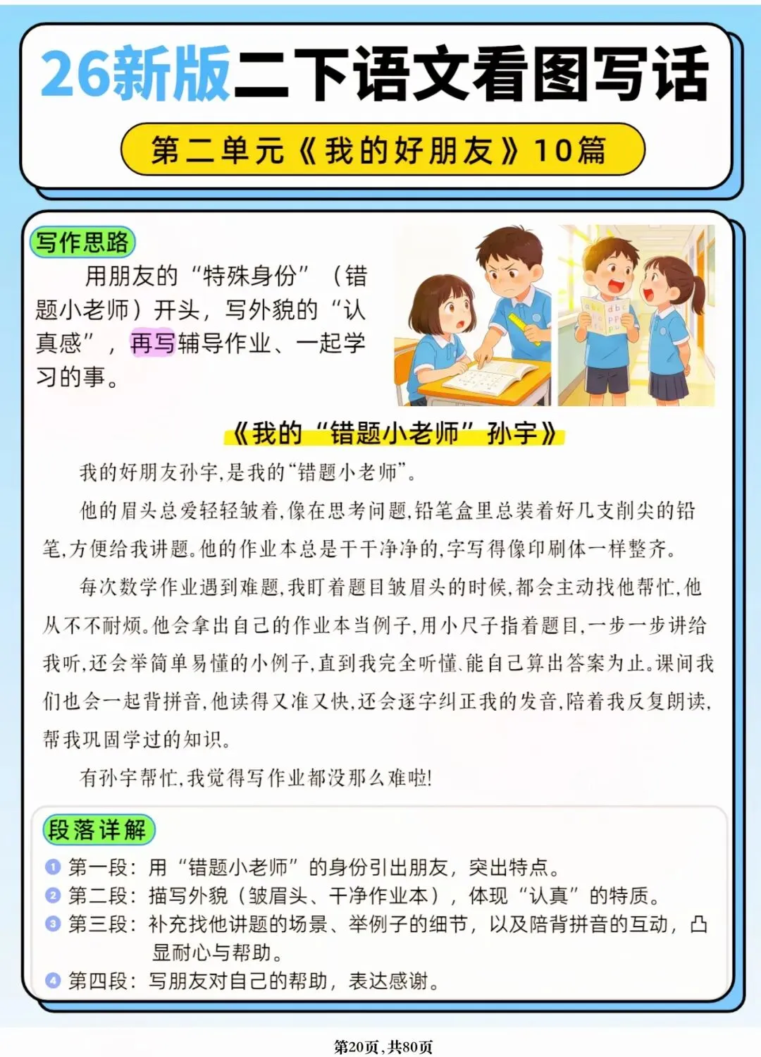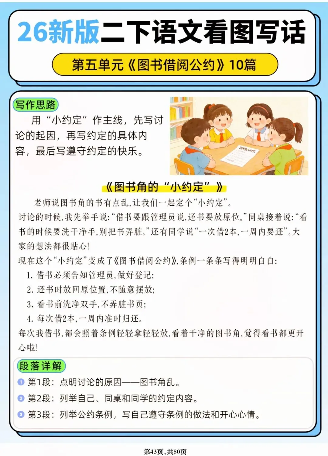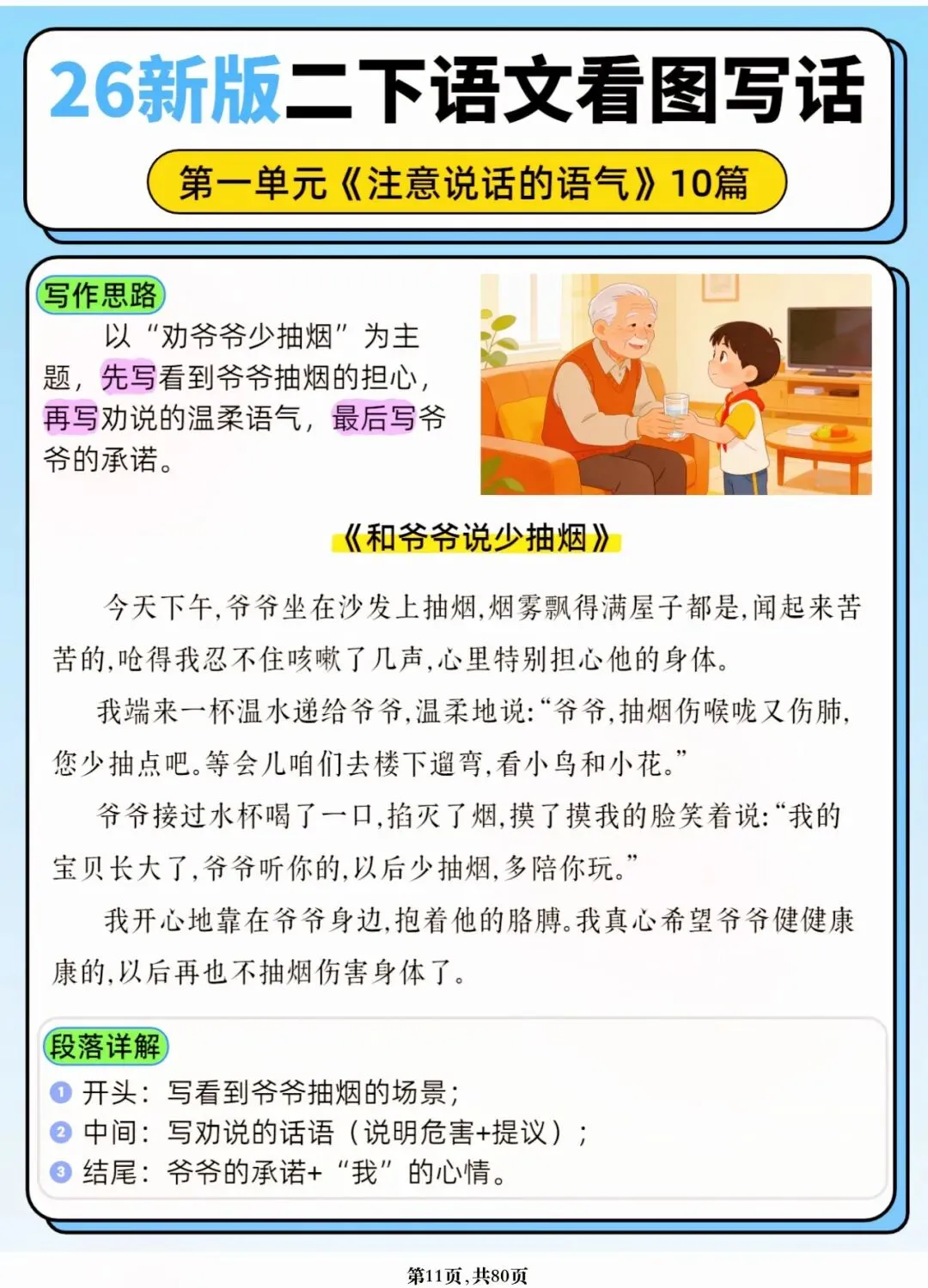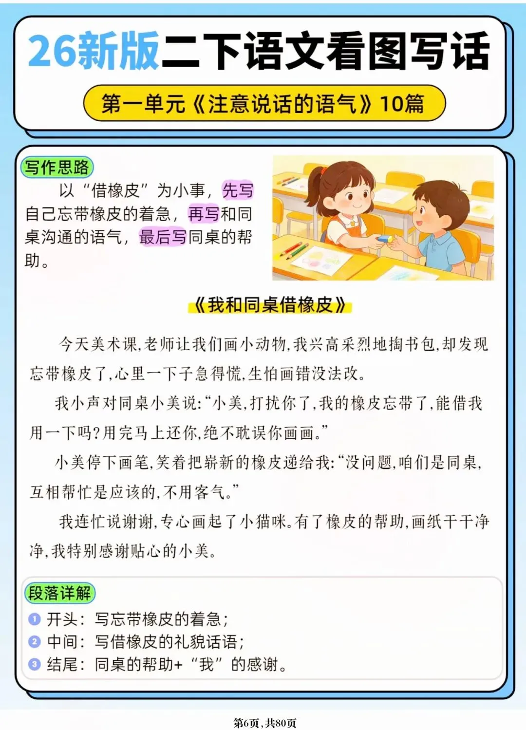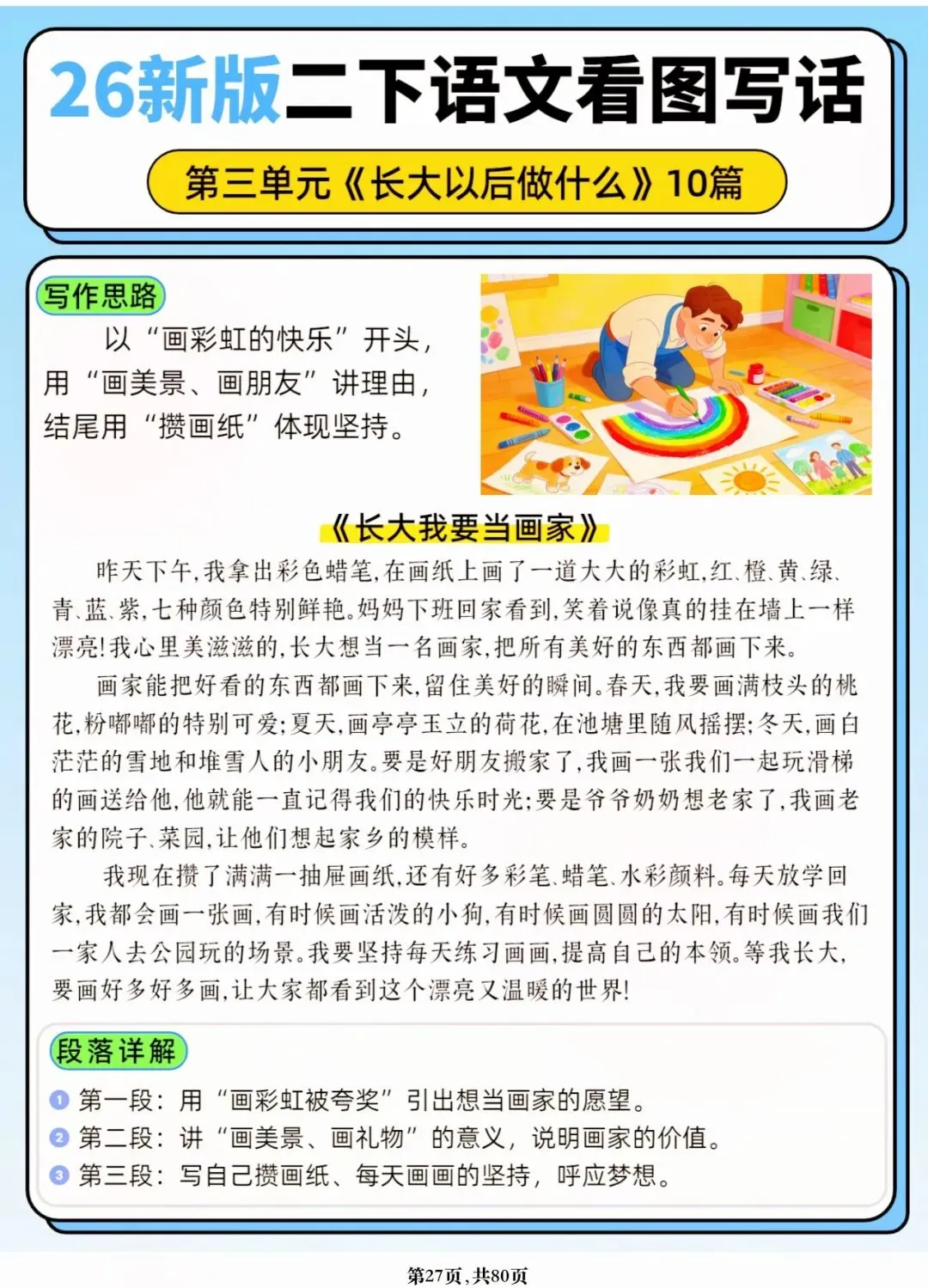 26年春人教版二年级下册语文1-8单元口语交际与写话范文,共80页,电子版可下载可打印,这份二下语文单元口语交际与写话范文,涵盖了注意说话的语气、我的好朋友、长大以后做什么、图书借阅公约、奇妙大自然、推荐一部动画片等单元的范文,帮助孩子积累丰富的写话素材,提升二年级的写话水平。二年级是表达的启蒙期,说得好才能写得好!