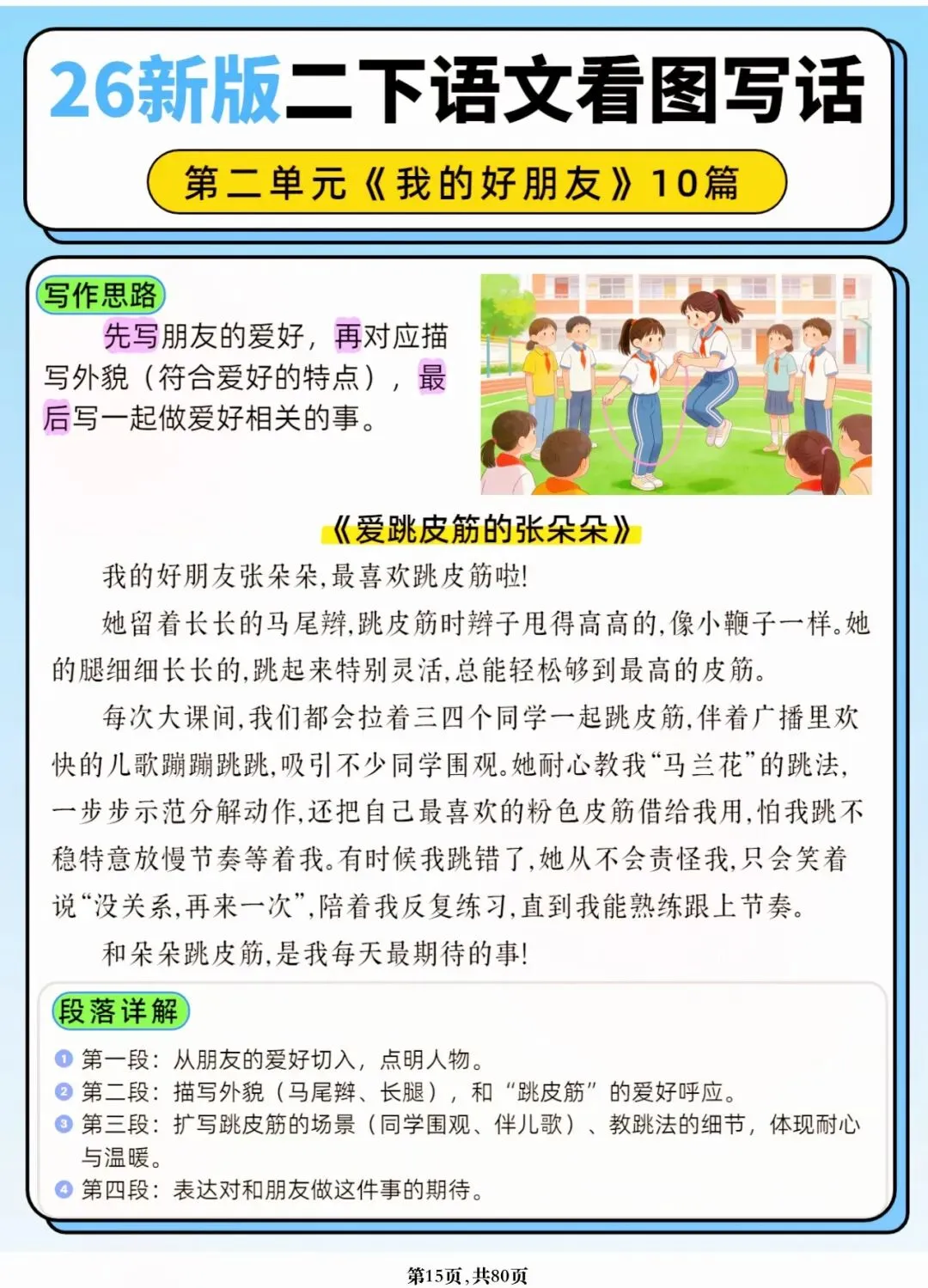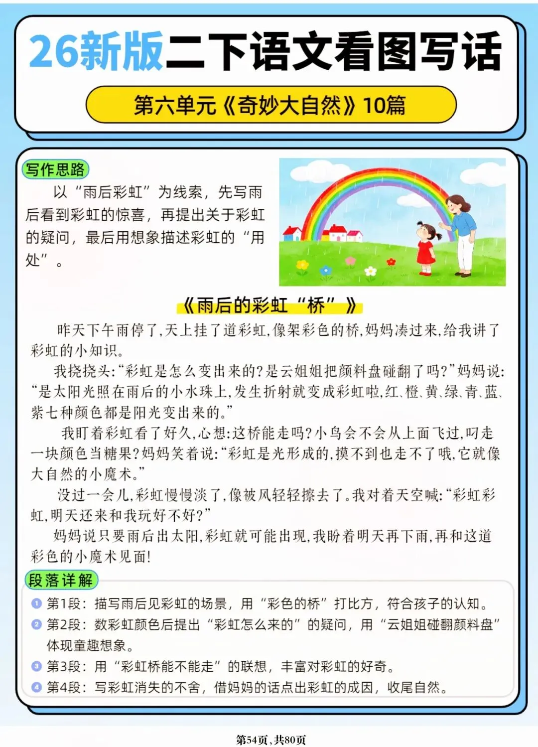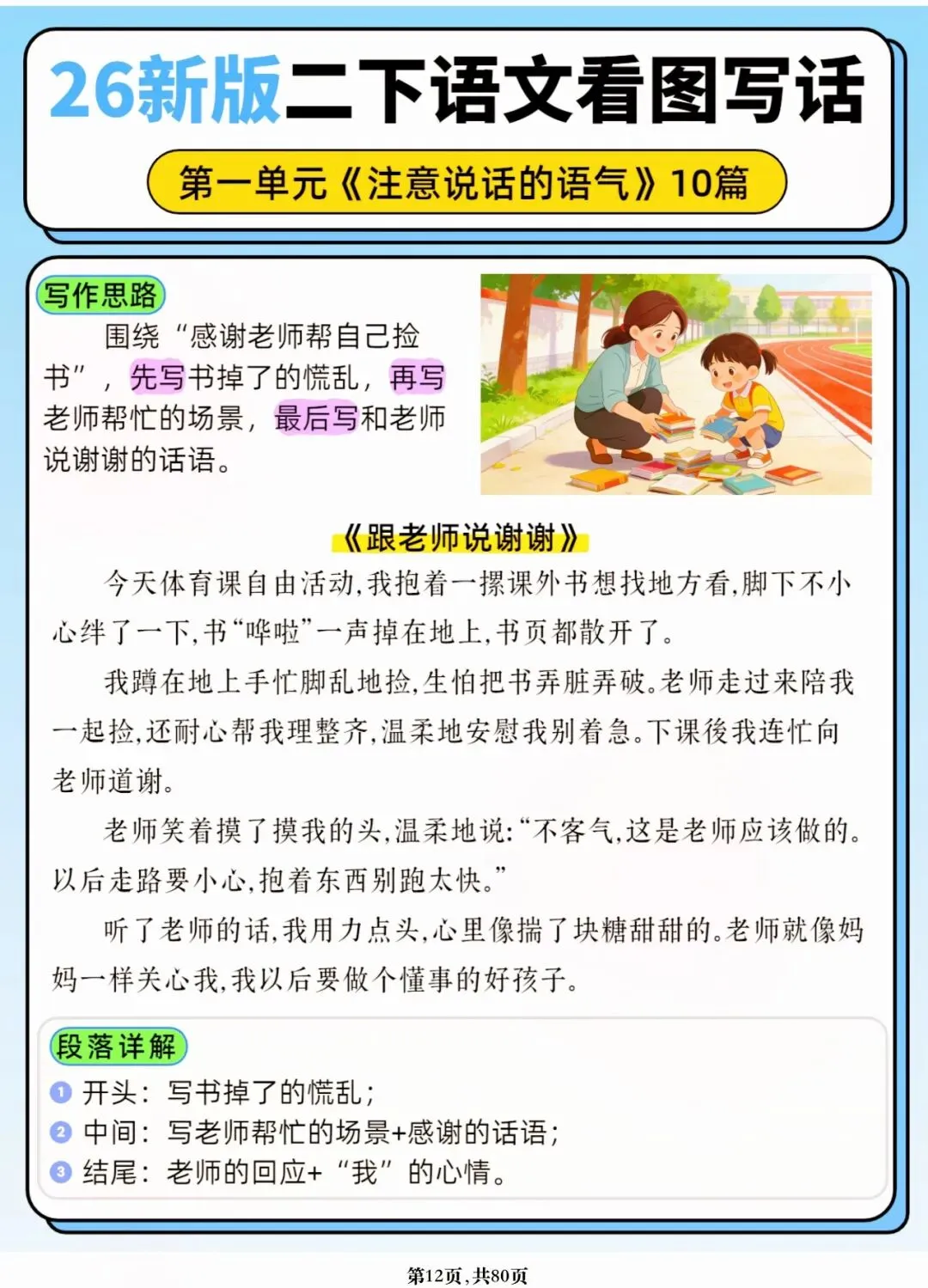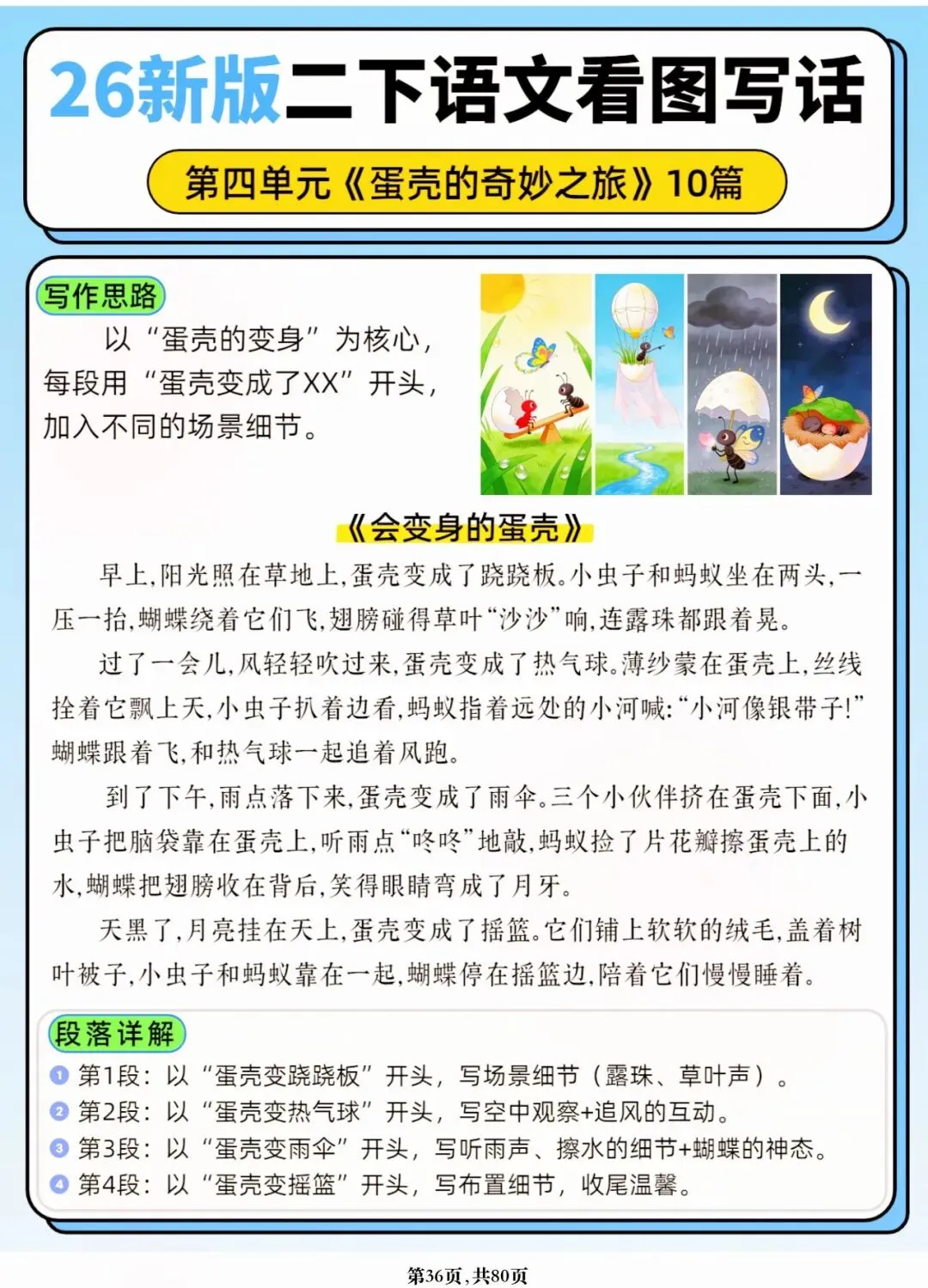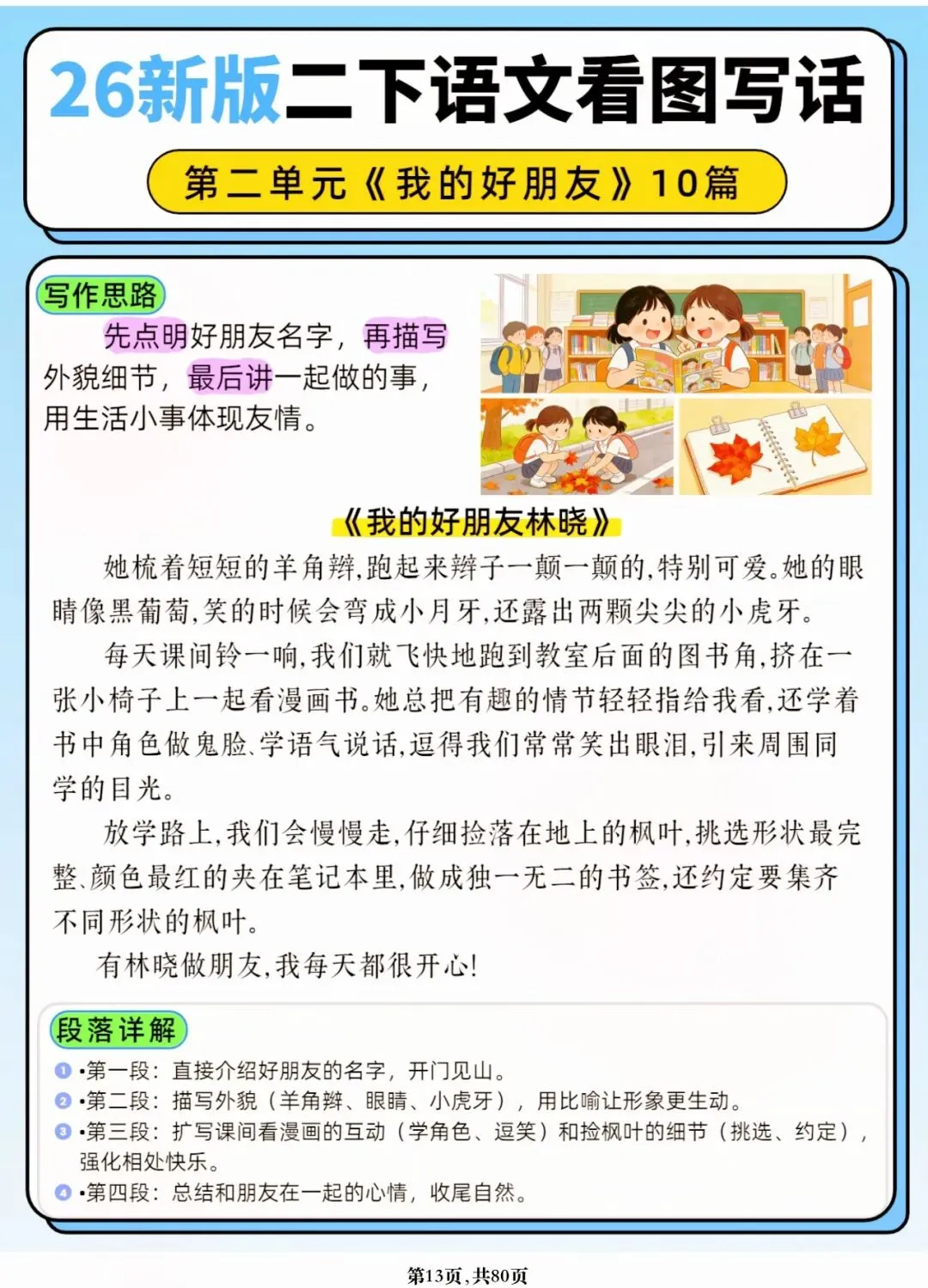 26年春人教版二年级下册语文1-8单元口语交际与写话范文,共80页,电子版可下载可打印,这份二下语文单元口语交际与写话范文,涵盖了注意说话的语气、我的好朋友、长大以后做什么、图书借阅公约、奇妙大自然、推荐一部动画片等单元的范文,帮助孩子积累丰富的写话素材,提升二年级的写话水平。二年级是表达的启蒙期,说得好才能写得好!