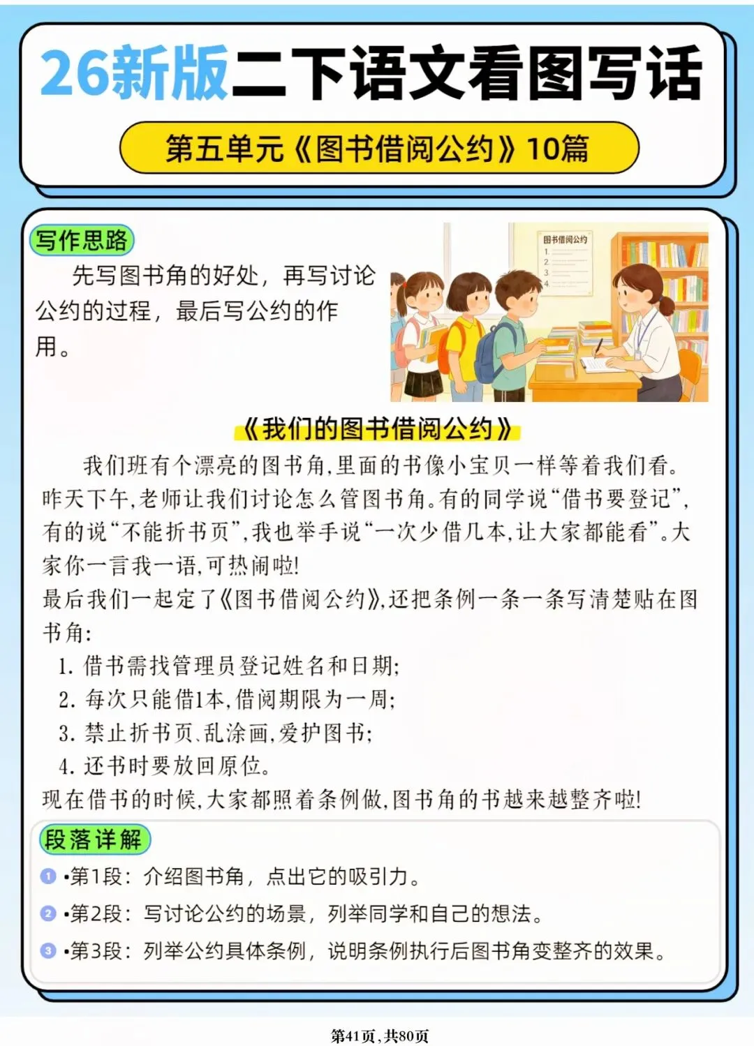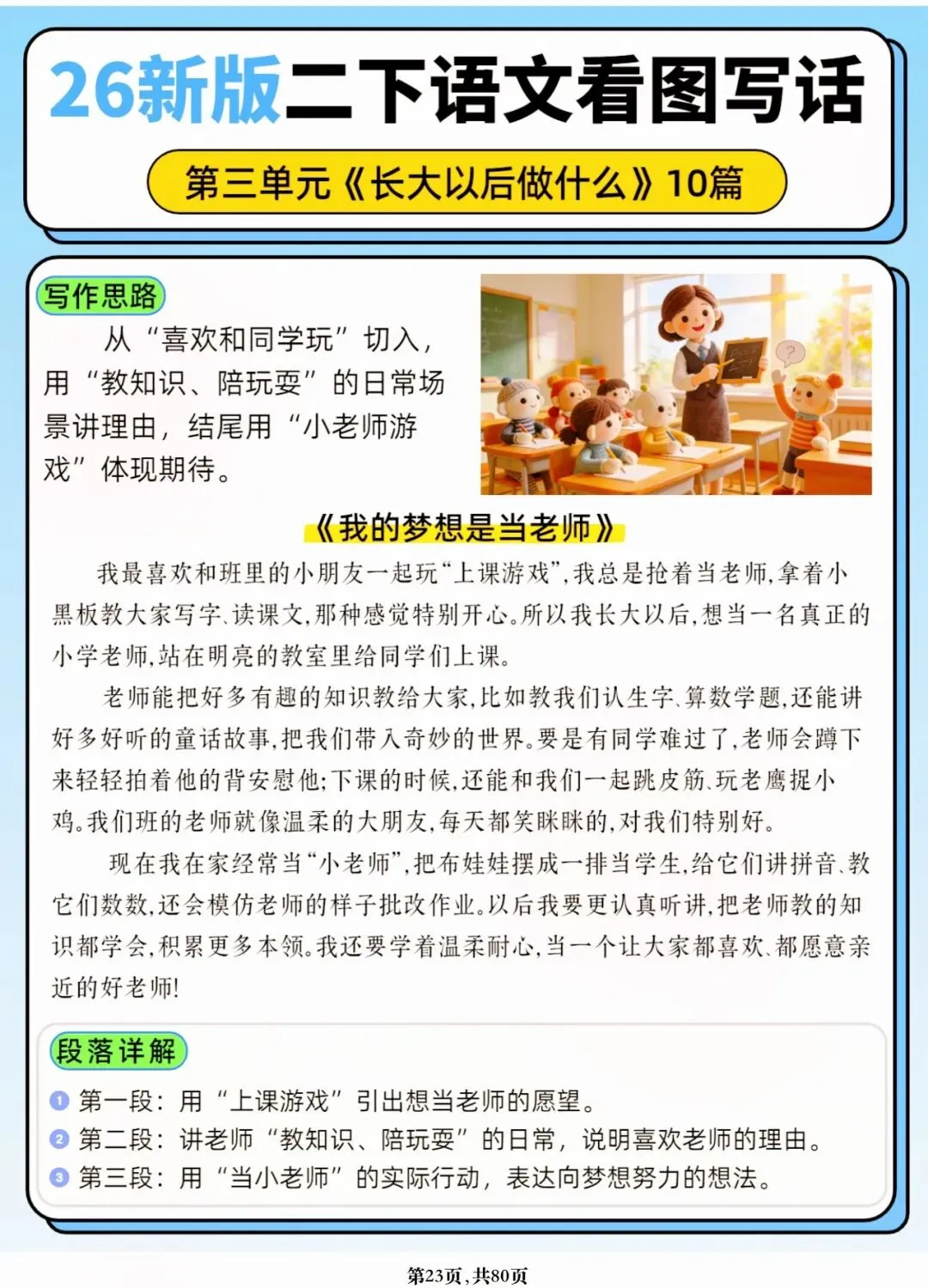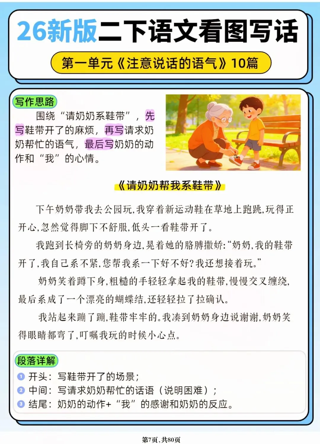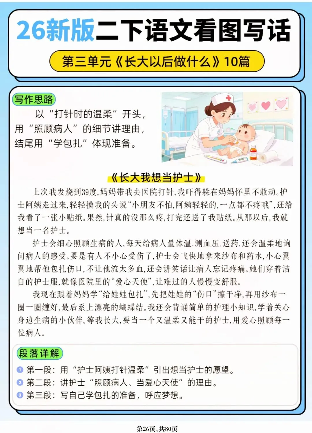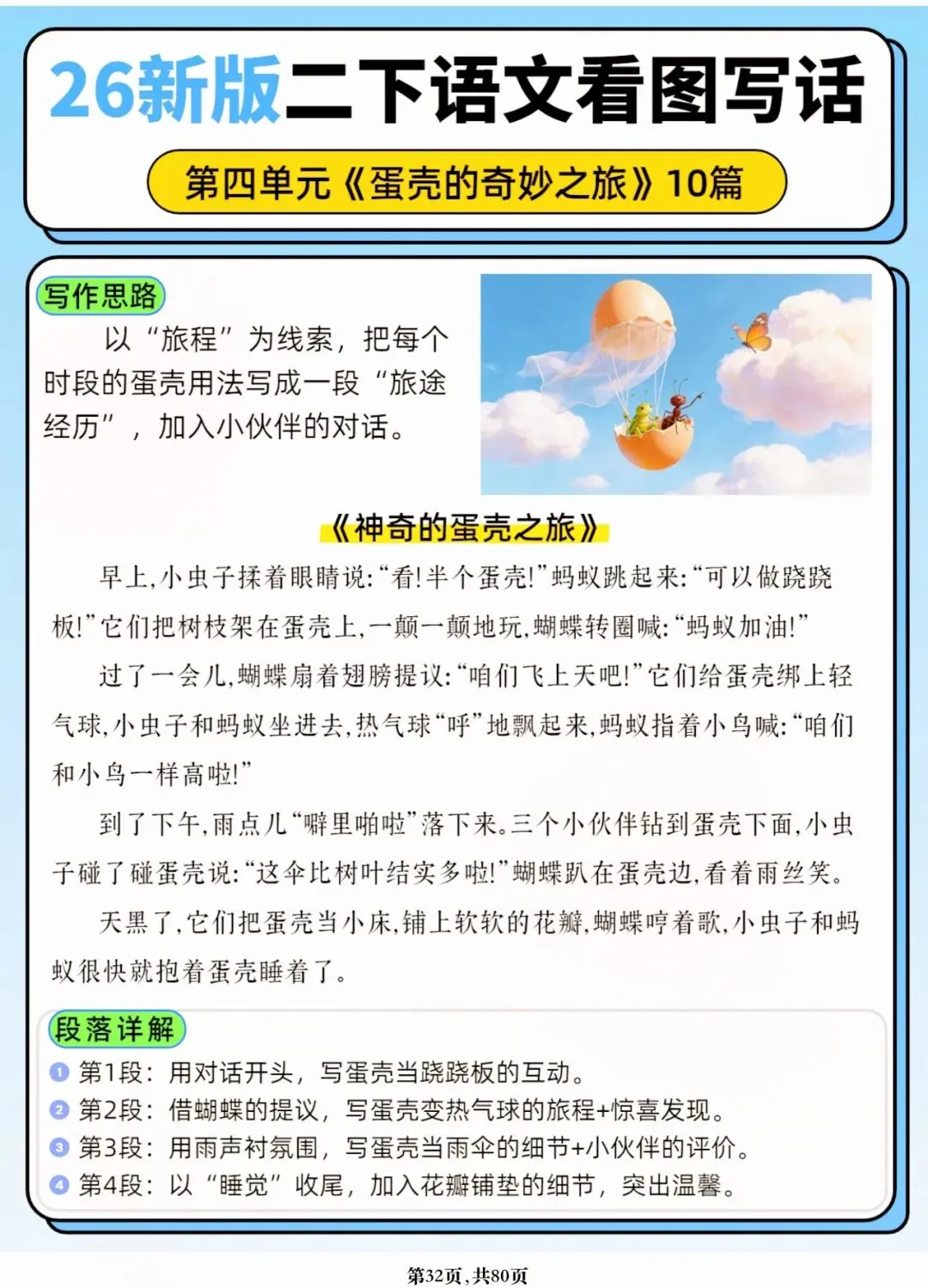 26年春人教版二年级下册语文1-8单元口语交际与写话范文,共80页,电子版可下载可打印,这份二下语文单元口语交际与写话范文,涵盖了注意说话的语气、我的好朋友、长大以后做什么、图书借阅公约、奇妙大自然、推荐一部动画片等单元的范文,帮助孩子积累丰富的写话素材,提升二年级的写话水平。二年级是表达的启蒙期,说得好才能写得好!