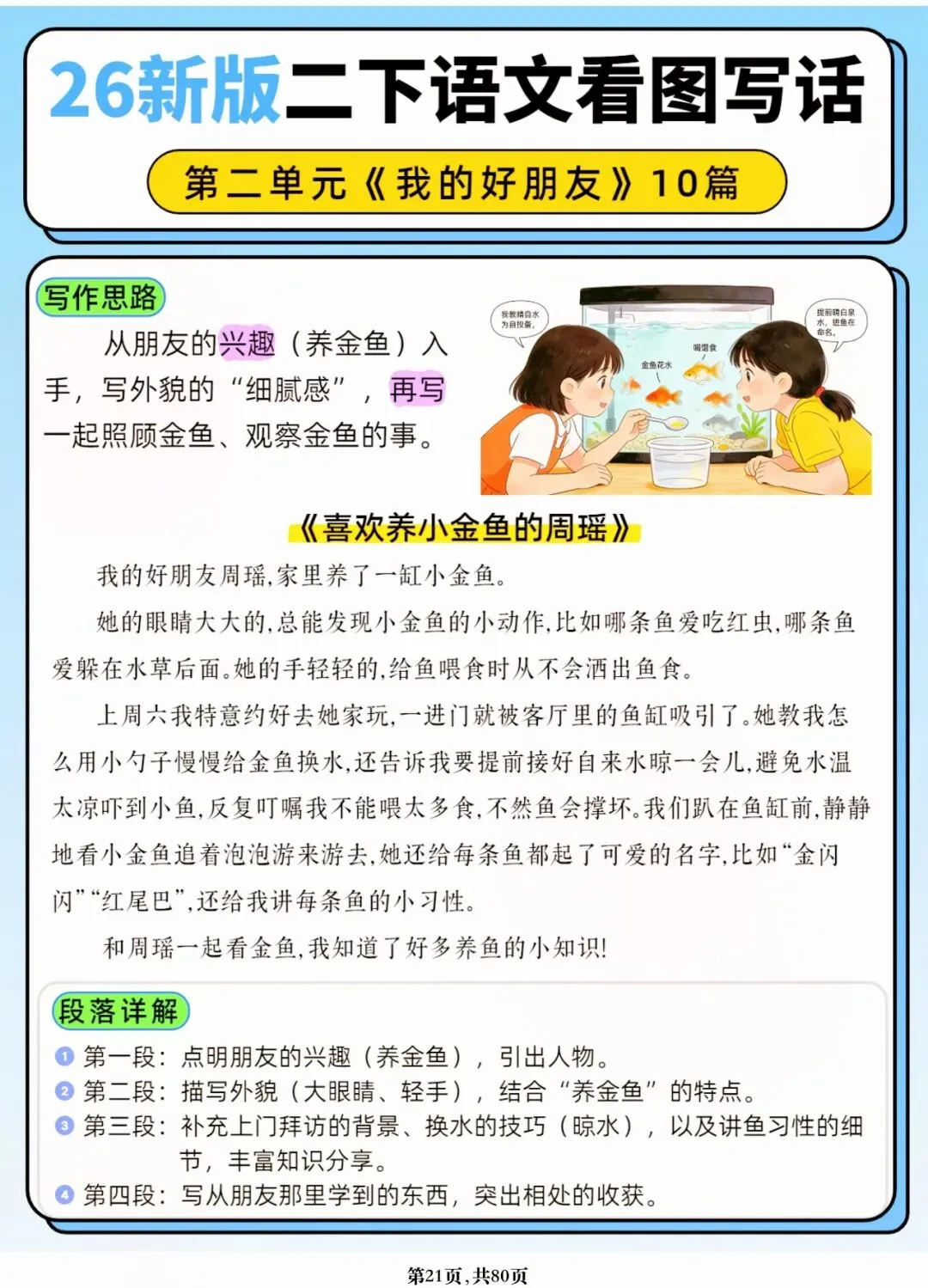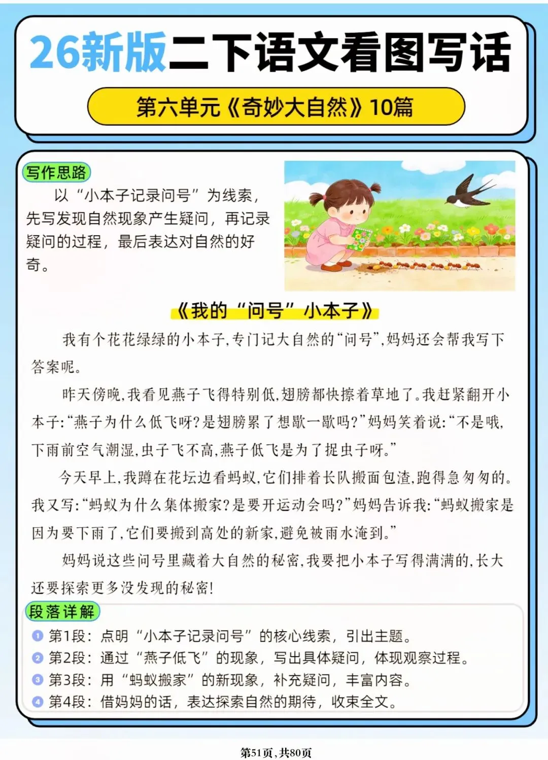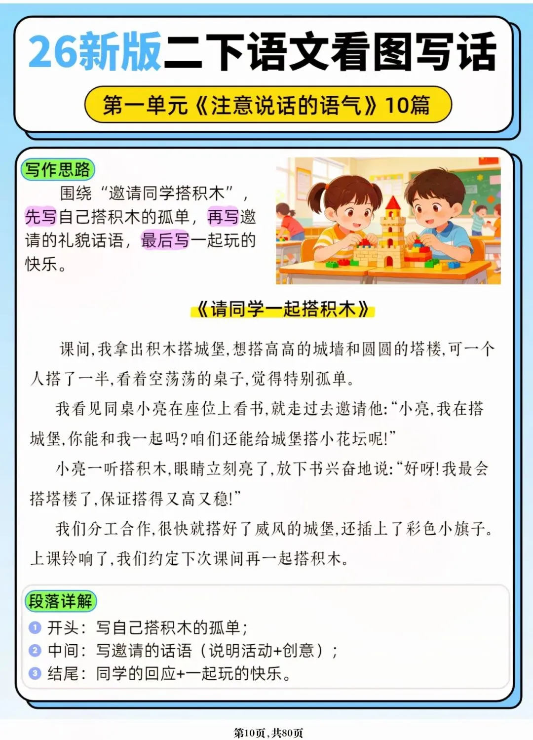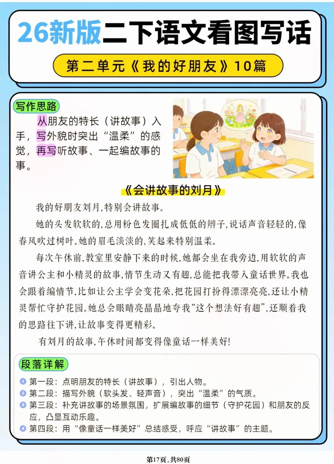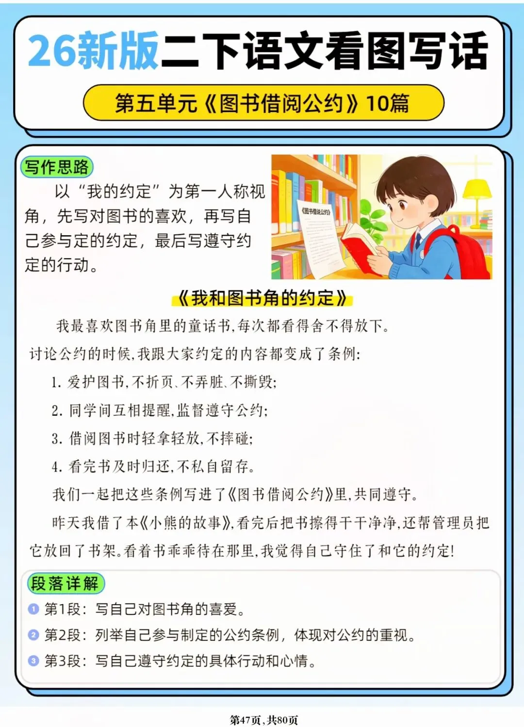 26年春人教版二年级下册语文1-8单元口语交际与写话范文,共80页,电子版可下载可打印,这份二下语文单元口语交际与写话范文,涵盖了注意说话的语气、我的好朋友、长大以后做什么、图书借阅公约、奇妙大自然、推荐一部动画片等单元的范文,帮助孩子积累丰富的写话素材,提升二年级的写话水平。二年级是表达的启蒙期,说得好才能写得好!