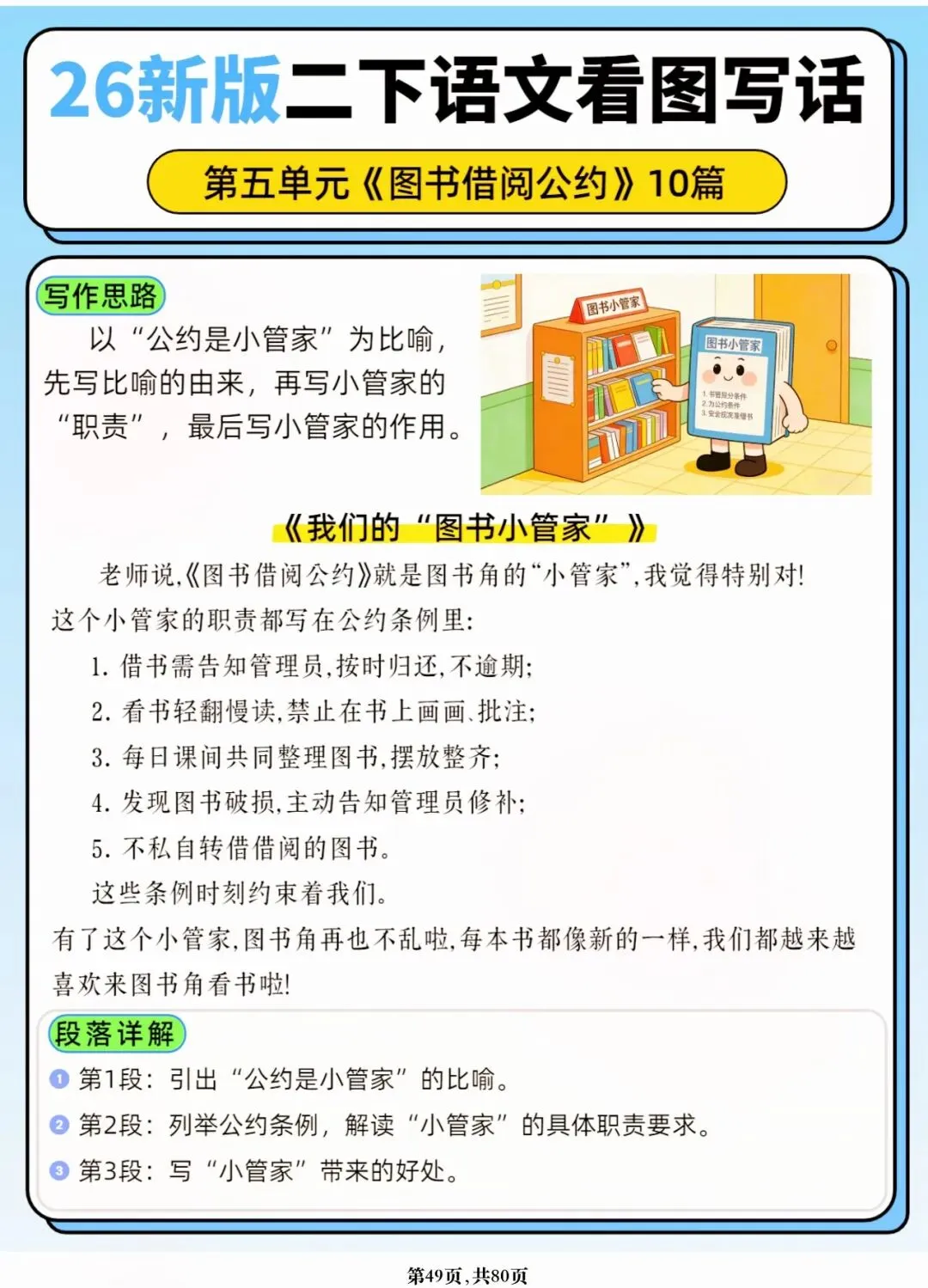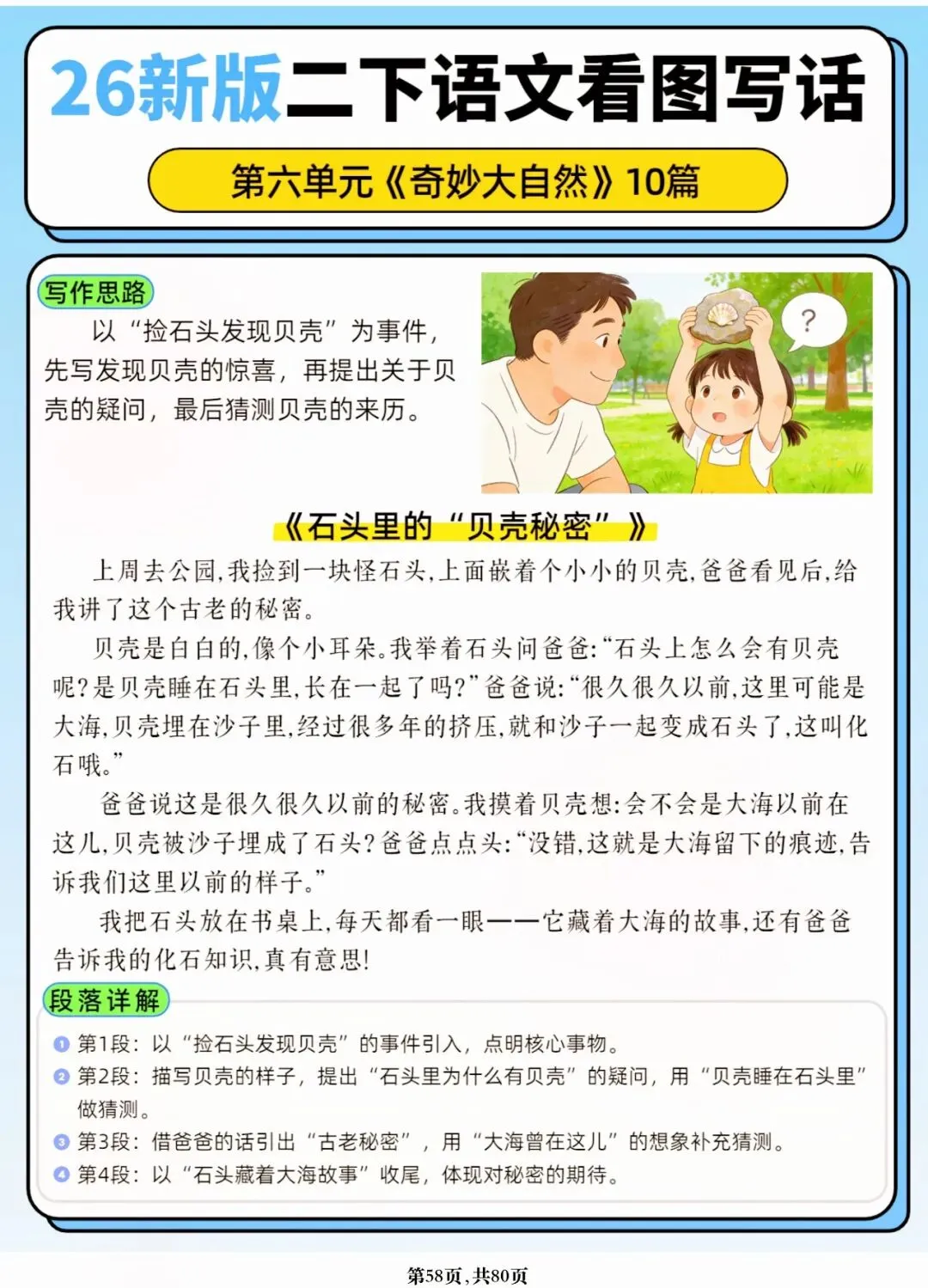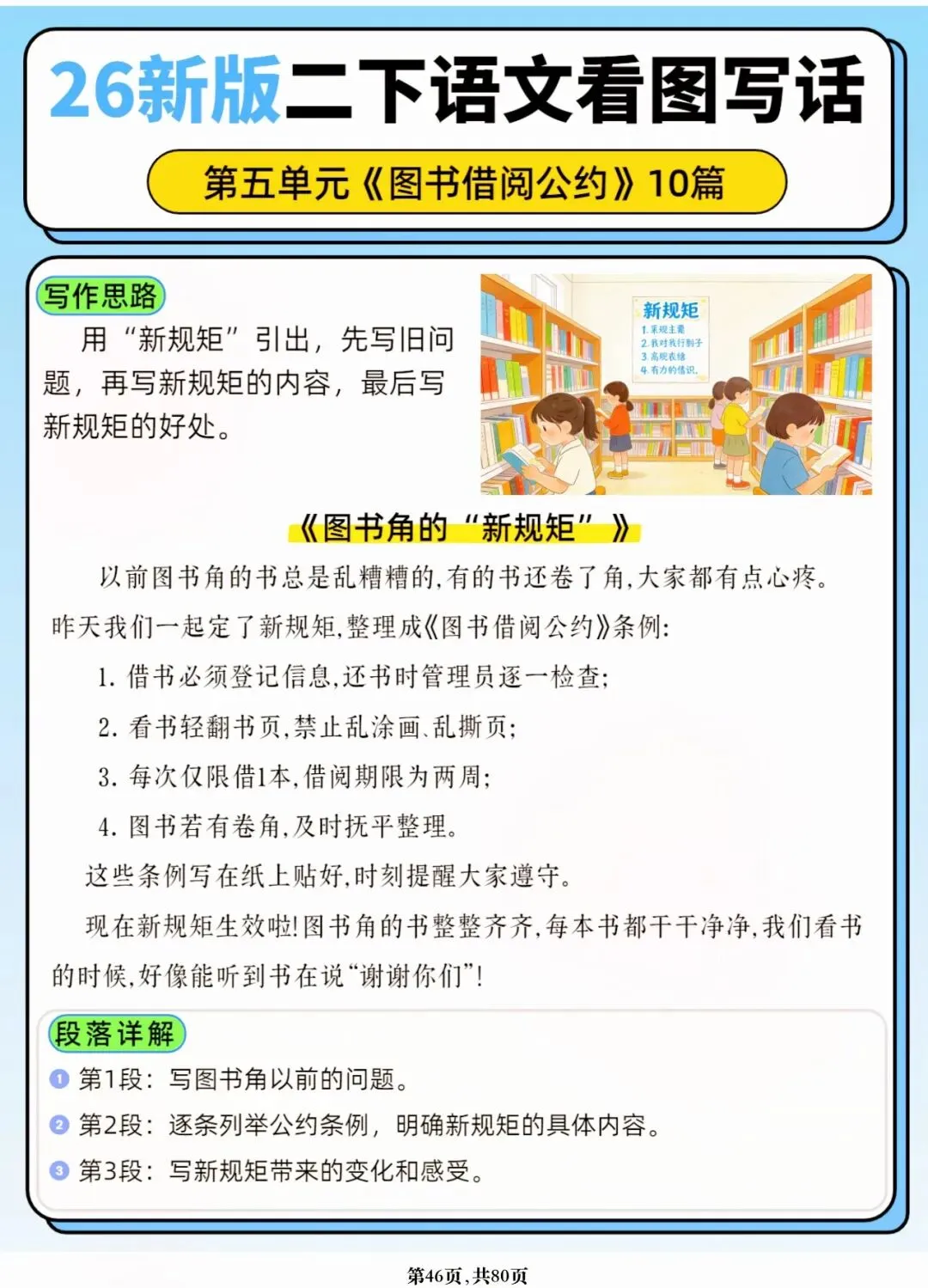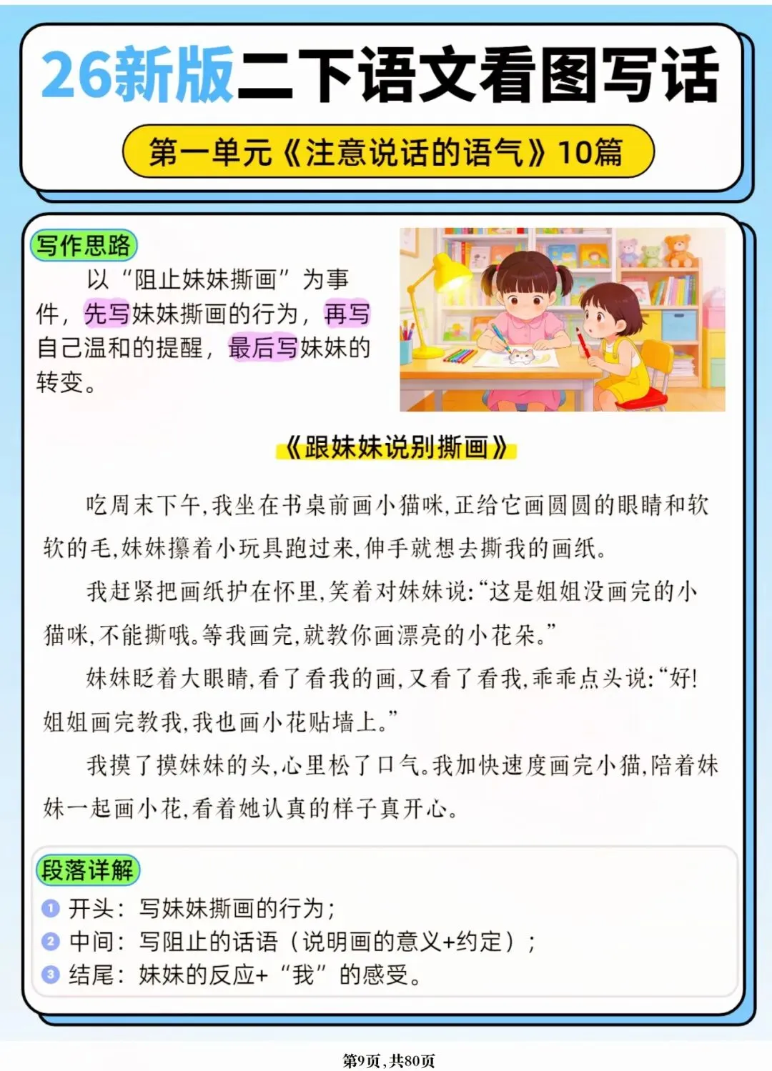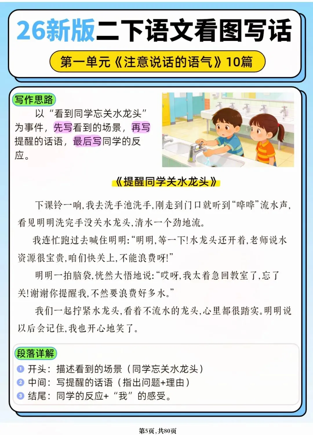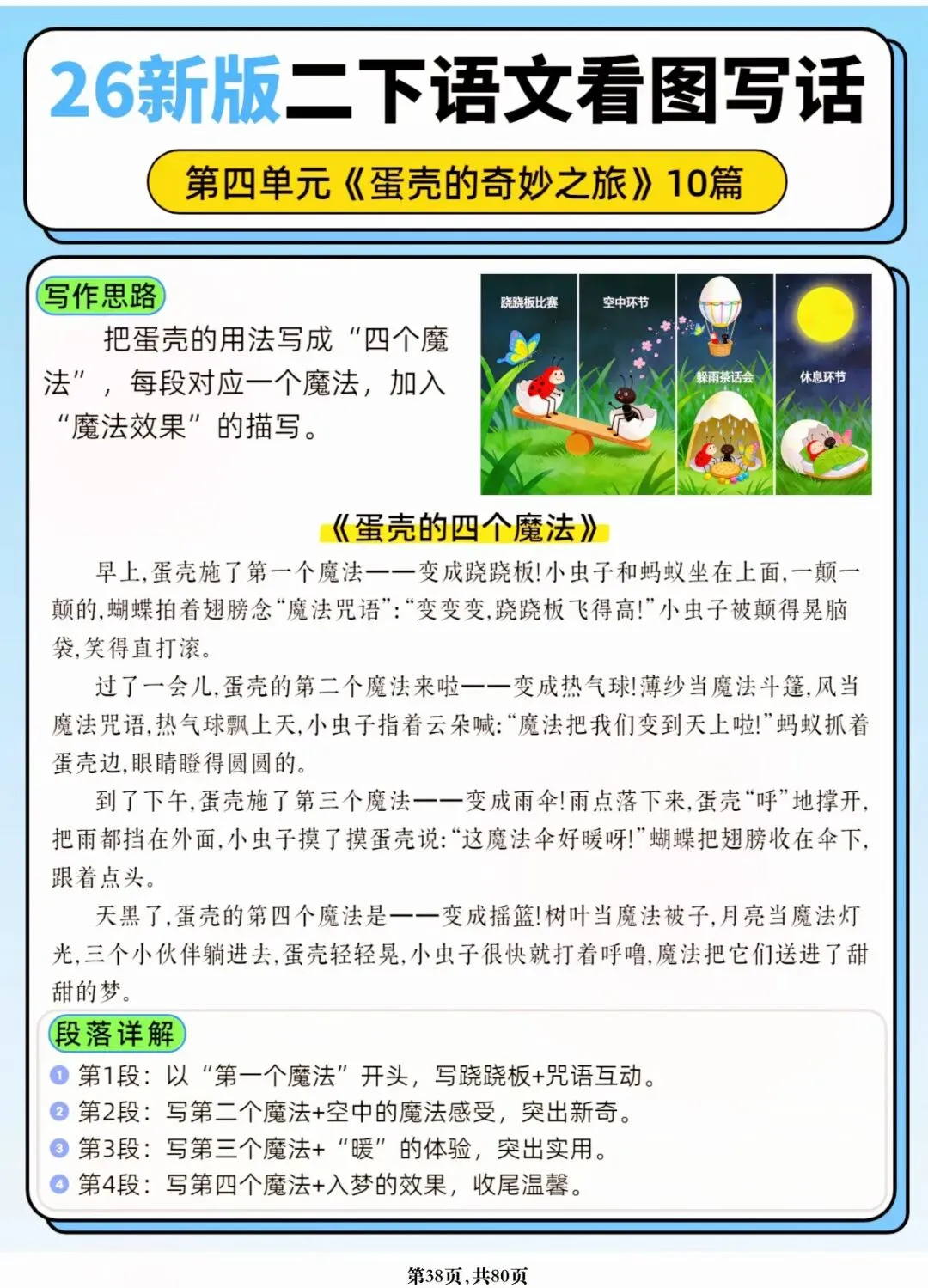26年春人教版二年级下册语文1-8单元口语交际与写话范文,共80页,电子版可下载可打印,这份二下语文单元口语交际与写话范文,涵盖了注意说话的语气、我的好朋友、长大以后做什么、图书借阅公约、奇妙大自然、推荐一部动画片等单元的范文,帮助孩子积累丰富的写话素材,提升二年级的写话水平。二年级是表达的启蒙期,说得好才能写得好!
