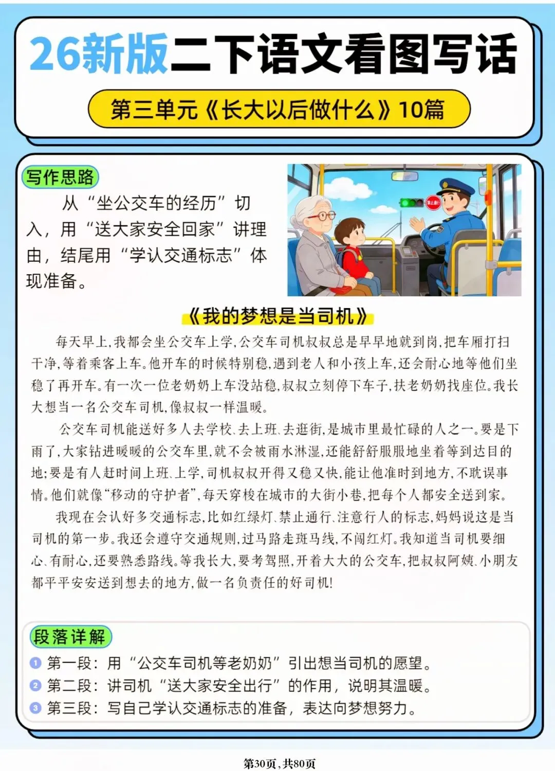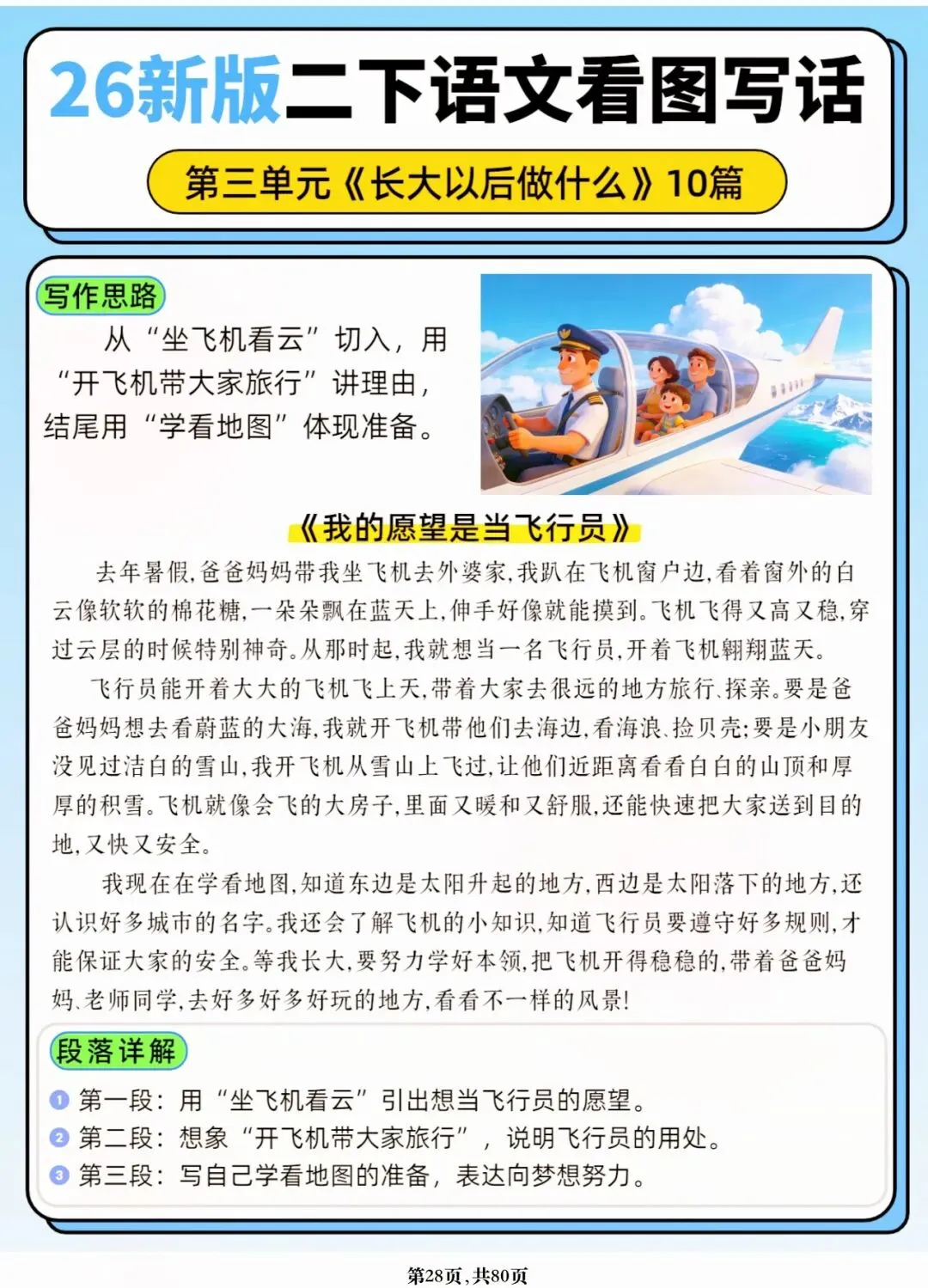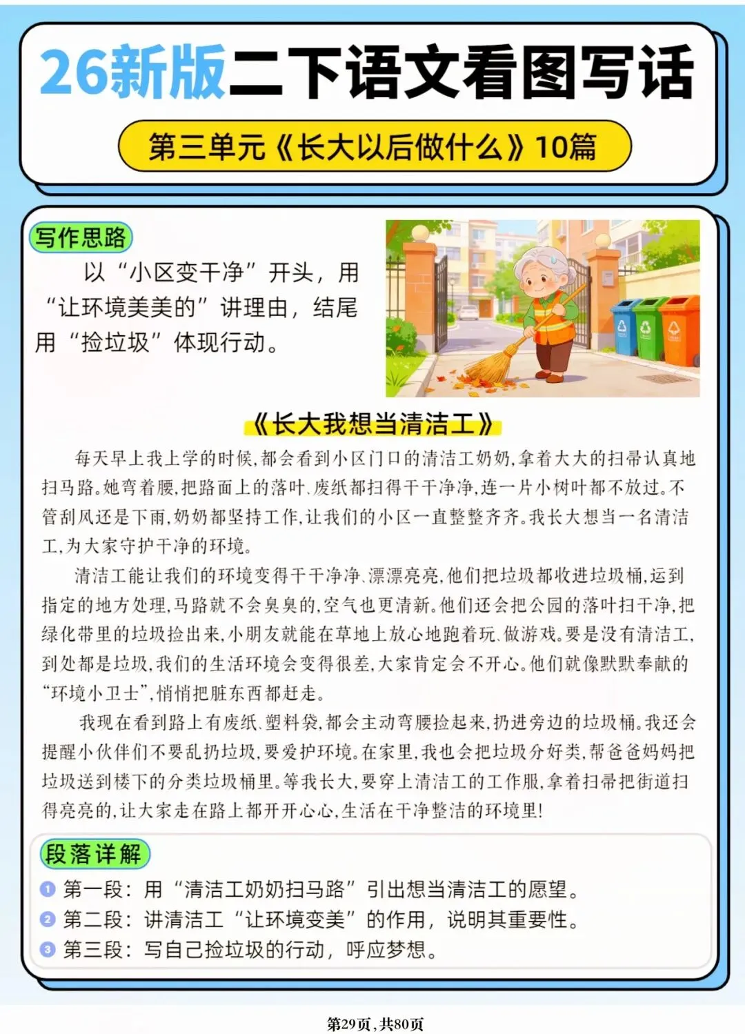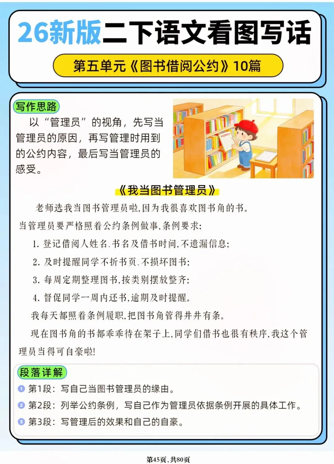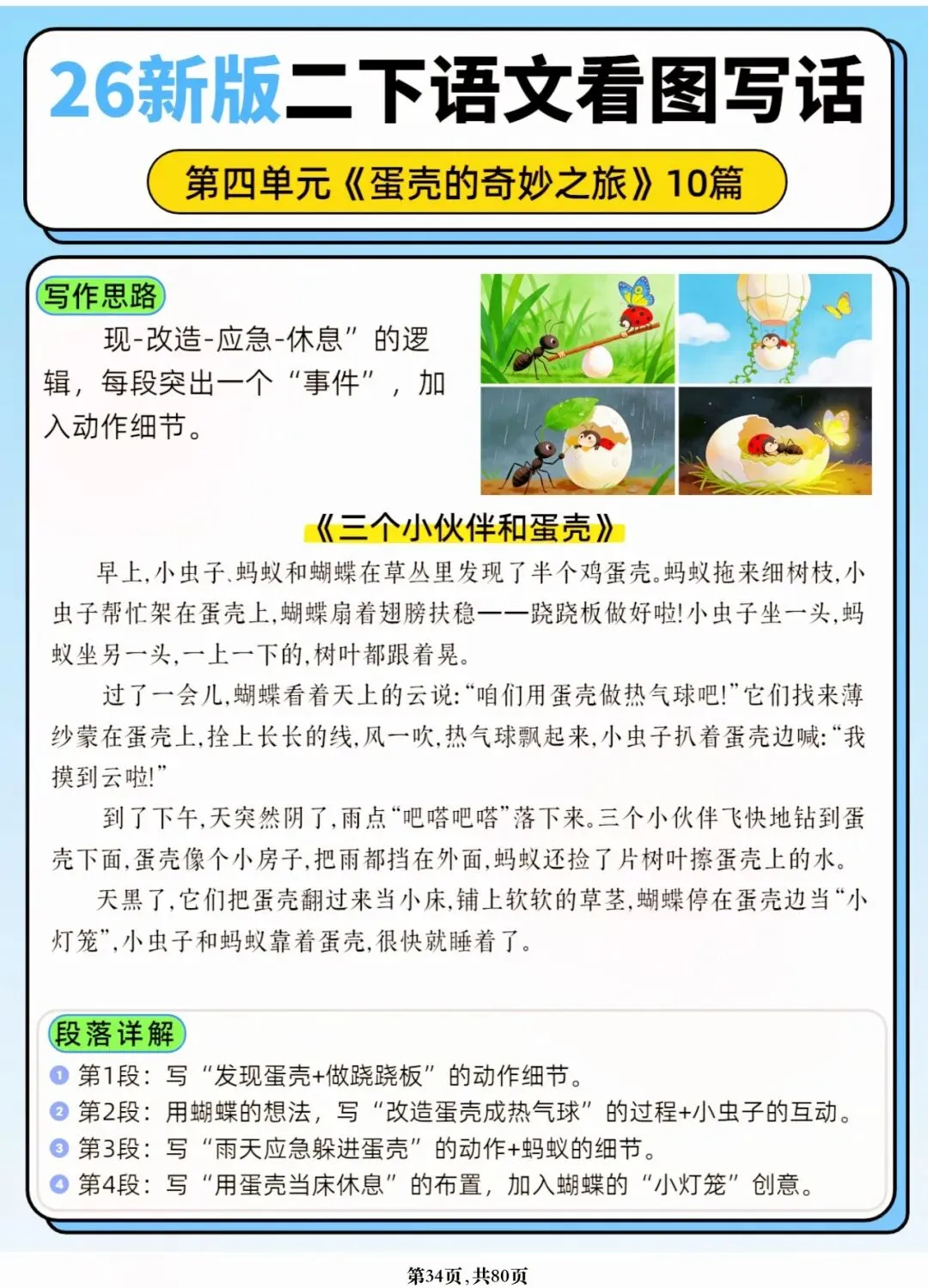 26年春人教版二年级下册语文1-8单元口语交际与写话范文,共80页,电子版可下载可打印,这份二下语文单元口语交际与写话范文,涵盖了注意说话的语气、我的好朋友、长大以后做什么、图书借阅公约、奇妙大自然、推荐一部动画片等单元的范文,帮助孩子积累丰富的写话素材,提升二年级的写话水平。二年级是表达的启蒙期,说得好才能写得好!