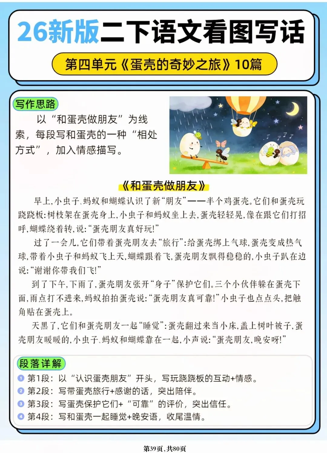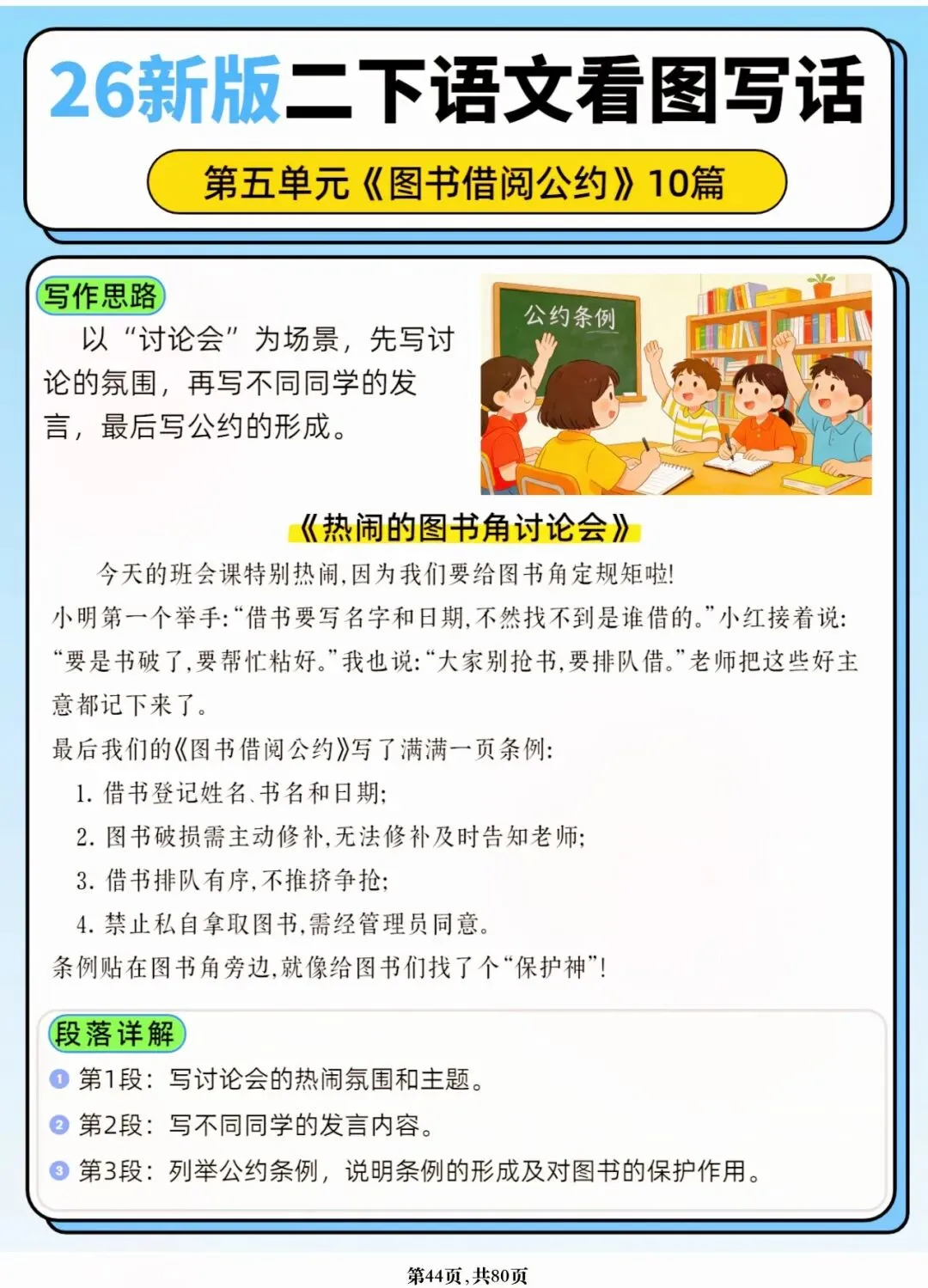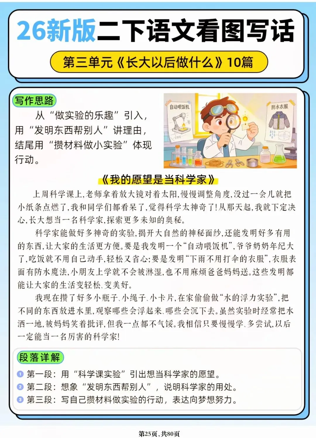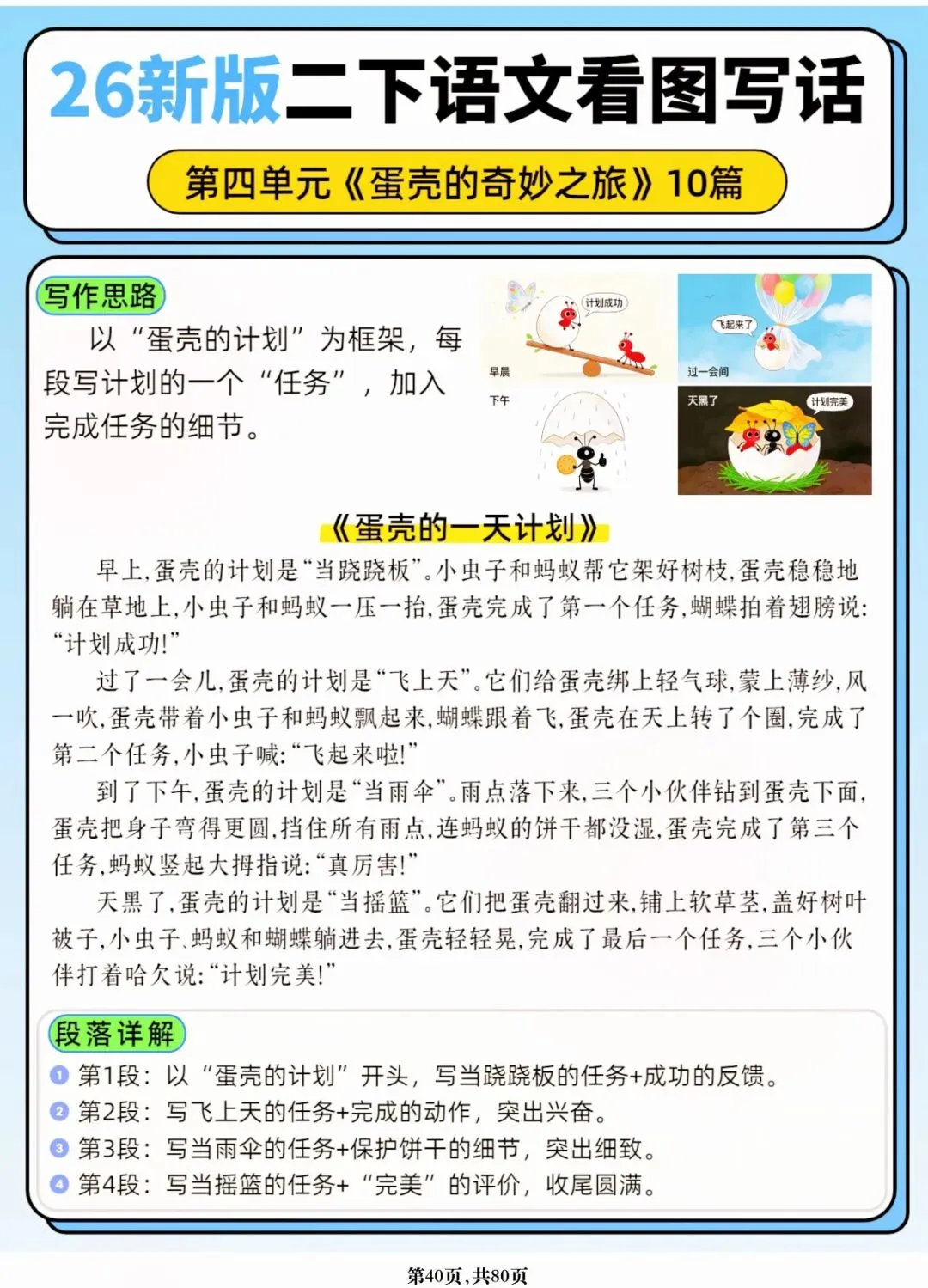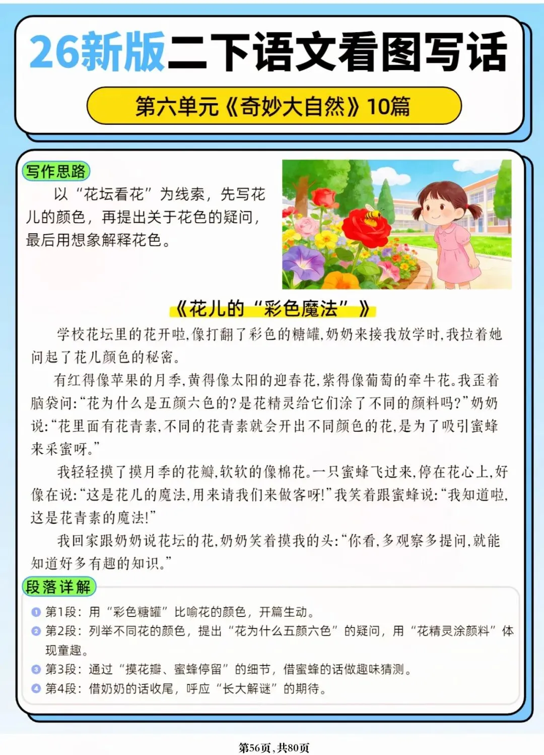 26年春人教版二年级下册语文1-8单元口语交际与写话范文,共80页,电子版可下载可打印,这份二下语文单元口语交际与写话范文,涵盖了注意说话的语气、我的好朋友、长大以后做什么、图书借阅公约、奇妙大自然、推荐一部动画片等单元的范文,帮助孩子积累丰富的写话素材,提升二年级的写话水平。二年级是表达的启蒙期,说得好才能写得好!