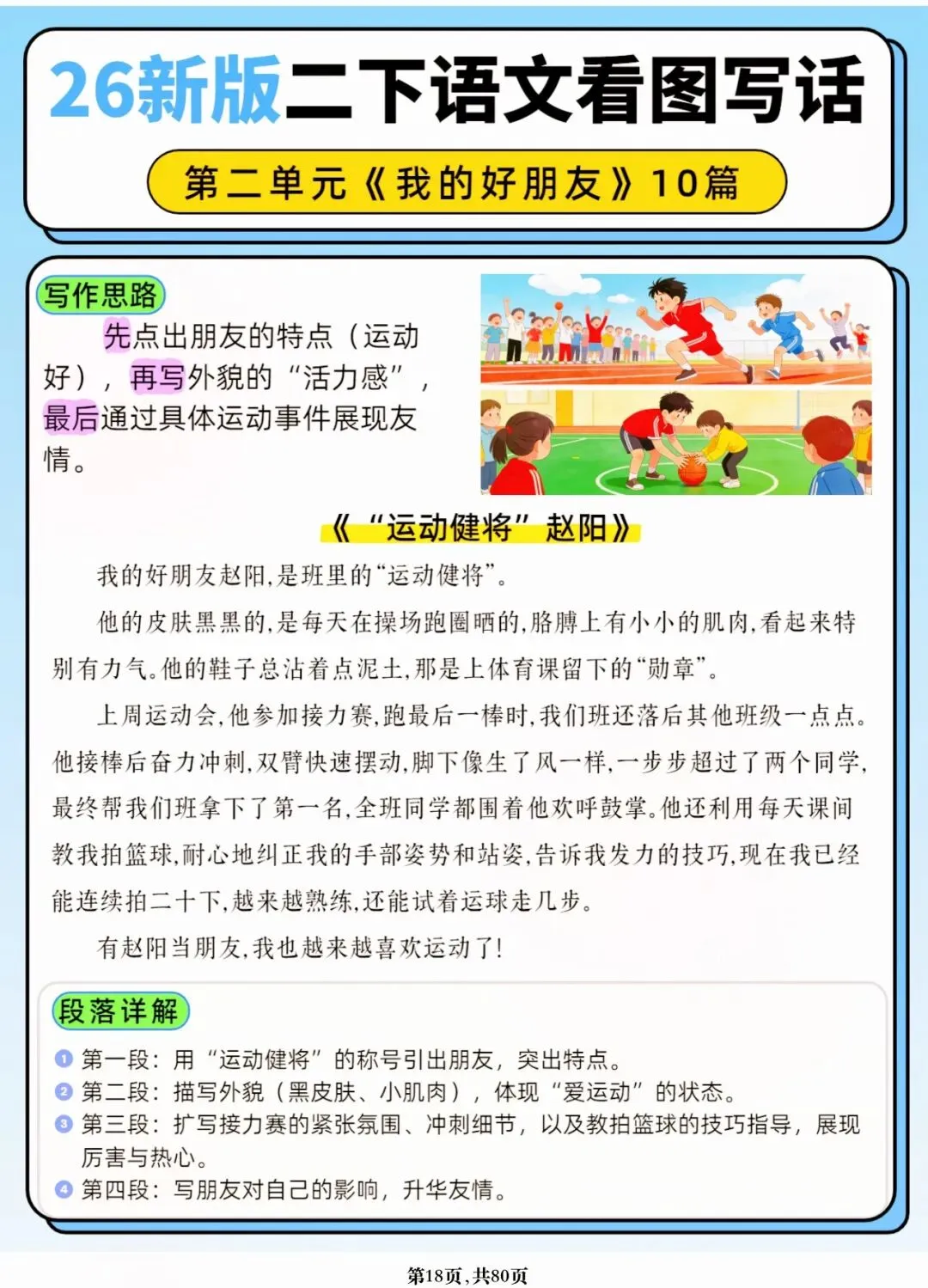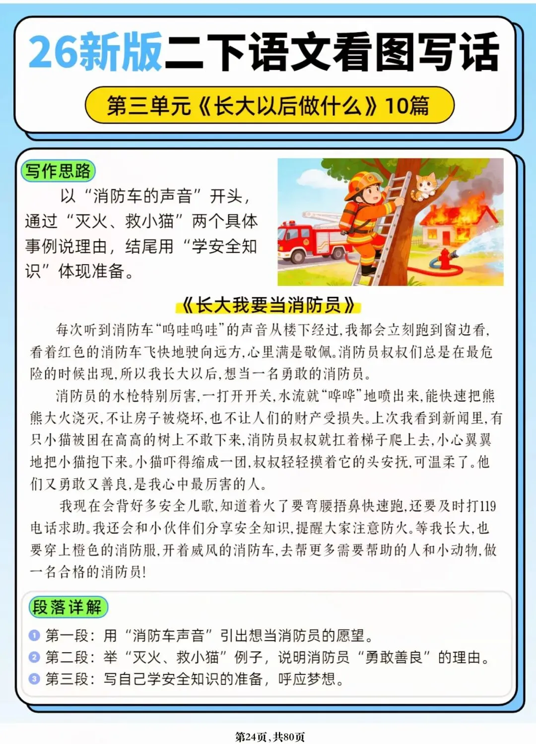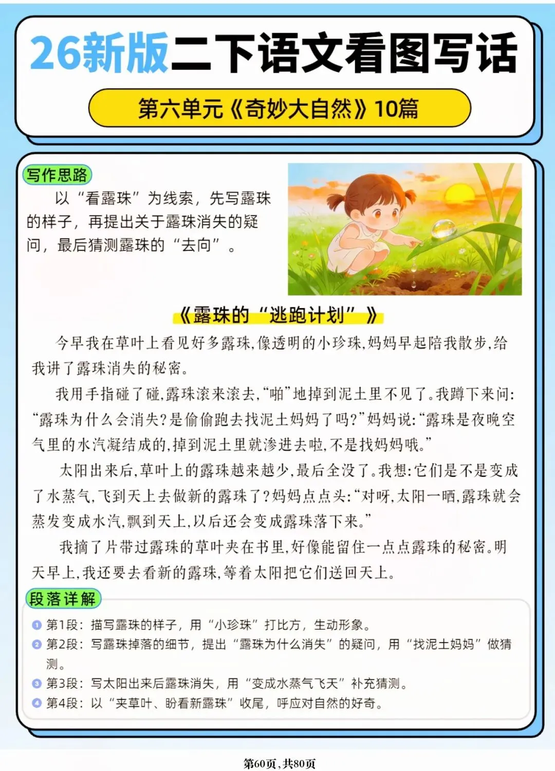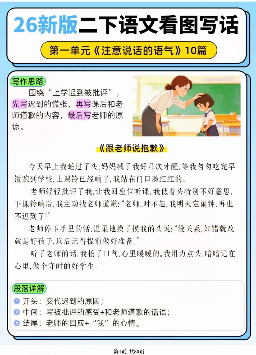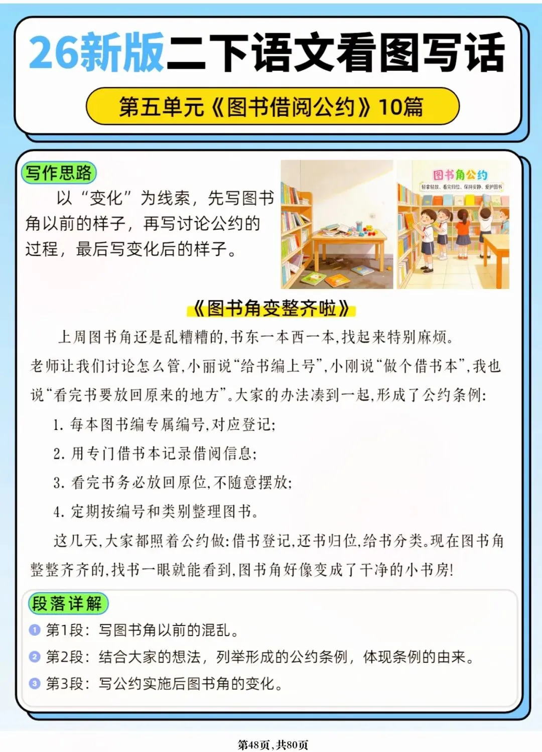 26年春人教版二年级下册语文1-8单元口语交际与写话范文,共80页,电子版可下载可打印,这份二下语文单元口语交际与写话范文,涵盖了注意说话的语气、我的好朋友、长大以后做什么、图书借阅公约、奇妙大自然、推荐一部动画片等单元的范文,帮助孩子积累丰富的写话素材,提升二年级的写话水平。二年级是表达的启蒙期,说得好才能写得好!