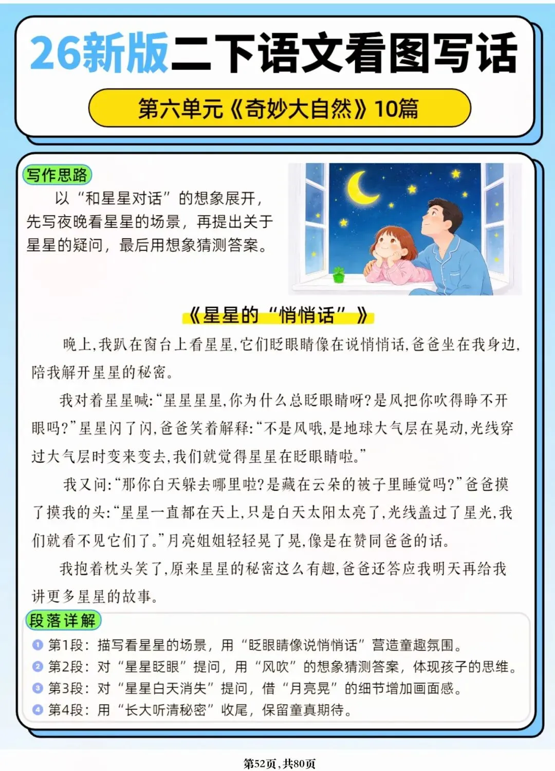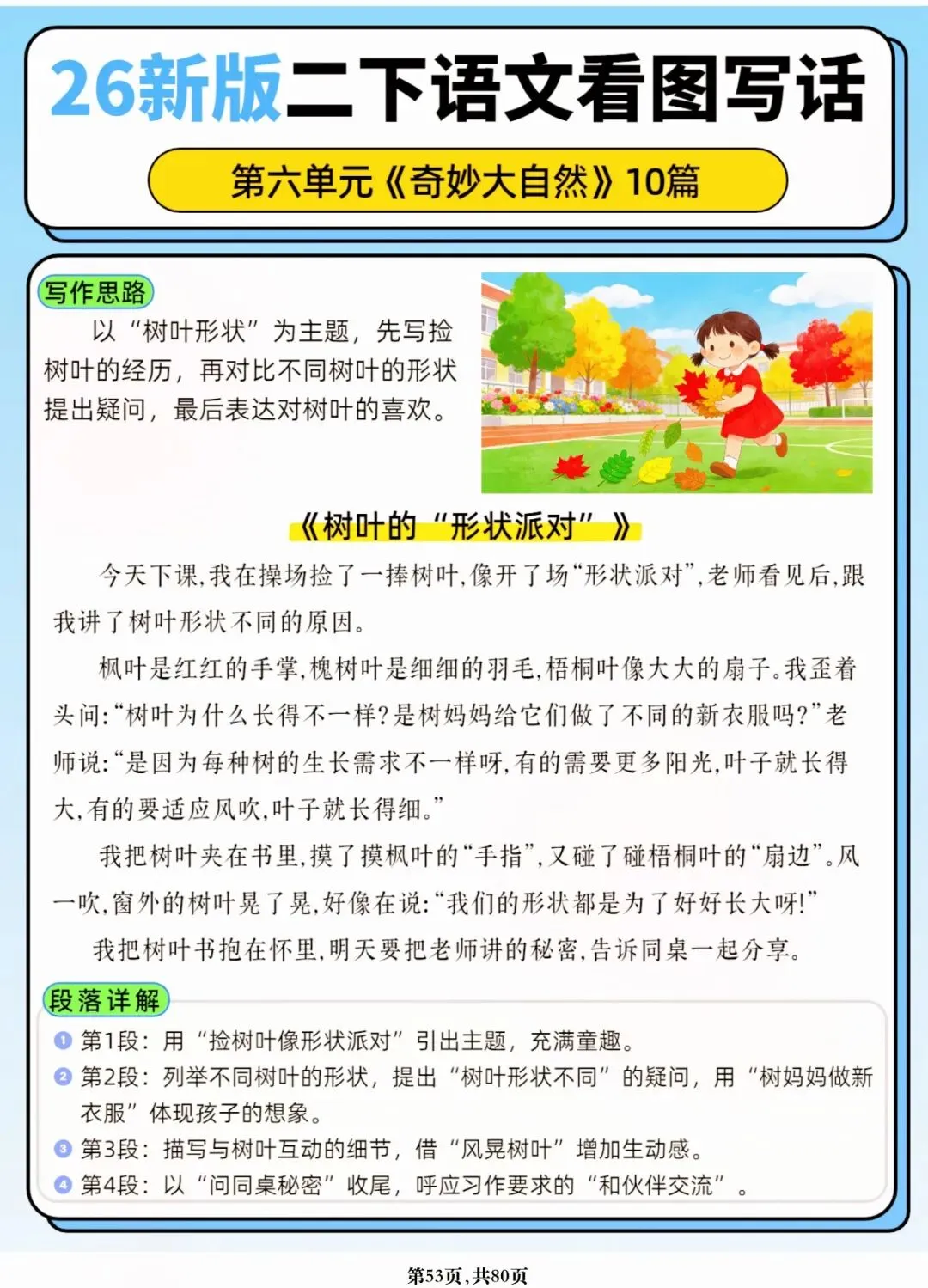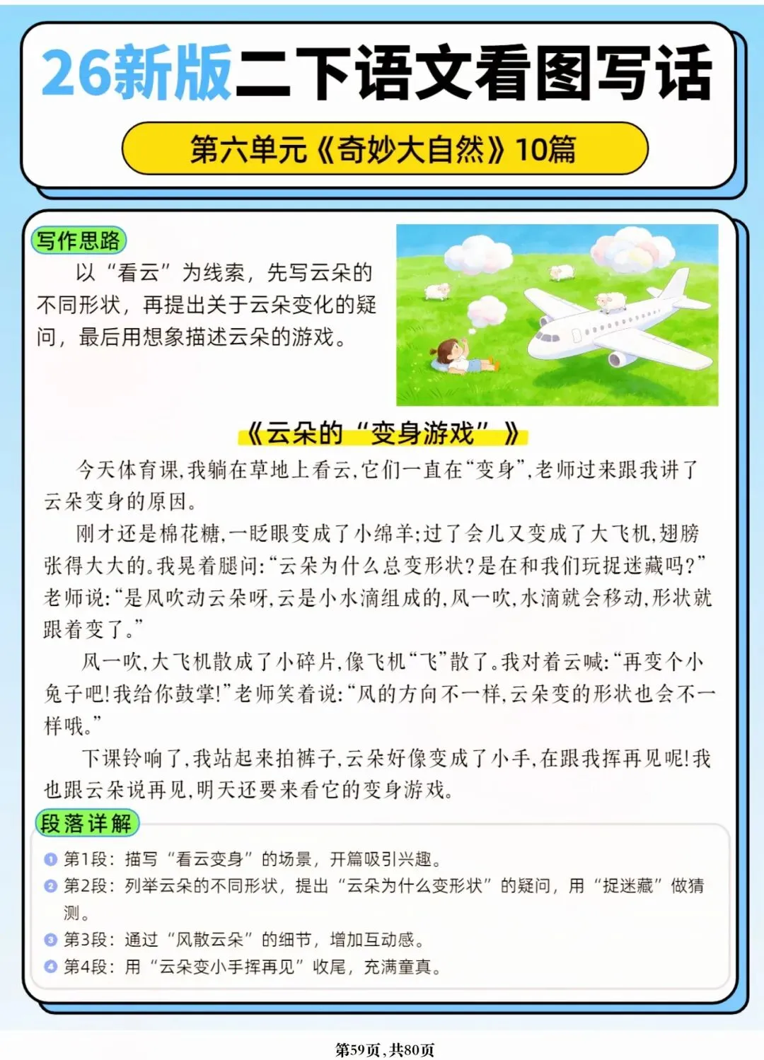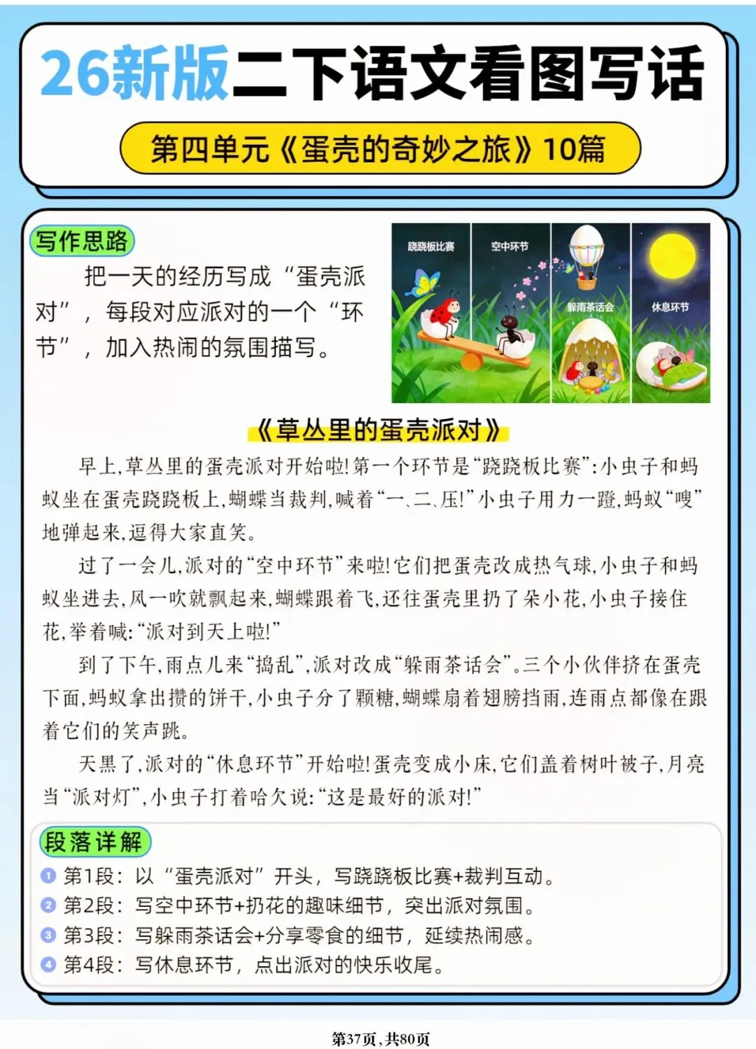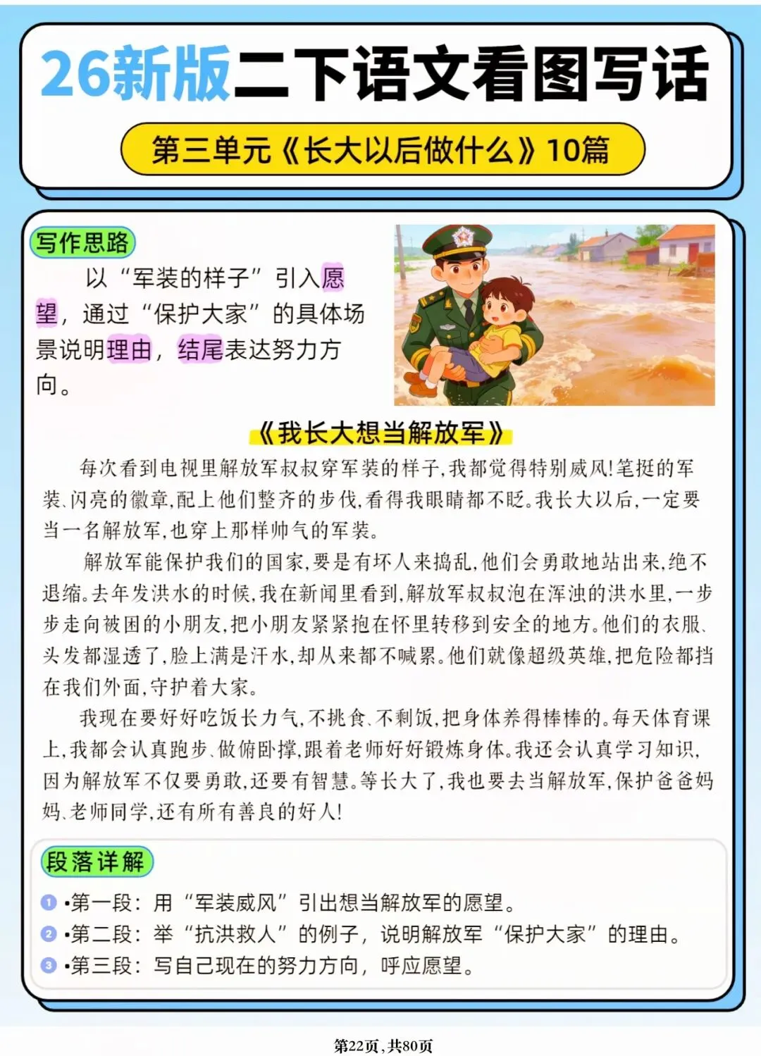 26年春人教版二年级下册语文1-8单元口语交际与写话范文,共80页,电子版可下载可打印,这份二下语文单元口语交际与写话范文,涵盖了注意说话的语气、我的好朋友、长大以后做什么、图书借阅公约、奇妙大自然、推荐一部动画片等单元的范文,帮助孩子积累丰富的写话素材,提升二年级的写话水平。二年级是表达的启蒙期,说得好才能写得好!