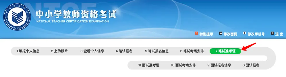 ❹点击【7.笔试准考证】,根据提示下载准考证文件(下载的文件为PDF格式)。