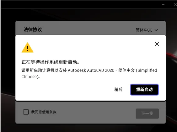 (正在等待操作系统重新启动。请重新启动计算机以安装Autodesk….)