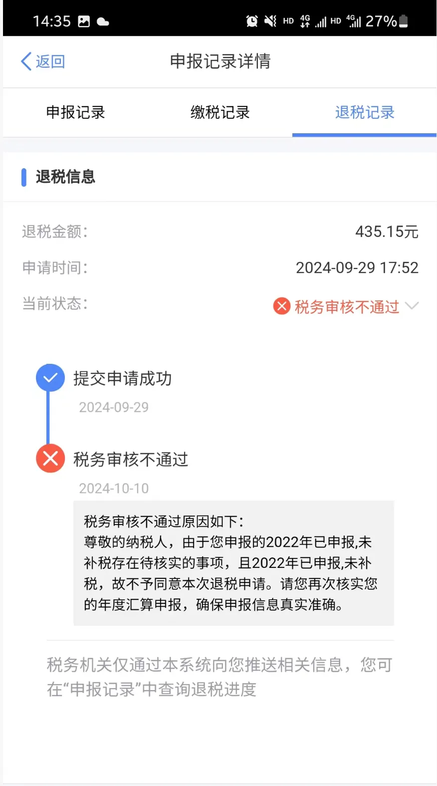 并且如果有往期补税没处理,你后期即使有退税,也不能进行操作,一定要等往期申报都成功,并且补税了,才可以操作后期的退税。