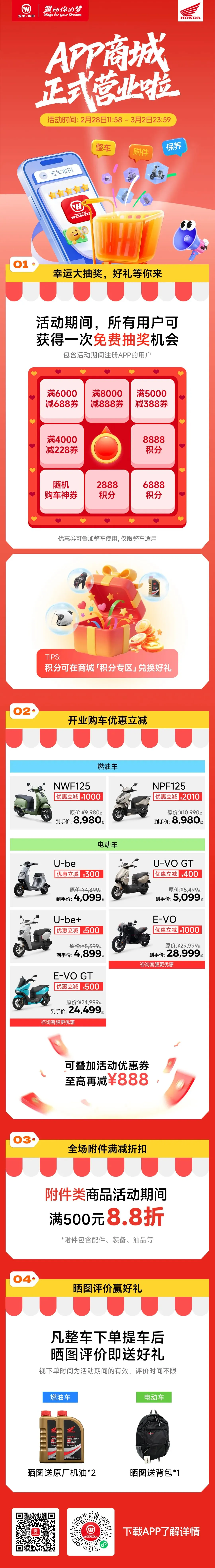 APP| 速戳!五羊本田APP商城盛大开业,超值优惠已就位 即刻试驾 正宗合资车 广汽高品质 五羊-本田 正宗本田 更高品质五羊-本田 更好犒赏自己 一步到位 买车就买五羊-本田 #分享文章到朋友圈# 让更多热爱摩托车的骑士看到~ 更多精彩 /视频号 点击扫描二维码关注 了解最新产品资讯 /抖音 点击扫描二维码关注 湖北五羊-本田官方抖音号
