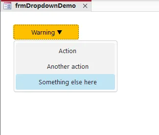 OptionCompare DatabaseOptionExplicitPrivate mMenuVisible AsBoolean' ── 菜单项标题 (修改这里即可自定义菜单内容) ──PrivateConst MENU_1 AsString = "Action"PrivateConst MENU_2 AsString = "Another action"PrivateConst MENU_3 AsString = "Something else here"' ── 布局 (twips, 1英寸 = 1440) ──PrivateConst MENU_WIDTH AsLong = 3200' 菜单宽度 (约5.6cm)PrivateConst ITEM_HEIGHT AsLong = 480' 菜单项高度PrivateConst PAD AsLong = 80' 面板内边距PrivateConst GAP AsLong = 30' 按钮与菜单间距'----------------------------------------------------' 窗体加载'----------------------------------------------------PrivateSub Form_Load()mMenuVisible = False' 设置菜单项标题 & 左对齐OnErrorResumeNextMe.btnItem1.Caption = " " & MENU_1Me.btnItem2.Caption = " " & MENU_2Me.btnItem3.Caption = " " & MENU_3' 面板不需要文字Me.btnPanel.Caption = ""Me.btnPanel.TabStop = FalseMe.btnItem1.TabStop = FalseMe.btnItem2.TabStop = FalseMe.btnItem3.TabStop = FalseOnErrorGoTo0' 隐藏菜单CloseMenuEndSub'============================================================' 打开 / 关闭菜单'============================================================PrivateSub btnDropdown_Click()If mMenuVisible ThenCloseMenuElseOpenMenuEndIfEndSubPrivateSub OpenMenu()Dim L AsLong, T AsLong, H AsLongL = Me.btnDropdown.LeftT = Me.btnDropdown.Top + Me.btnDropdown.Height + GAPH = 3 * ITEM_HEIGHT + PAD * 2' 显示面板WithMe.btnPanel.Left = L.Top = T.Width = MENU_WIDTH.Height = H.Visible = TrueEndWith' 放置菜单项PutItem Me.btnItem1, L, T, 0PutItem Me.btnItem2, L, T, 1PutItem Me.btnItem3, L, T, 2mMenuVisible = TrueMe.TimerInterval = 200EndSubPrivateSub PutItem(btn As CommandButton, L AsLong, T AsLong, idx AsInteger)With btn.Left = L + PAD.Top = T + PAD + idx * ITEM_HEIGHT.Width = MENU_WIDTH - PAD * 2.Height = ITEM_HEIGHT.Visible = TrueEndWithEndSubPrivateSub CloseMenu()OnErrorResumeNextMe.btnPanel.Visible = FalseMe.btnItem1.Visible = FalseMe.btnItem2.Visible = FalseMe.btnItem3.Visible = FalseOnErrorGoTo0mMenuVisible = FalseMe.TimerInterval = 0EndSub'============================================================' 菜单项点击 — ★ 在这里写你的业务逻辑 ★'============================================================PrivateSub btnItem1_Click()CloseMenuMsgBox "执行了: " & MENU_1, vbInformation, "Dropdown"EndSubPrivateSub btnItem2_Click()CloseMenuMsgBox "执行了: " & MENU_2, vbInformation, "Dropdown"EndSubPrivateSub btnItem3_Click()CloseMenuMsgBox "执行了: " & MENU_3, vbInformation, "Dropdown"EndSub'============================================================' 自动关闭: 定时器 + 点击空白处'============================================================PrivateSub Form_Timer()IfNot mMenuVisible ThenMe.TimerInterval = 0ExitSubEndIfDim s AsStringOnErrorResumeNexts = Me.ActiveControl.NameOnErrorGoTo0SelectCase sCase"btnDropdown", "btnPanel", "btnItem1", "btnItem2", "btnItem3"' 焦点仍在菜单区域CaseElseCloseMenuEndSelectEndSubPrivateSub Detail_Click()If mMenuVisible Then CloseMenuEndSub