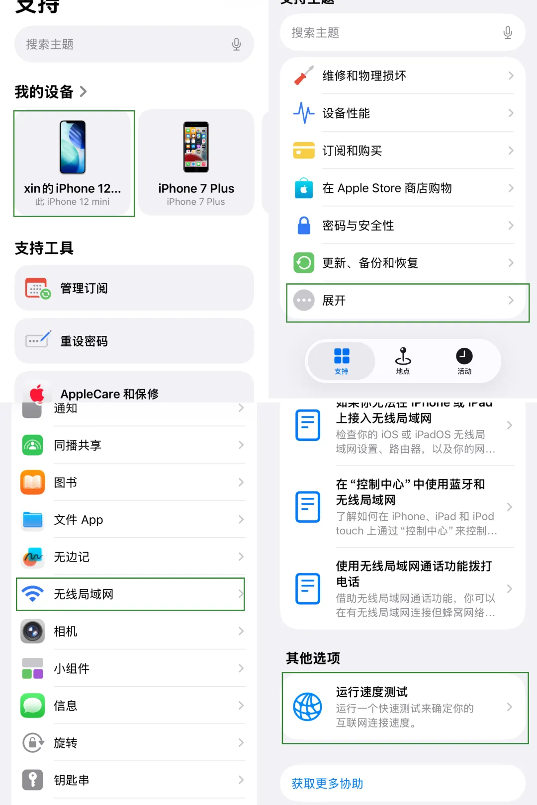 第一步:打开手机里的「Apple 支持」APP,就是那个蓝色图标的官方应用,找不到的宝子可以去桌面搜索,像找二次元老婆的周边一样认真找哦(✧∇✧)ノ 第二步:点击页面里你的iPhone设备条目,比如“iPhone 12 Mini”,点进去就对啦!第三步:找到“展开”,下滑找到「无线局域网」分类,别划太快,不然会错过哦😝 第四步:在「其他选项」栏里,就能看到“运行速度测试”的入口,点它点它点它!