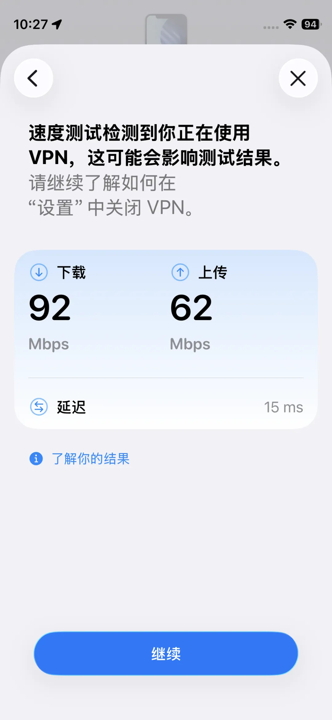 这里要敲黑板啦📢 测WiFi和测5G/4G的方法不一样哦!测WiFi的话,提前连好目标WiFi就行;测蜂窝网络的话,先在控制中心关掉WiFi,再进入测速入口,不然会测错哒~ 点击“继续”,同意相关条款,手机就会自动连接苹果官方服务器,开始测速啦,全程只要几秒钟,比你找二次元表情包还快(°∀°)ノ