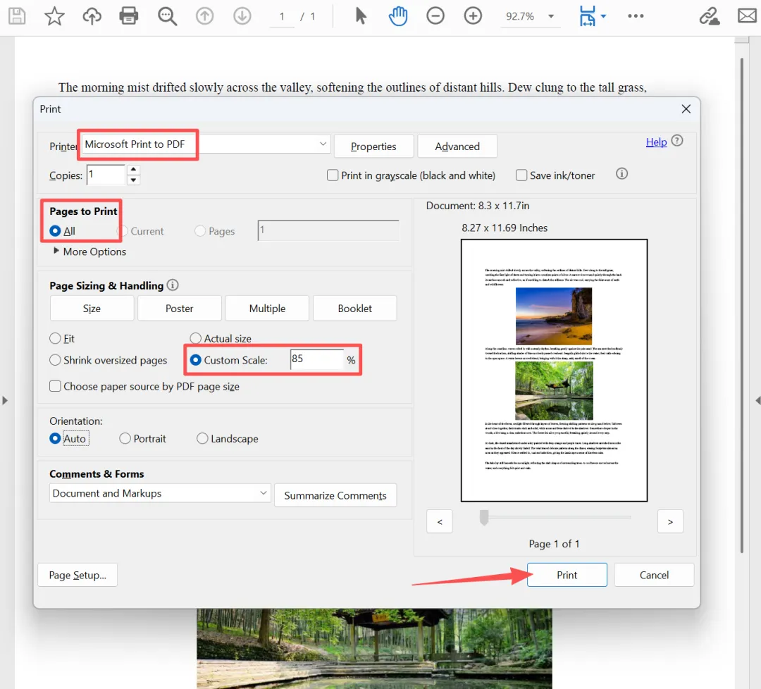 2、在打印窗口中,打印机选择「Microsoft Print to PDF」。在调整页面大小和处理页面这里,选择「自定义比例」,设置为90%或者85%都可以,右侧可以预览效果,随时调整。