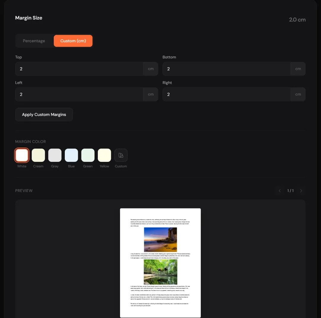 可以自定义页边距大小,并且屏幕下方可以实时预览调整效果,更方便用户使用。