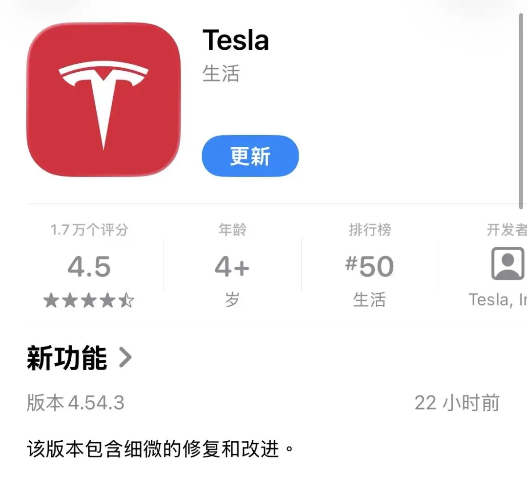 昨日,Tesla App 悄悄推送了 4.54.3 版本。App Store 更新记录只有一句:该版本包含细微的修复和改进
