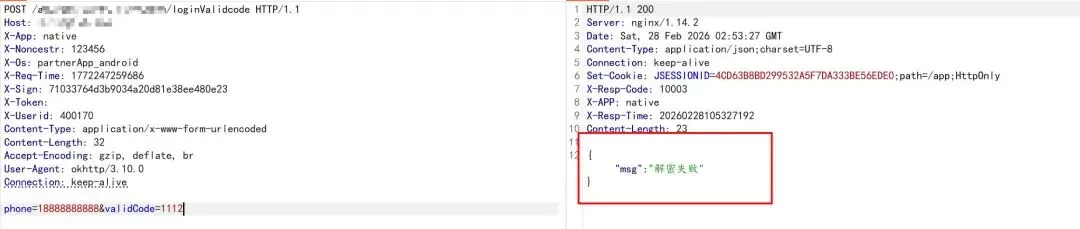 抓取登录时发送验证码的数据包,尝试修改验证码字段并重放,服务器直接返回了 {"msg":"解密失败"}。