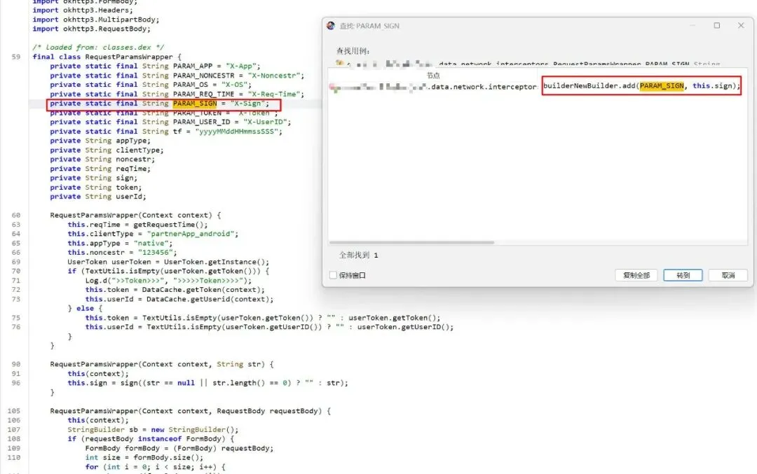 将APP脱壳并反编译后,我们直接全局搜索关键字 "X-Sign"。