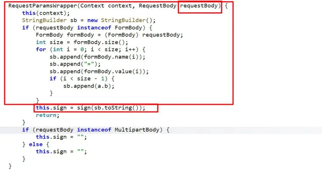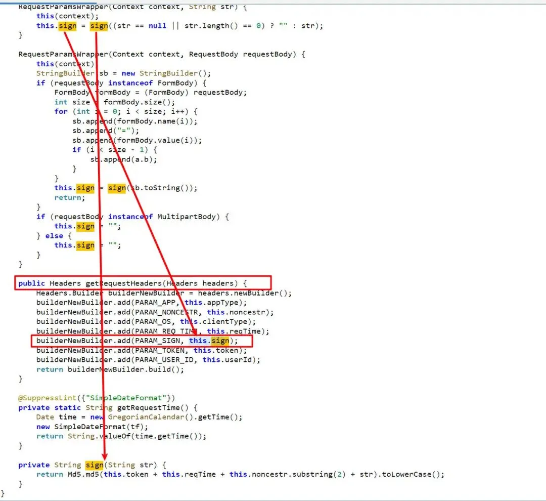 很快就锁定了目标类。跟进查看调用逻辑,发现在 RequestParamsWrapper 类中,程序使用了 builderNewBuilder.add(PARAM_SIGN, this.sign) 方法将 sign 的值赋到了请求头中。这与我们在抓包时看到的位置完美吻合!