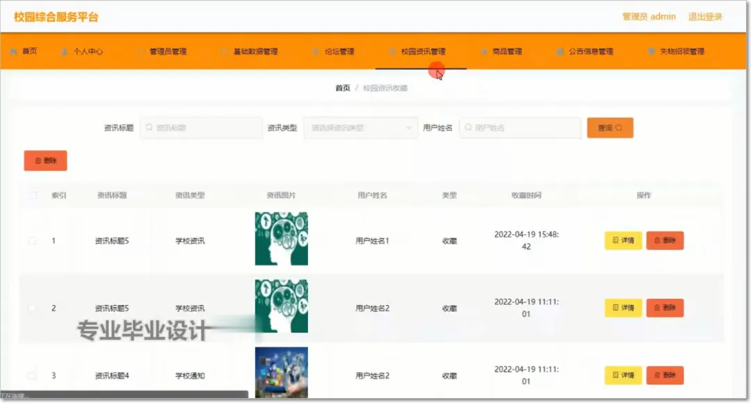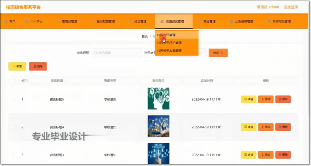校园综合服务平台使用Java语言进行编码,使用Mysql创建数据表保存本系统产生的数据。系统可以提供信息显示和相应服务,其管理员校园综合服务平台信息,查看校园综合服务平台信息,管理校园综合服务平台信息。