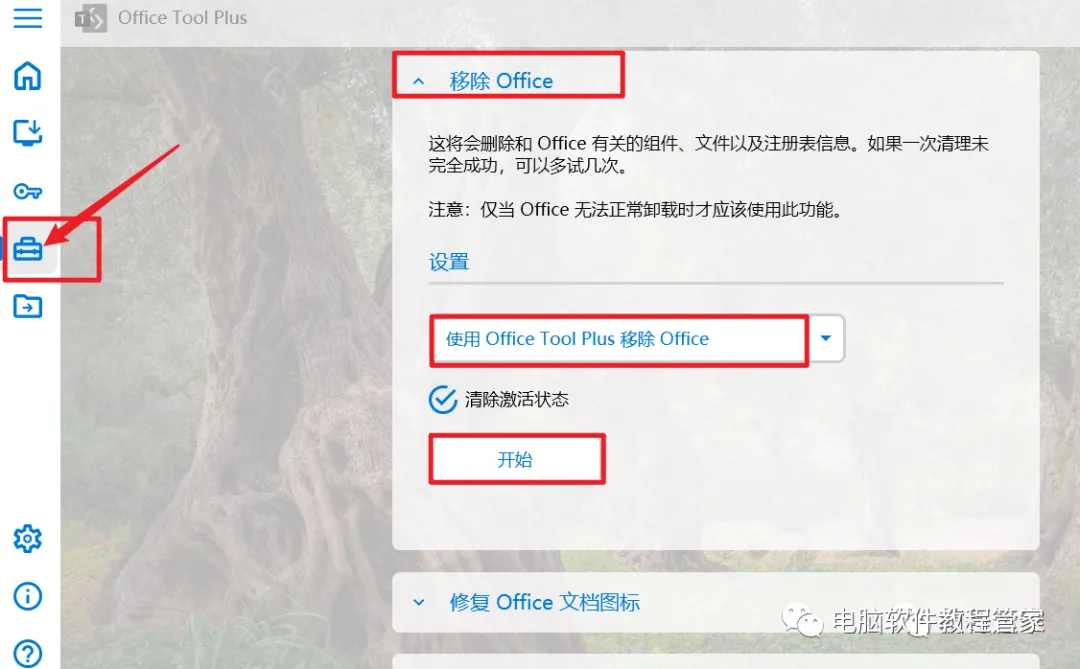 依次点击工具箱→移除office→开始,等待提示“移除office结束”即可。