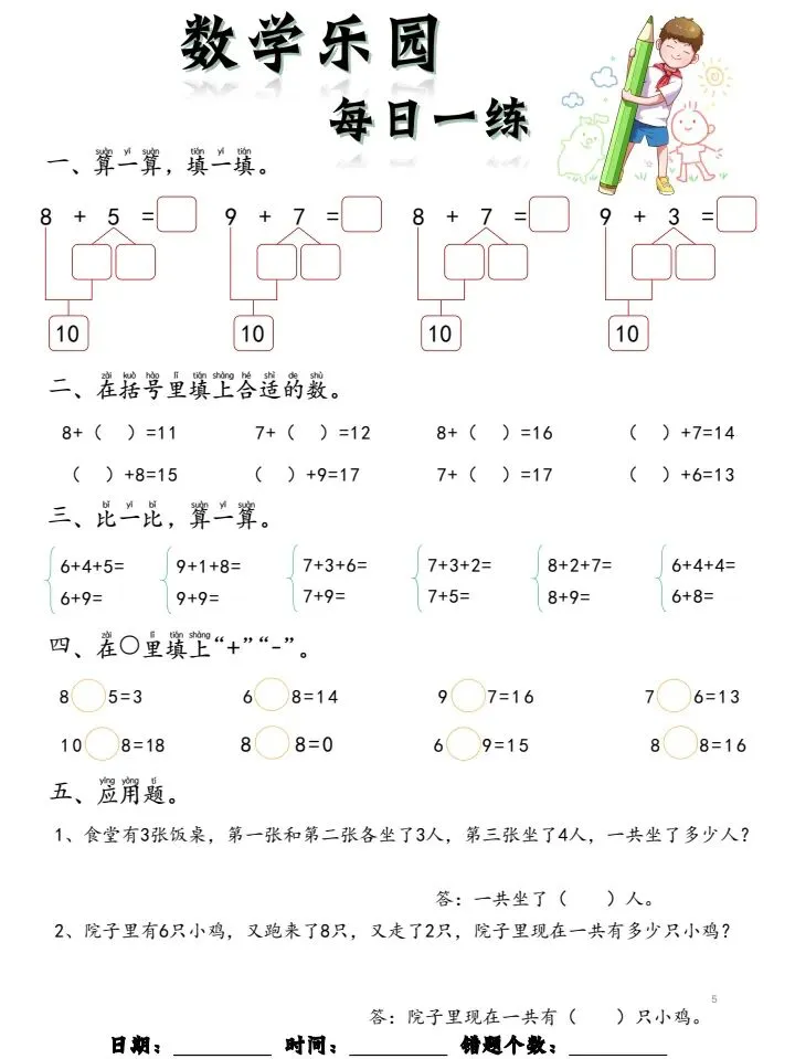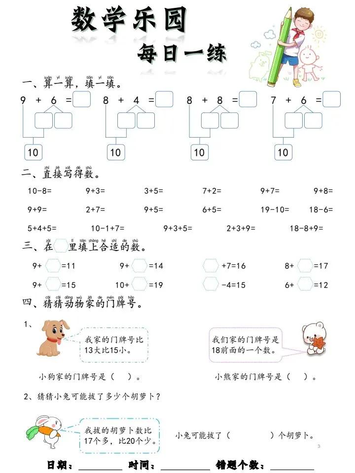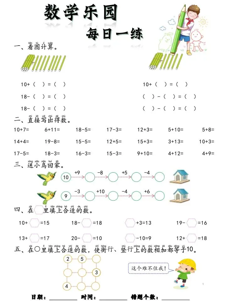 ♥️这套练习题堪称“数学小百科”,从比较大小、数与量认知,到凑十法、破十法精讲,再到列式计算、口算特训、规律探索,全方位覆盖一年级数学核心知识点。