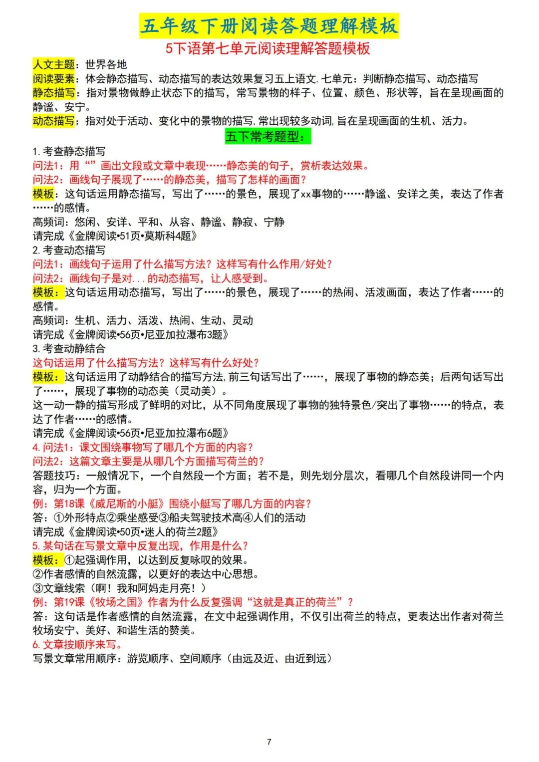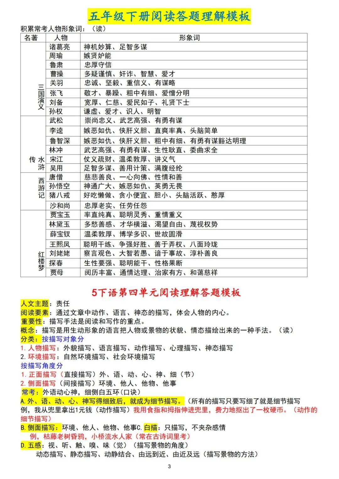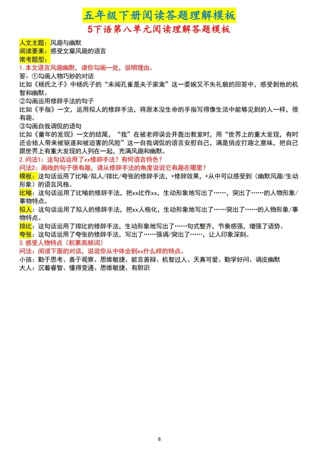 26春五年级下册人教部编版【语文阅读理解答题模板】|完整电子版可打印