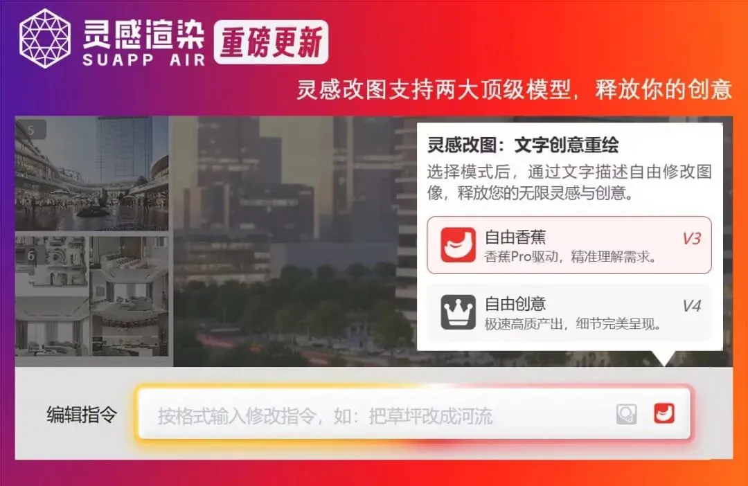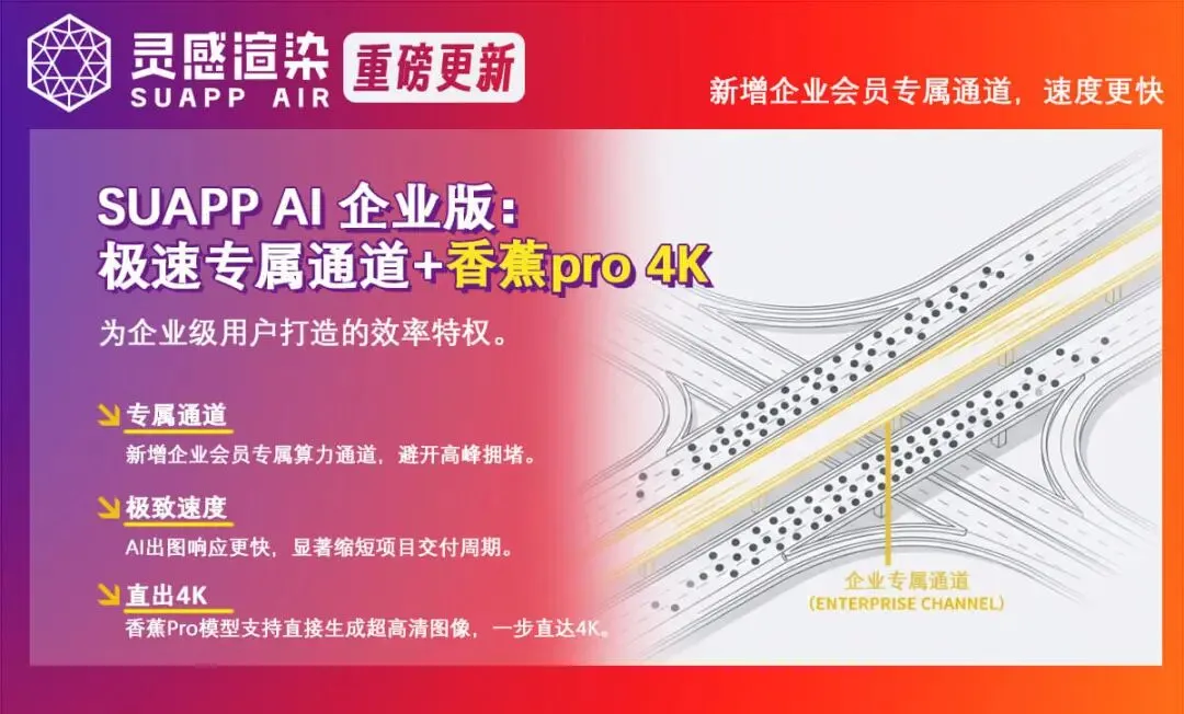 26年年初,SUAPP灵感渲染迎来史诗级更新!香蕉图Pro + 灵犀V2自研模型,构成SUAPP AI工作流的完整技术底座。
