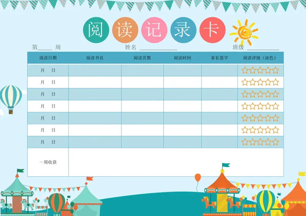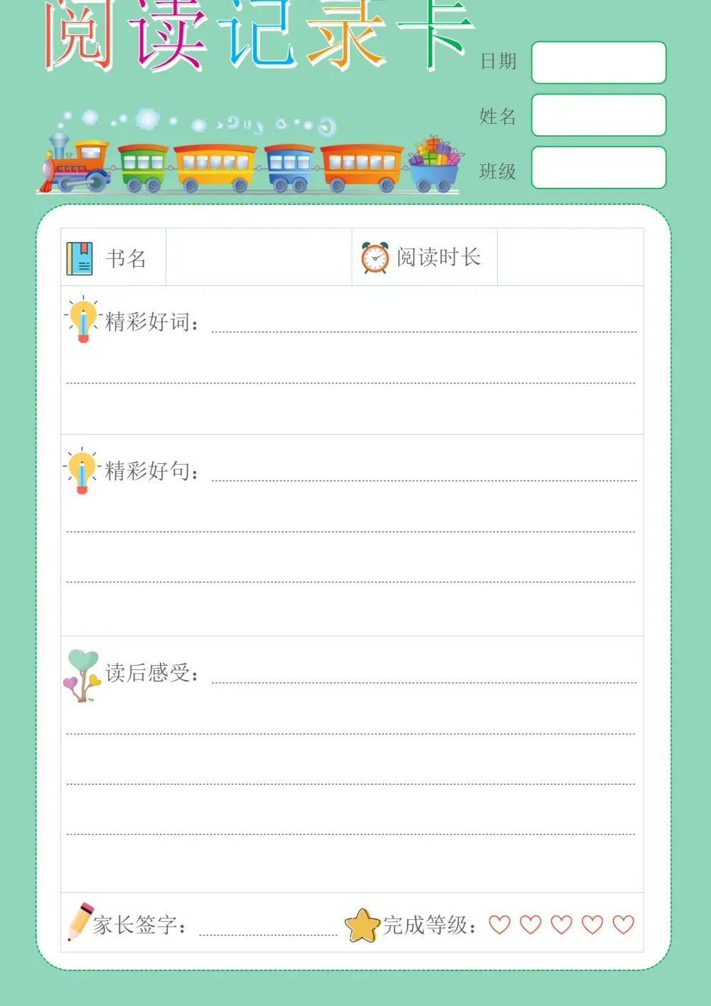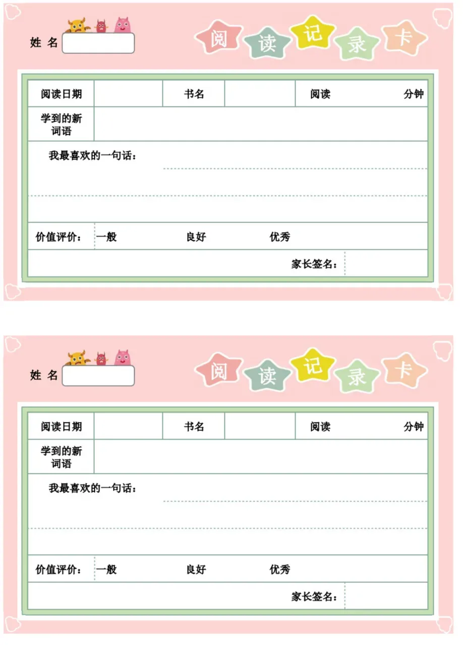 阅读记录卡 ★长按图片保存,就可以打印啦! 彩色低年级版