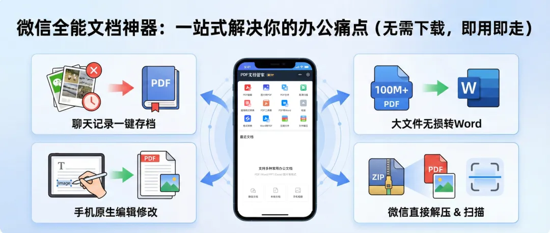 其实,真正的高效打工人,早就把这些繁杂的工具做减法了。今天给大家深度测评一款隐藏在微信里的全能文档处理工具——PDF文档管家小程序。它不需要下载安装,却集合了修改、转换、扫描、压缩四大核心能力,堪称“手机里的办公全能王”。