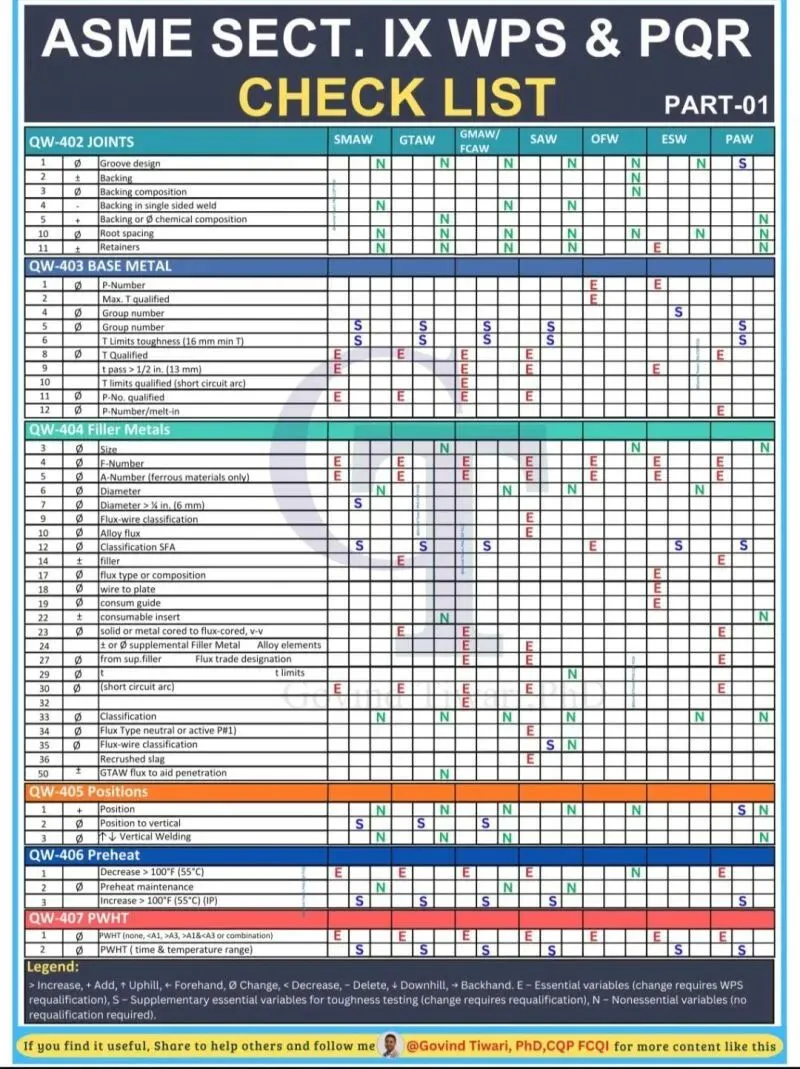 ASME Section IX – WPS & PQR Checklist (Part 01) | QW-402 to QW-407