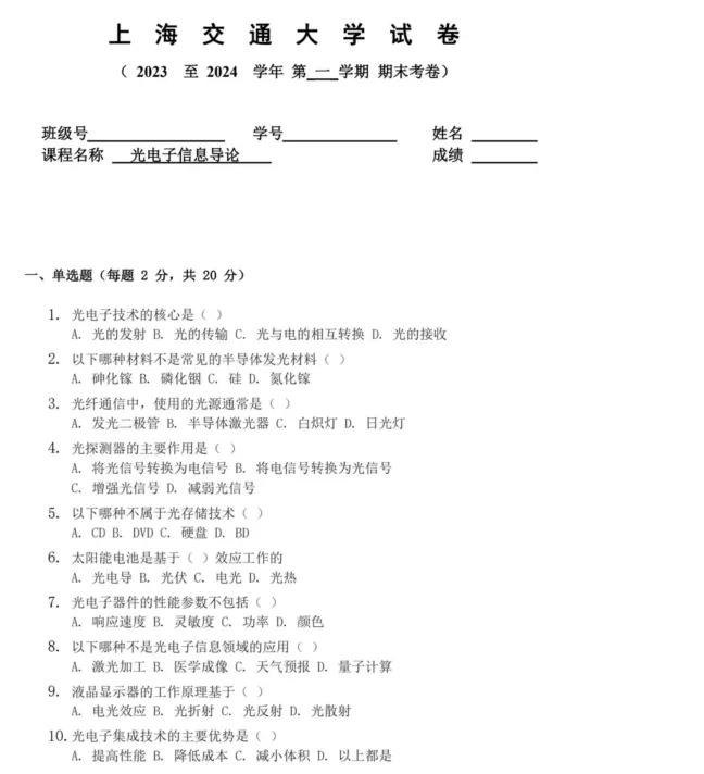 上海交通大学光电子信息导论期末试题,可打印 获取更多考研资料可加小编QQ:3542263029或者v信kyzlfx 先点“赞+在看”联系客服即可免费赠送公共课(政治英语数学)资料 其他院校陆续更新中…….有需要联系客服留言即可 更多真题资料会第一时间为大家推送 还有其他年份,可联系客服详询 01 部分截图如下🔥 温馨服务 免责申明:资料整理于网络如有侵权请告知删除 长按并识别下方二维码关注公众号,不定时发放考研福利哦 扫一扫添加微信好友,获取更多考研信息哦~
