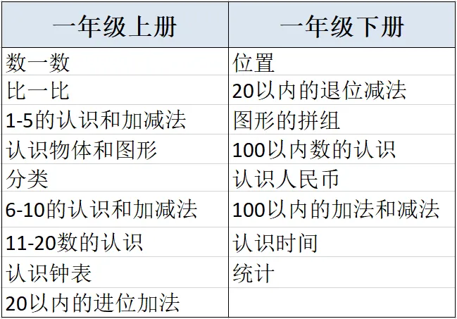 再来看看它的内容,根据人教版小学数学大纲,一年级课本需要掌握的知识点: