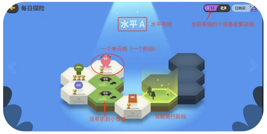 今日探险是根据孩子当前的水平等级来匹配的,也是孩子每天需要解锁完成的。