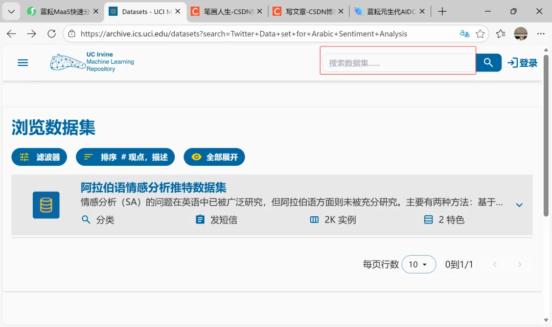 首先我们需要访问官网UCI数据集官网获取你自己所想要的数据,里边几乎都有。然后我们在搜索框输入:sentiment analysis或 product reviews;在这里搜索数据集会出现对应的相关数据(已脱敏可以直接套用拿来测试)
